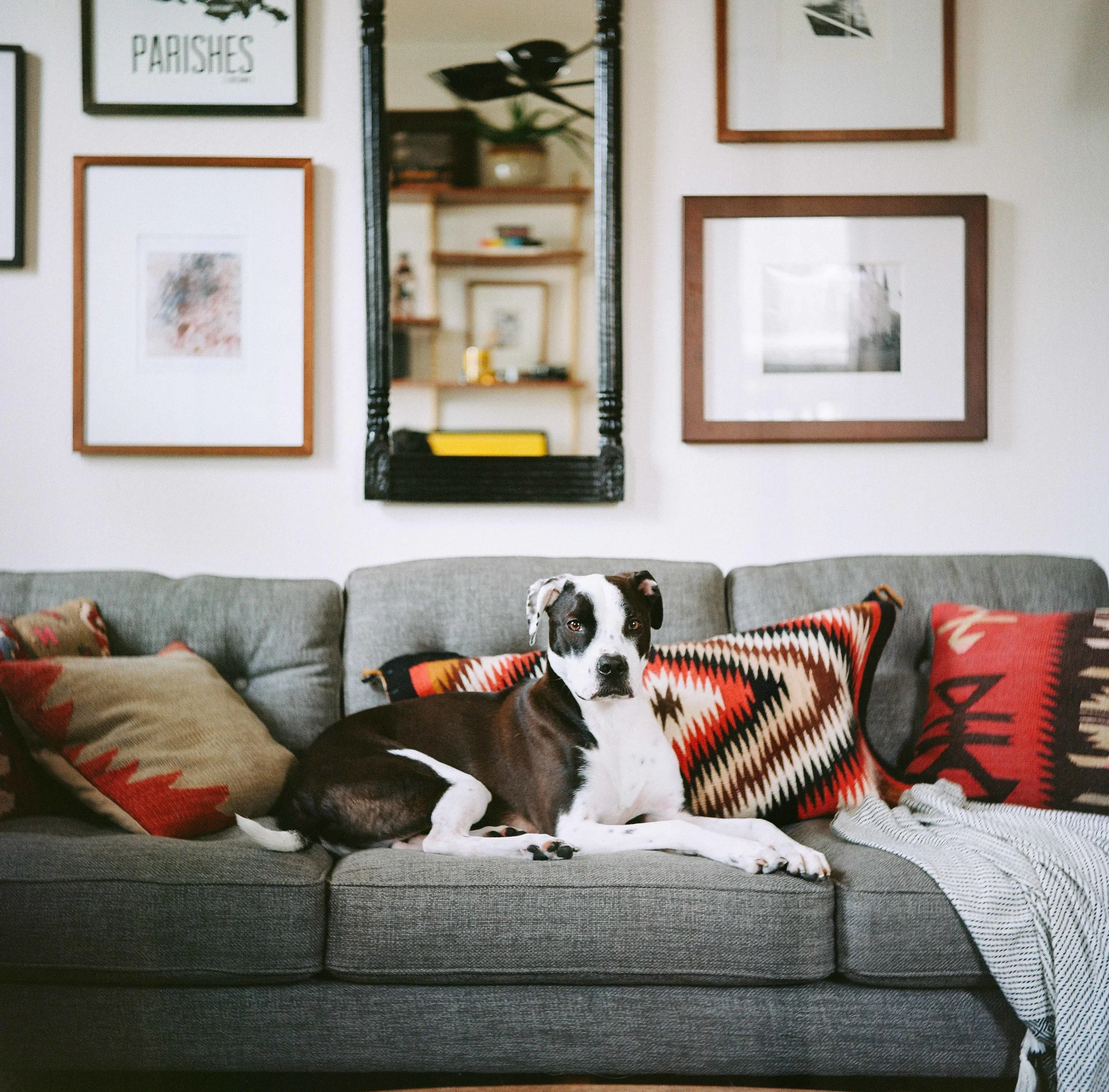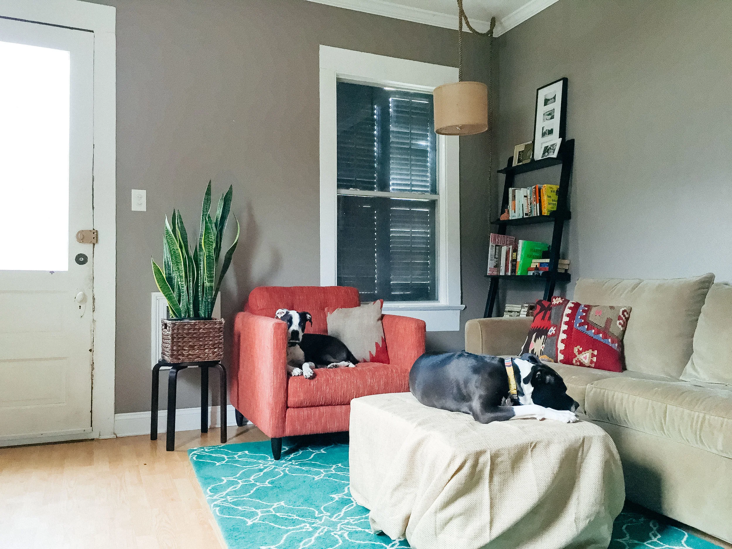 Here's the room with just new furniture in it. Is this what minimal looks like? Should I have stopped there? Or is this boring? Because both Luigi and Sterling just gave a big ol' yawn. Much happier pups now with plants, art, and pretty much life. Many people are afraid of filling up a small space with things but sometimes the more you add the cozier and bigger it feels.