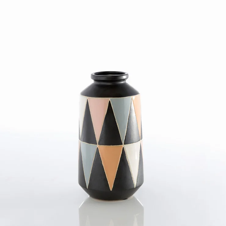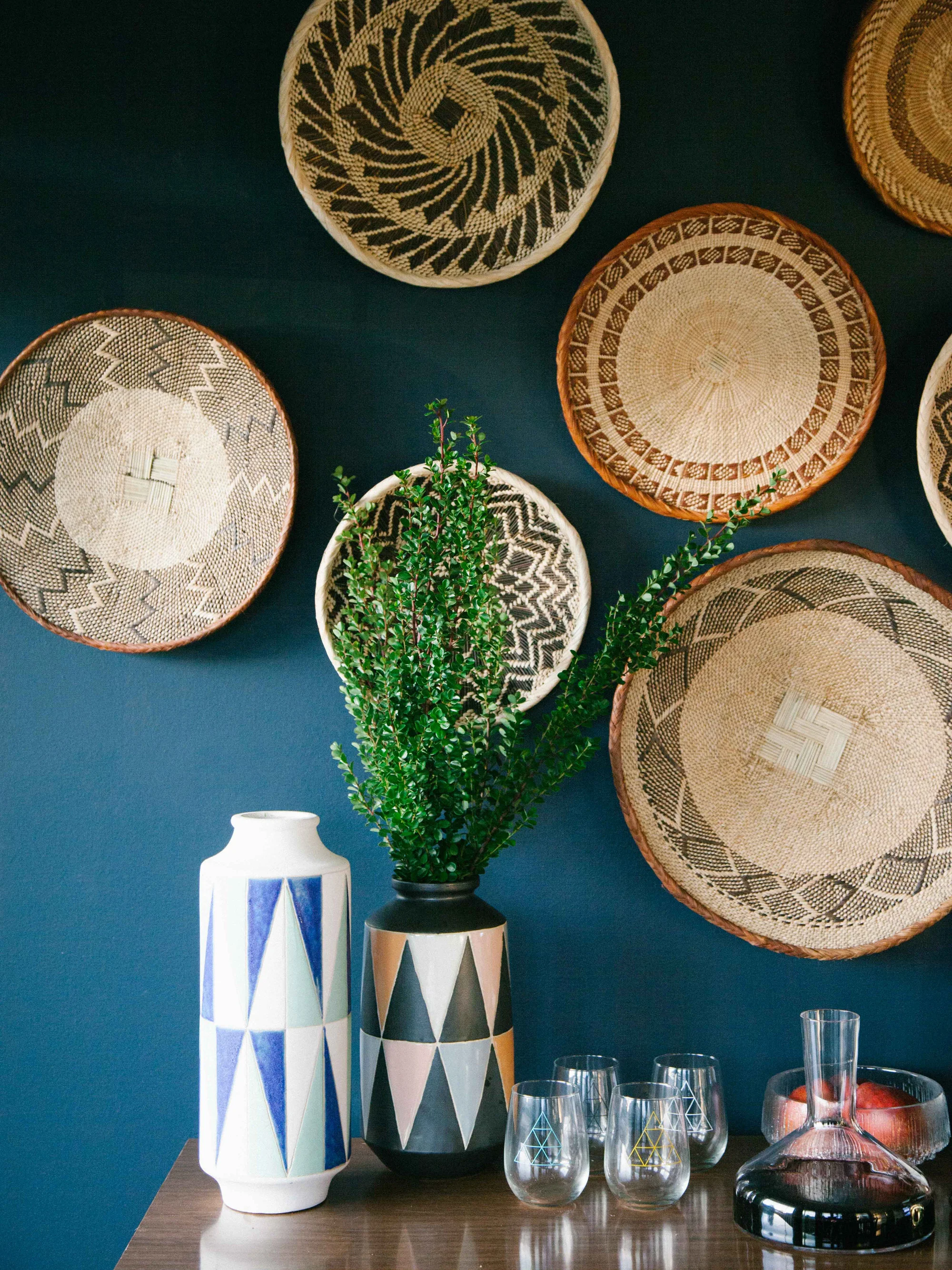 For the sideboard, I picked out two geometric vases by Shiraleah to keep it fun and stylish. I was surprised how big they were when they arrived. Such a good price for their size! I hung up African geometric baskets to add some texture and an earthy vibe. It's the holidays so bust out wine decanters. Gotta get a little fancy and let the wine breathe, you know?! Ha. And there you have it! Happy holidays everyone!