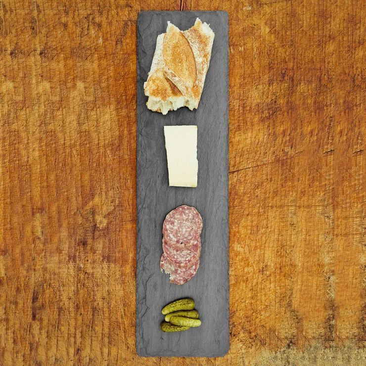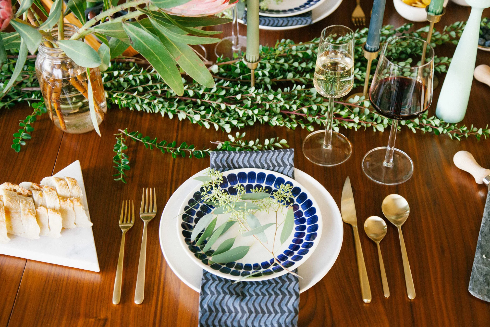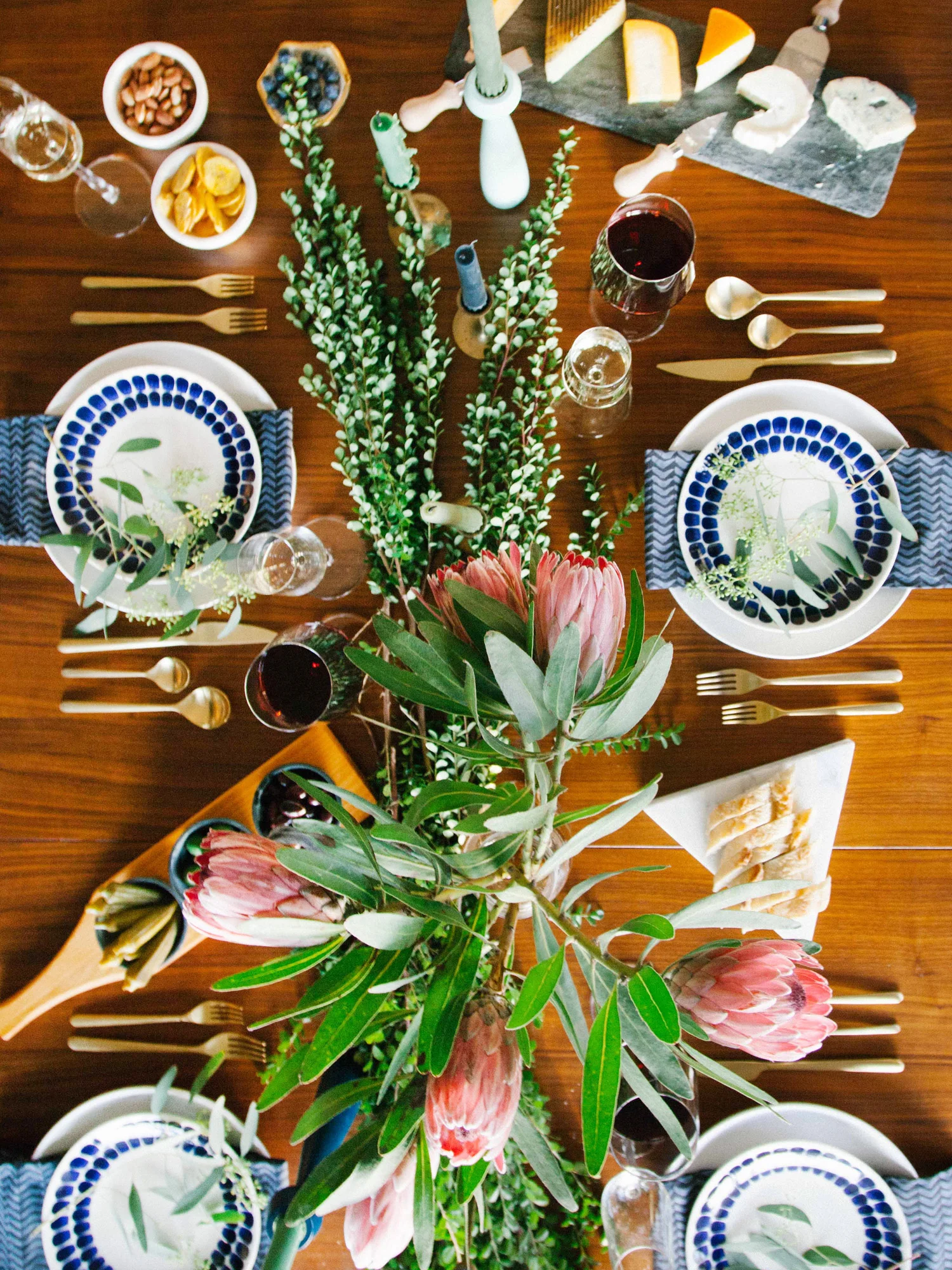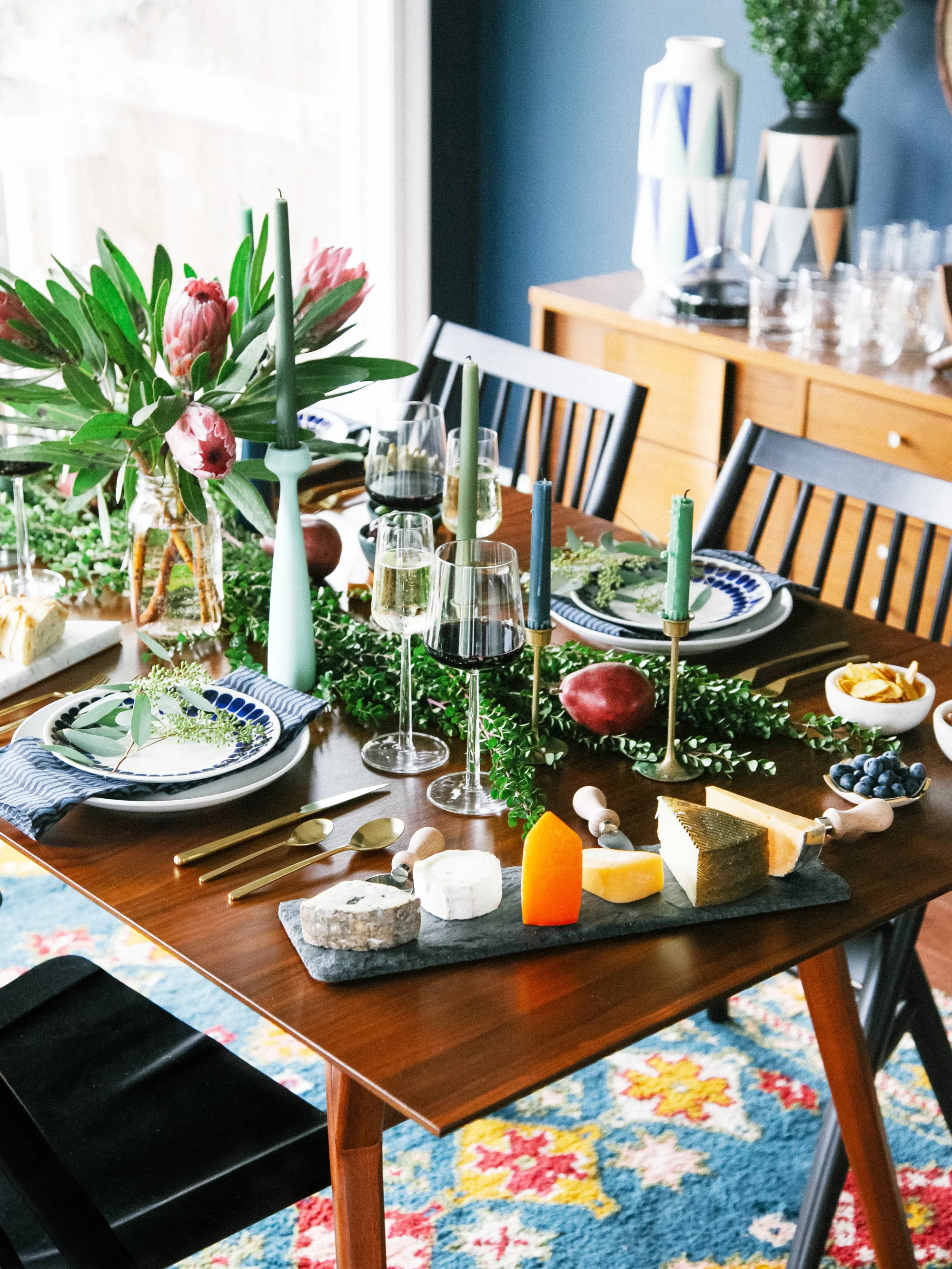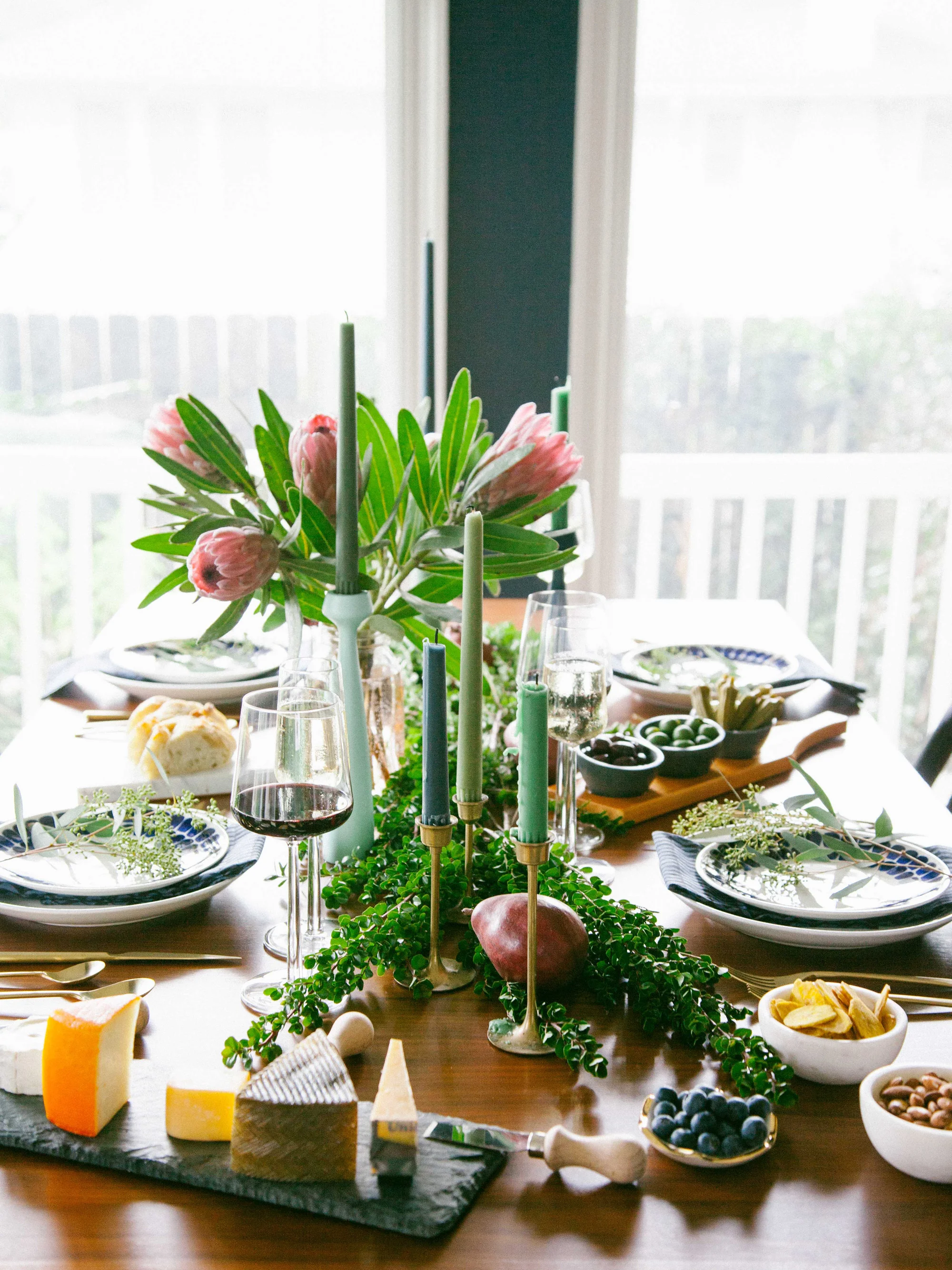 Bring in a hint of fall/winter and the holiday season by dressing the table with botanicals, like boxwoods, eucalyptus, protea and anjou pears. It's festive without being too literal. I also have a thing with cheese boards. Here, I picked out six types of cheeses ranging from hard to mild and I paired it with small nibbles like olives and pickled okra, banana chips in marble bowls and blueberries in a hexagon dish. And don't forget to weave in some tapered candles into your tablescape!