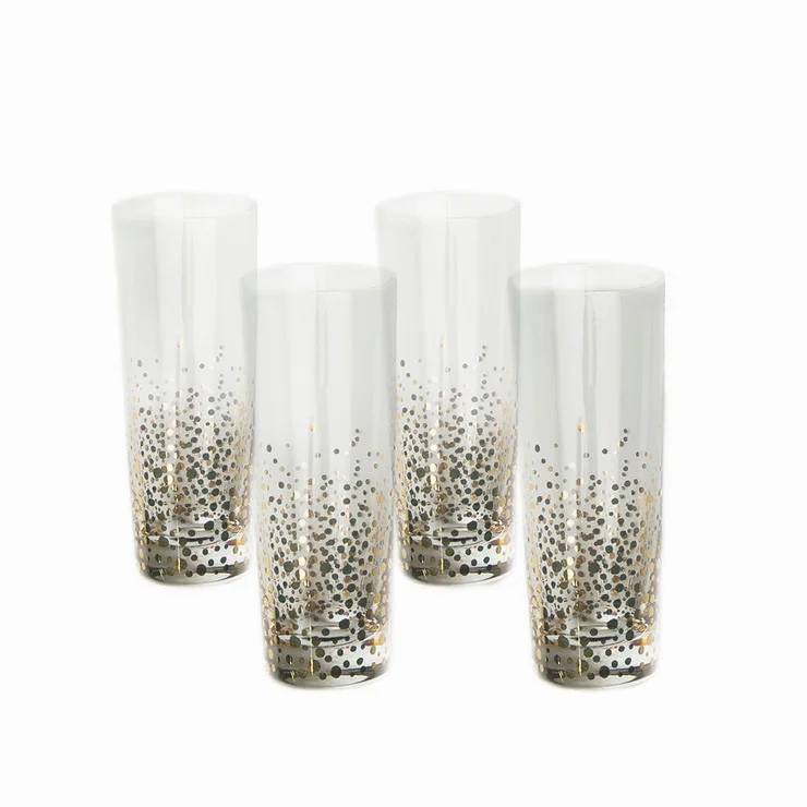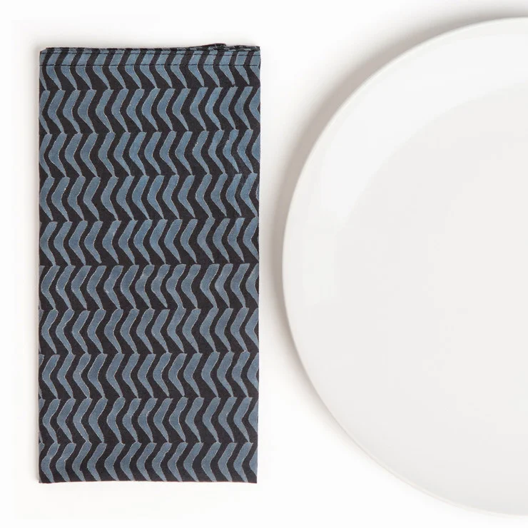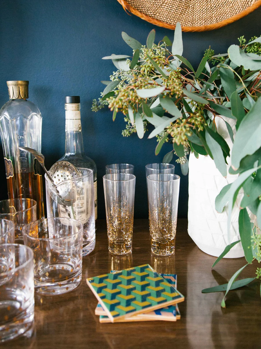 On the table, I'm bringing in navy from the walls and the Moroccan rug with these blue plates, layered with navy napkins underneath them. To add some fanciness, I chose gold flatware. These have the perfect weight and feels so good in your hands. I like to include champagne and wine glasses because we'll indubitably start off celebrating with bubbles, then end the night with either sauvignon blanc or malbec. The shape and feel of these glasses by Iittala are elegant without being too fragile and delicate to use.