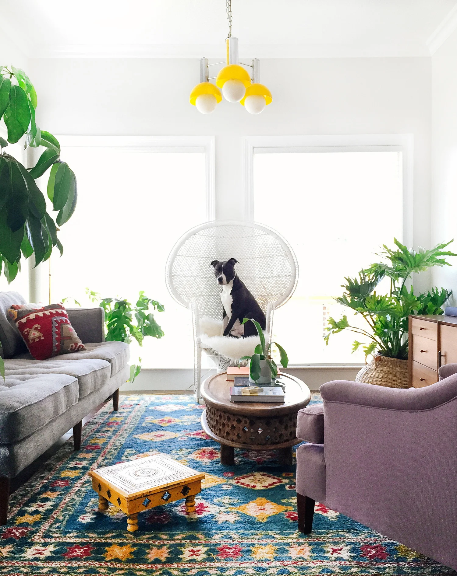 I was a little hesitant about getting it at first because this is not what I had in mind for any of the rooms. But when you're decorating on a budget, you know, beggars can't be choosers. Besides, I couldn't say no that yummy yolky color. It needs a little makeover. Probably a touch of gold paint. I get very excited about lighting so I installed it immediately when I got home, and I wanted to test it out. Surprisingly, the bulbs that came with it they still works! It reminds me a little of the Verner Panton Flowerpot lamp which I love. I don't think it's vibing in the jungalow room but it's the only room that's photographable right now. Here's what this room looked like before. Sterling likes the new light, I think.