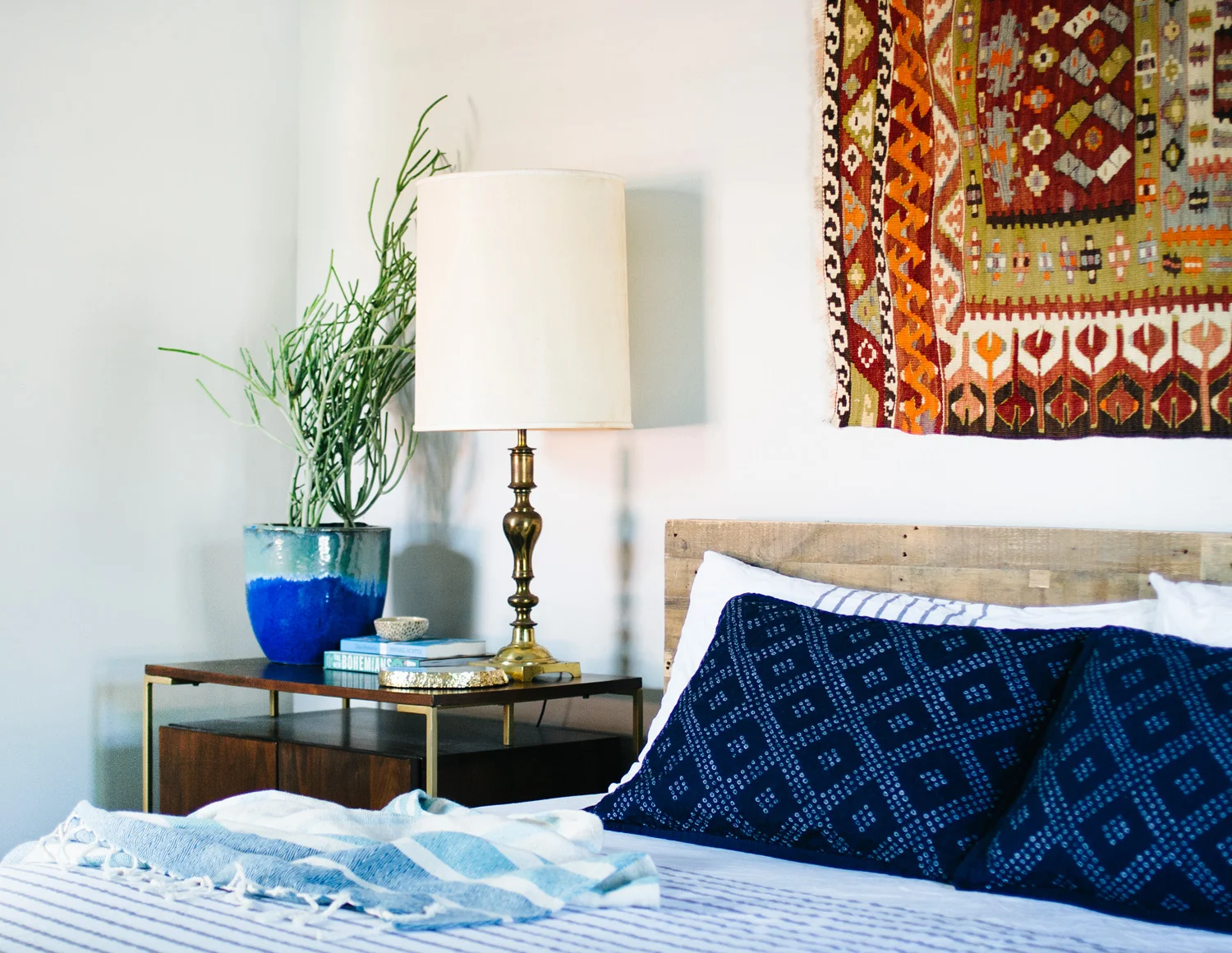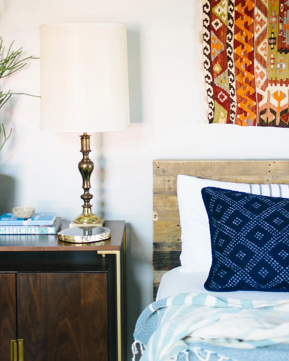 Our guest bedroom was getting way more love than ours so I finally dabbed it up a bit. It's looking more lived in now. I moved the bar cabinet to the bedroom because that's how you do a nightcap, am I right? Just reach on over for a whiskey neat. The rug on the wall is temporary. I definitely want lots of art framed instead. The new duvet cover is from h&m. I can't seem to find it one online but here's a similar one. We had grey linen ones before but I wanted something lighter for summer. Shibori pillow covers from Target. And throw from World Market.