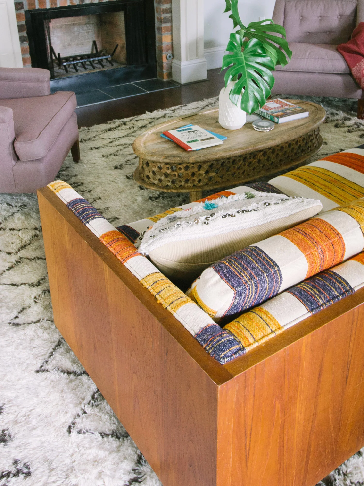 3 / Use a footstool as a side table. Why not, right? I like how low they sit and makes you wanna cozy up on the floor. You can find one here. I also like to place two chairs facing the sofa to create an intimate gathering.
