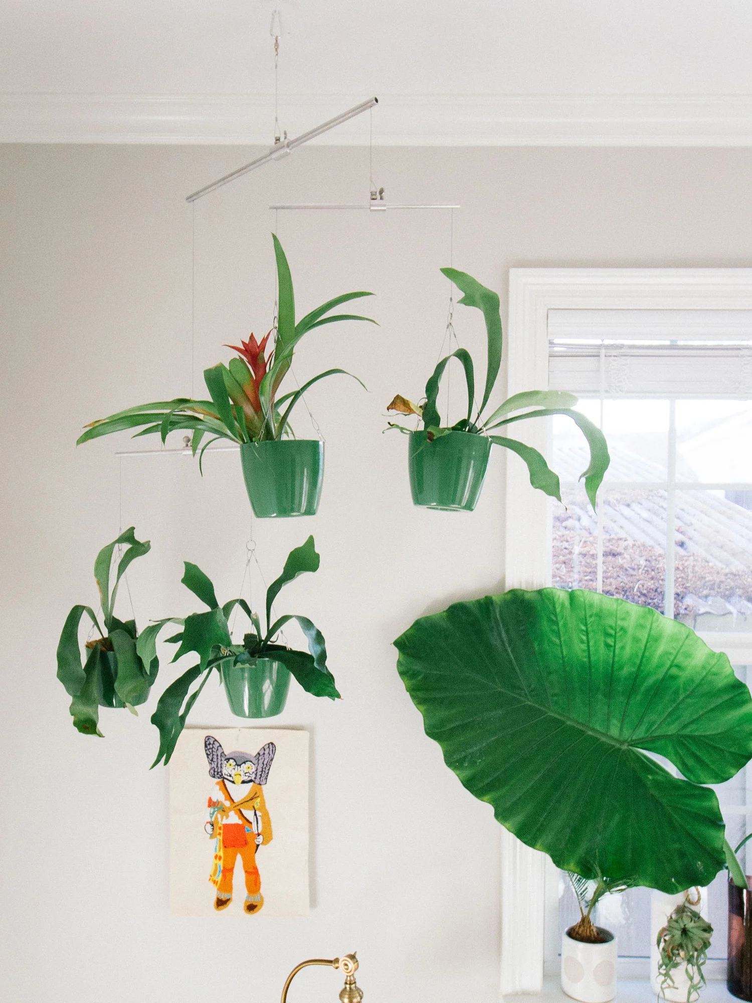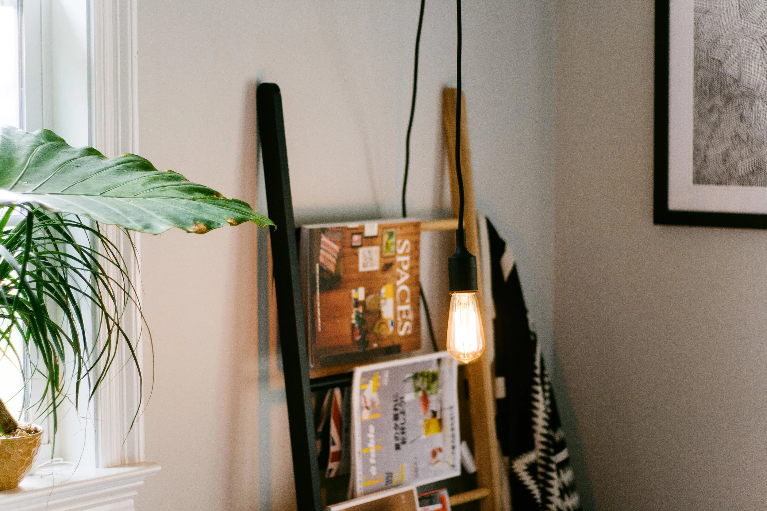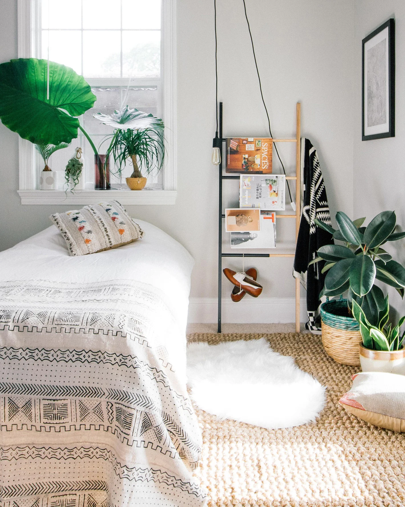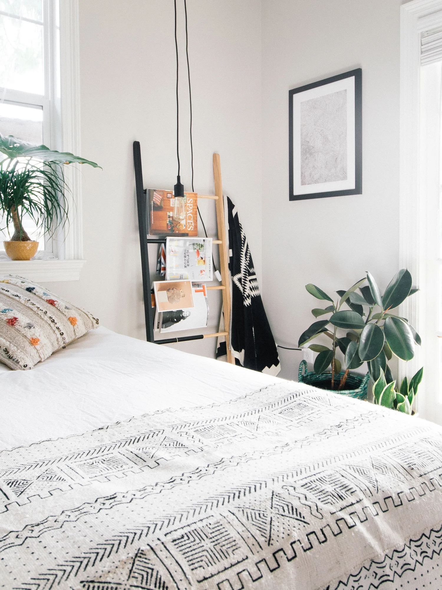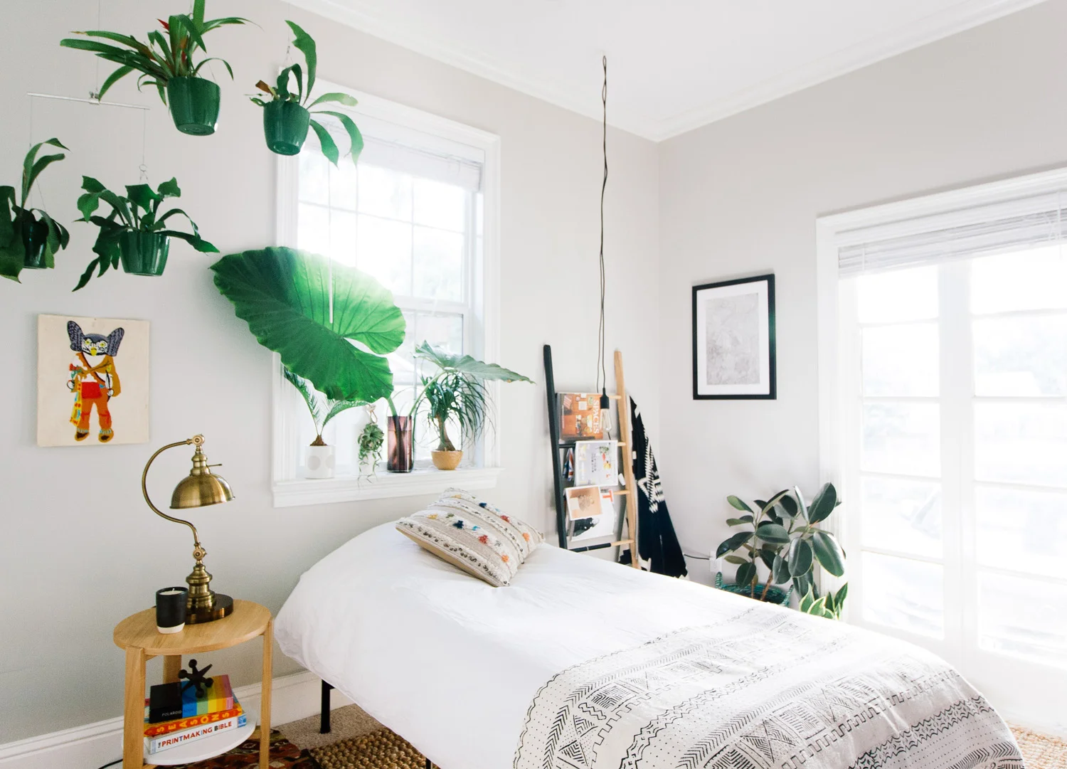 My inspiration for the room was a little bit of Scandinavian modern, a little bit folksy, and a whole lotta plants. Pick out pieces that are easy to assemble and doesn't take a lot of space. This side table was a cinch to put together. Ladders are also great for saving space. You can hang towels, clothes, magazines, and even shoes! The trick to making your room more awesome? Plants! Here are plants that are hard to kill: rubber tree plant, snake plant, ponytail palm, tillandsia, and staghorn ferns. If space is tight, you can also use your ceiling to hang plants in a Planter Mobile or hang cord lights instead of desk lamps. I wish my college room woke up like this!