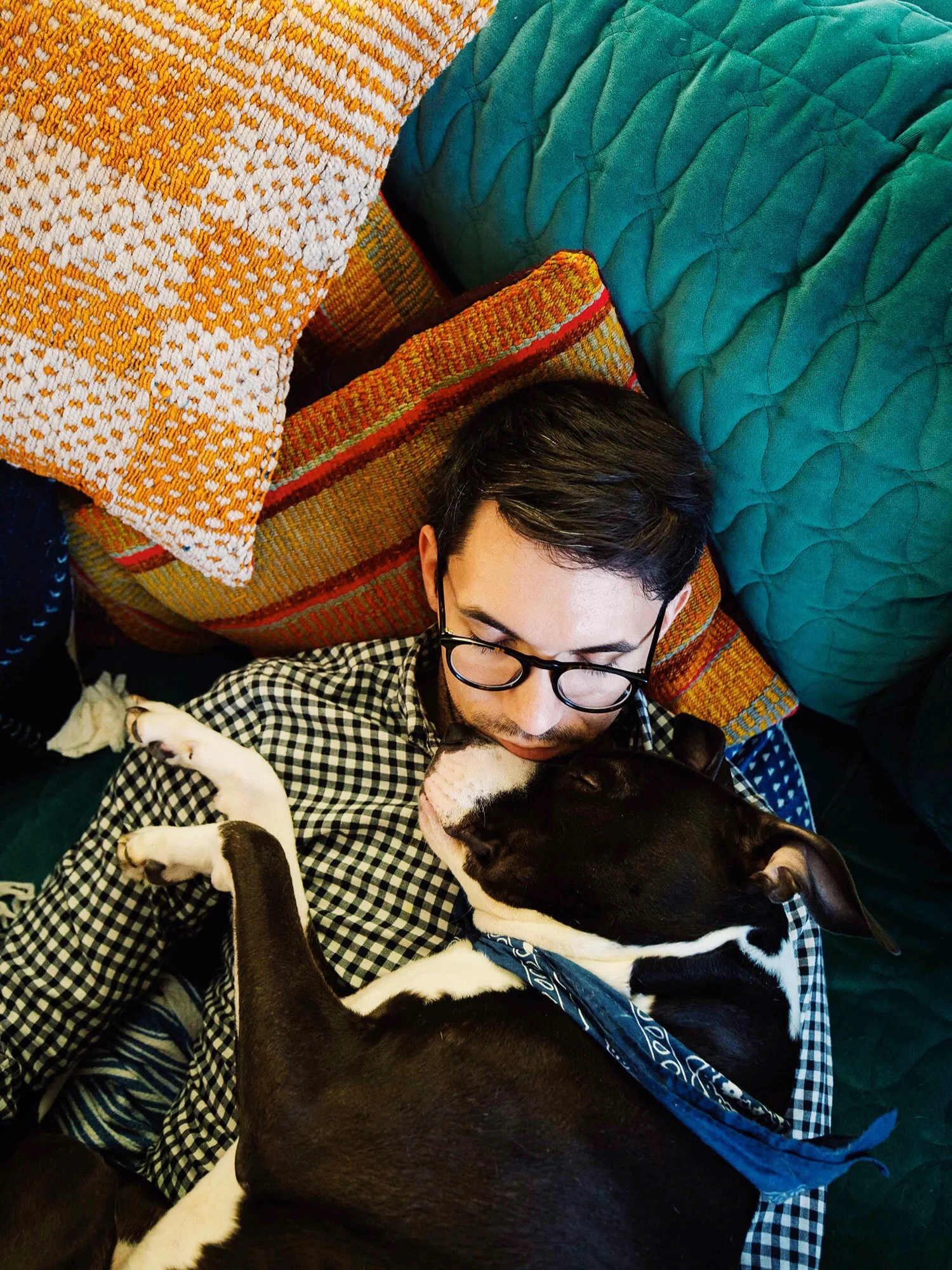 Our sun room just got a whole lot greener! Just in time to hop on the Pantone color of the year train! This gorgeous Mor velvet sofa is designed by my homegirl, Justina Blakeney is available through Jonathan Louis. You purchase it from City Home. It's ridiculously comfortable. The pattern stitching is such a nice touch. Now the heartmate and I can both comfortably stretch out and watch TV in here. Oh yeah, the pups love it, too!