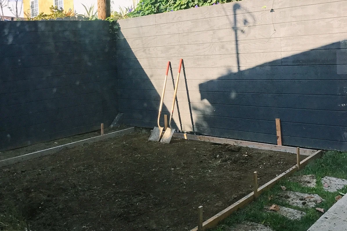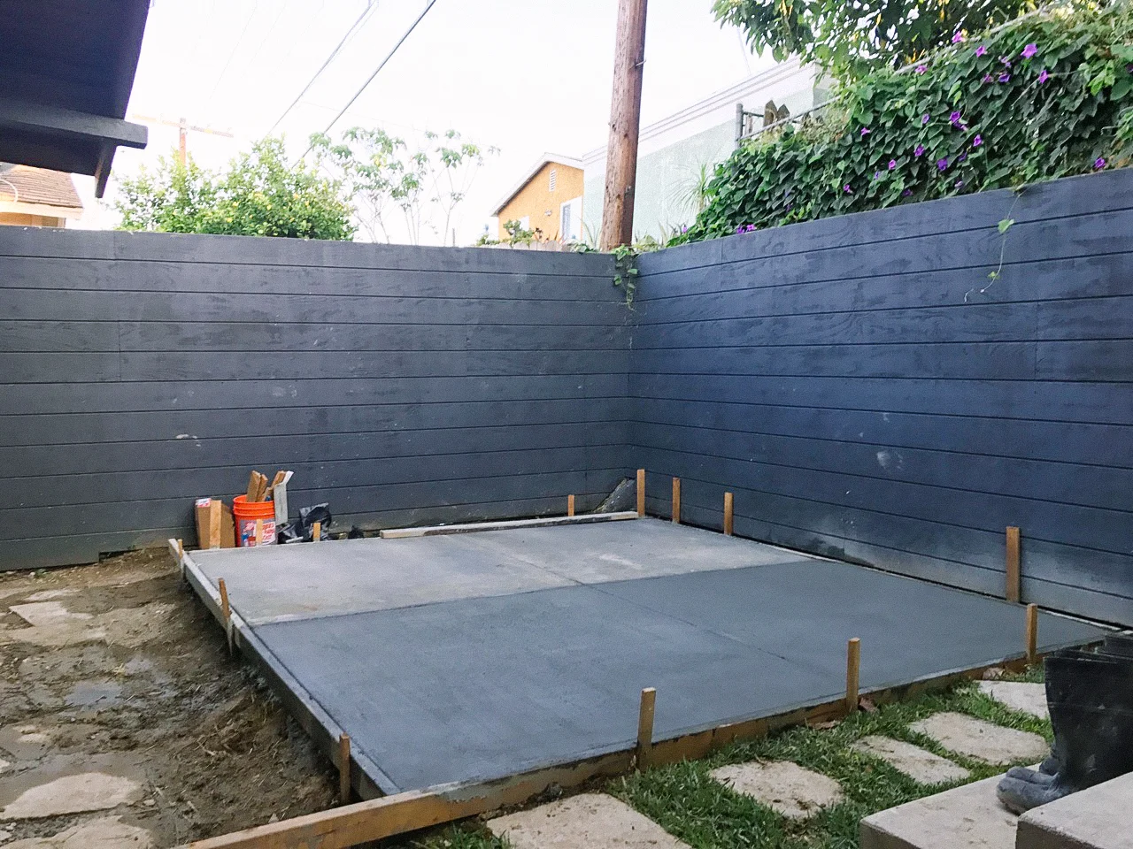 For this week on the ORC, we got some concrete up in here! So long, grass! We carved out a square slab that measures 12'x12' and added some wiggle room on the far left fence for plants.