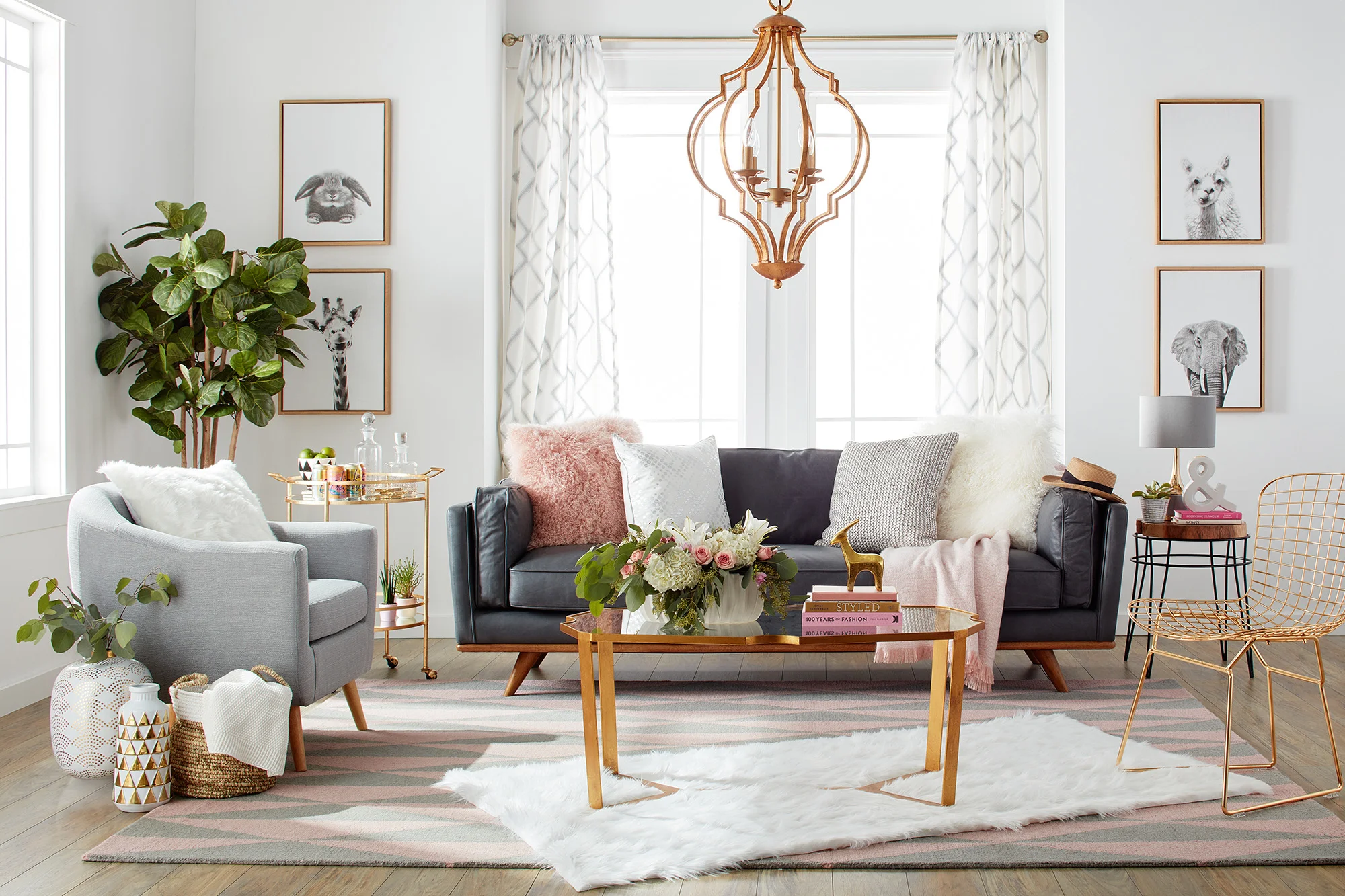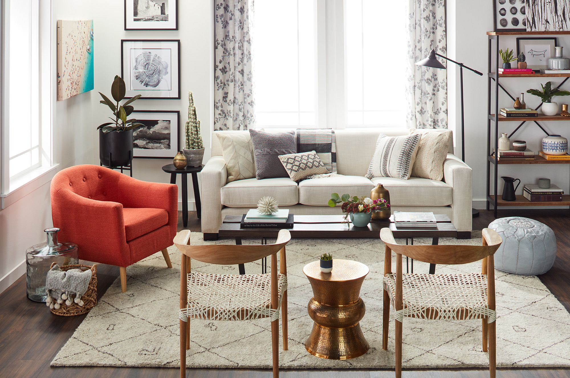 Bringing in color through accessories is also a great way to start for those who tend to be cautious of going overboard, or simply don’t know where to start. Your big investment pieces can be in more neutral shades so that it grounds the room, like this navy velvet sofa, wooden side table, Moroccan rug, and gorgeous peacock mirror. And when you switch up your space, they’ll still work with another color palette—just swap in new pillows, throws, and other small details. And when you shop at Overstock, you can find tons of truly gorgeous and colorful pieces in the Worldstock shop on the site. Worldstock is the section that offers artisan-crafted, fair trade items, so if you’re as into the eclectic, modern bohemian look as I am, you’ll love this option! Let's also see how the other designers created their living room around the popular chair. Our styles are so different but I love how they all turned out!