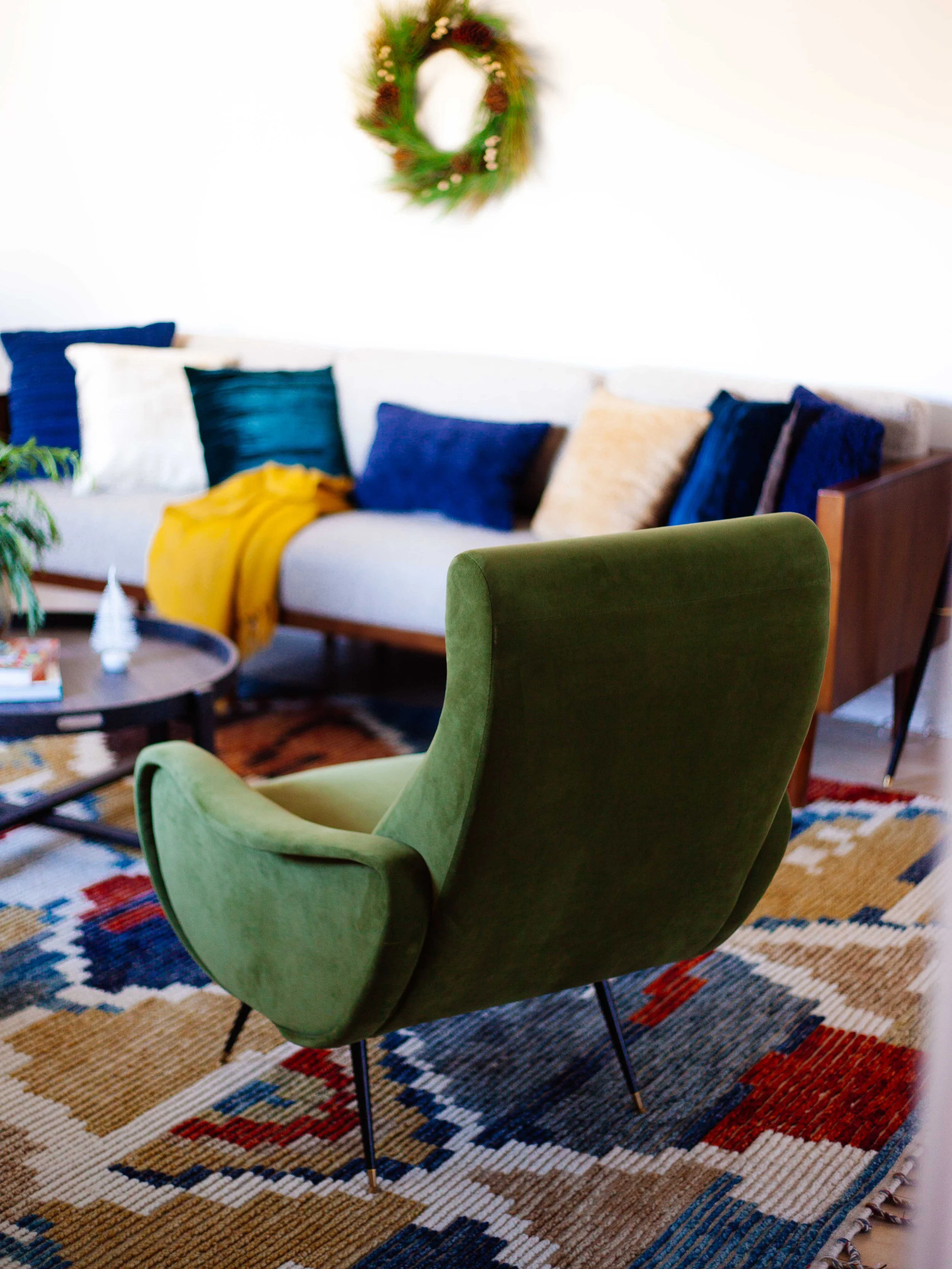 The curvy hunter green chairs in velvet go with it perfectly but they’re also colorful to stand out. The mid-century modern style sofa is sleek and minimal. You might have seen me use it once before in Han’s living room. I love it so much I decided to order one for myself. Even though it’s got a vintage look, it goes with just about everything. Then I added a dark grey coffee table, fluffy white ottoman — which can be used as extra seating — and a gold accent lamp (I dressed up with a colorful tassel, of course) for a little extra sparkle.
