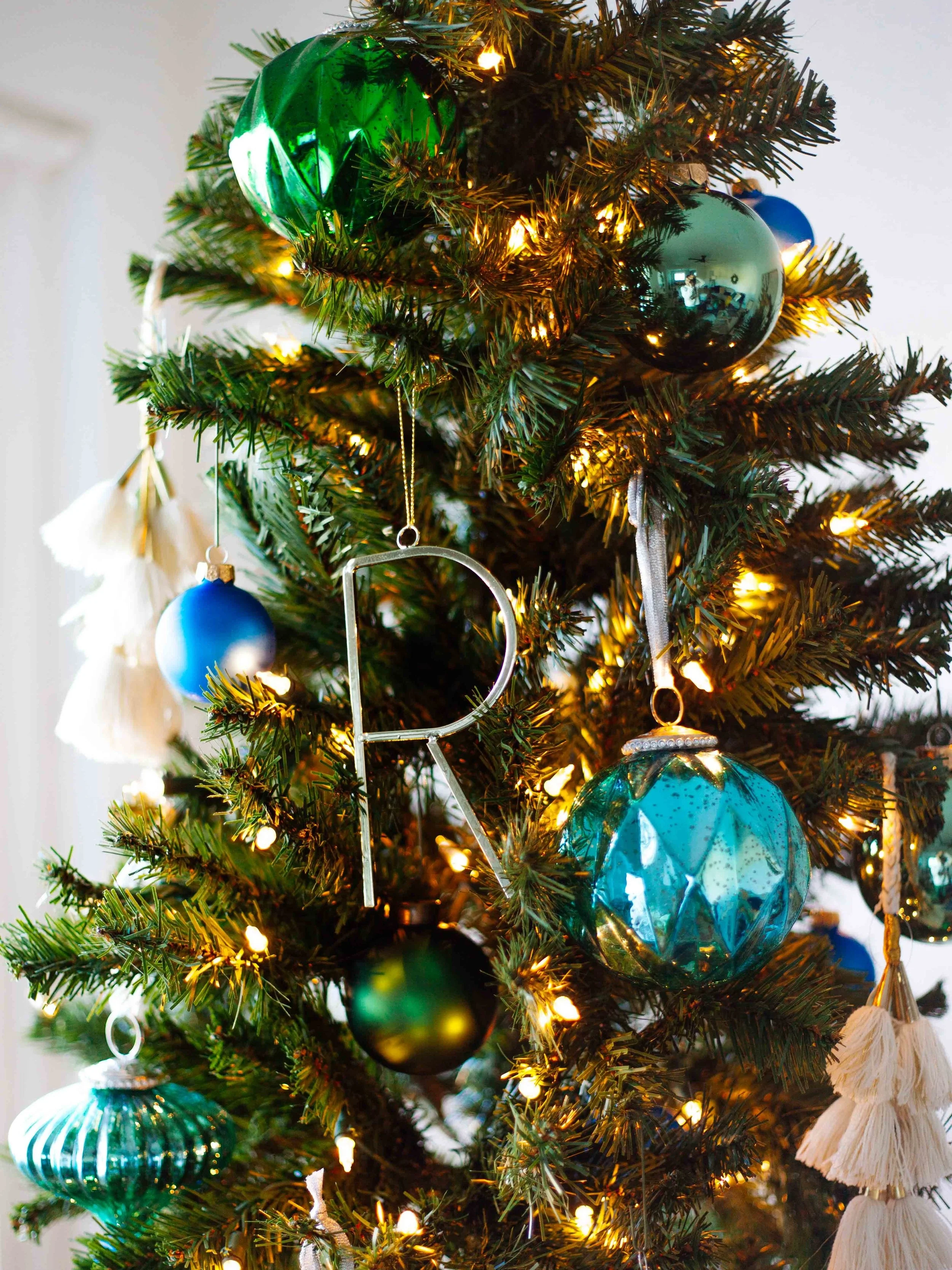 In terms of my holiday décor, the most important piece was this pre-lit tree. Now, generally I’m always a live tree person but it bums me out to see all the dead trees piled up on the curb once Christmas is over. So sad! It was easy to add this tall, slender artificial Christmas tree on while I shopped for my furniture on Overstock. I won’t have to toss it when I’m done and I don’t have to worry about stringing the lights — a total time saver. I also found the mercury glass ornaments, which have a vintage feel but are classic. Then I threw on some more tassels and some letter ornaments to represent the names of my family and my love to add even more personality.
