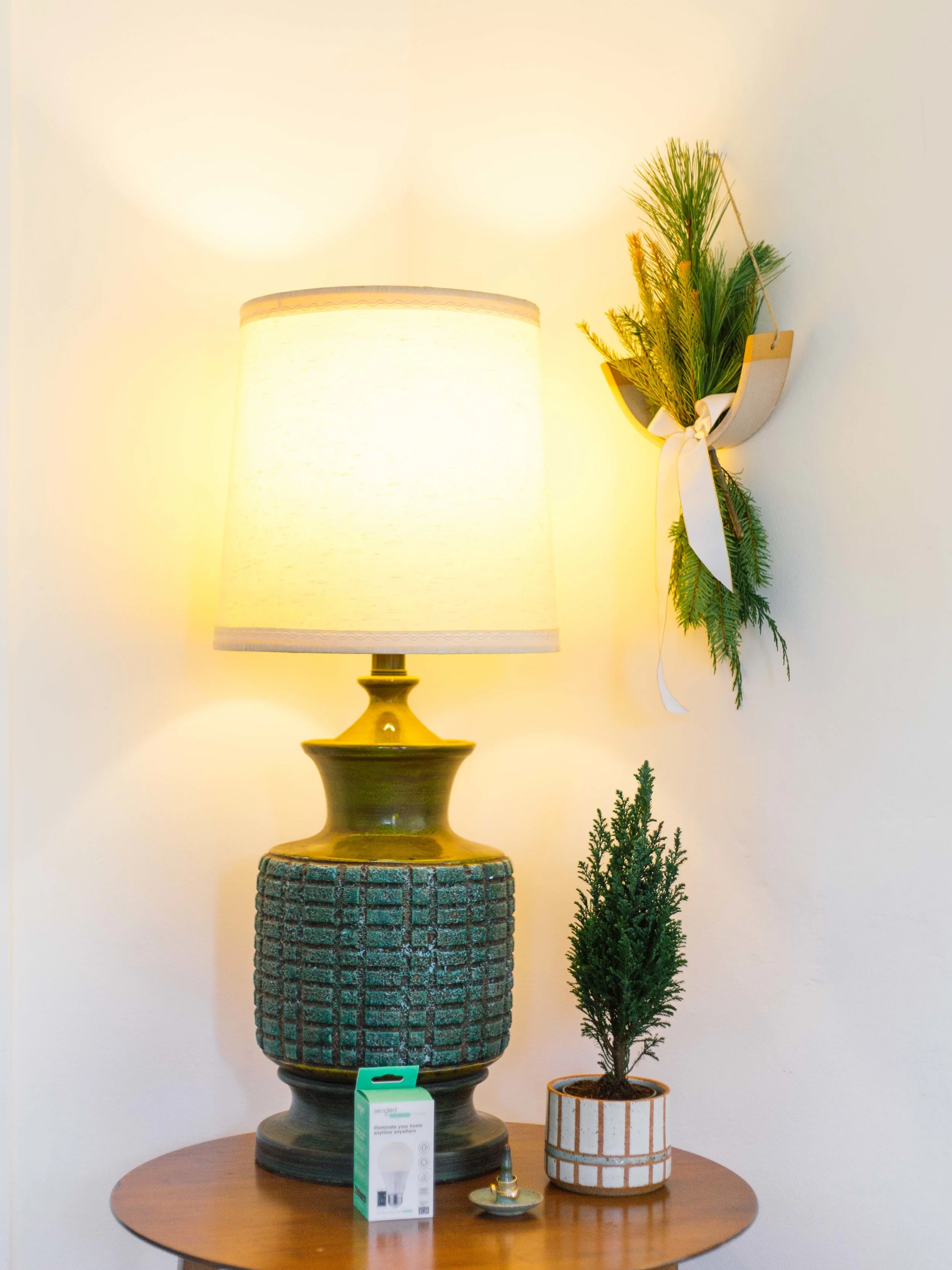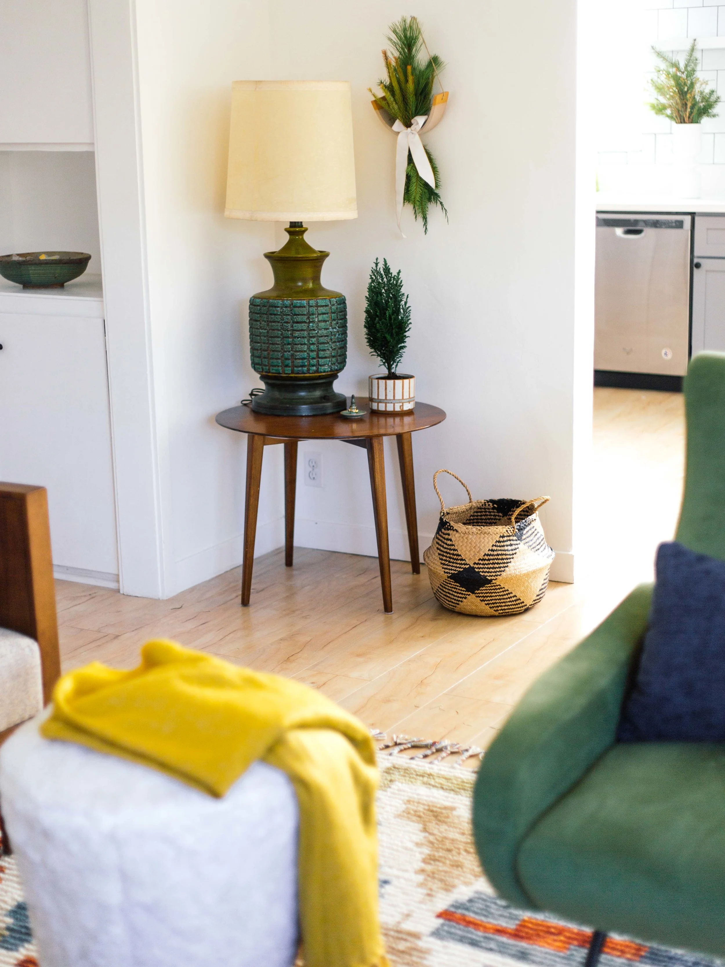 Vintage lamp from Luxe Lust • Vintage table from Goodwill • Plant Cradle from Folia Collective designed by Mudpuppy • Rice Basket • Ceramic planter from Folia Collective