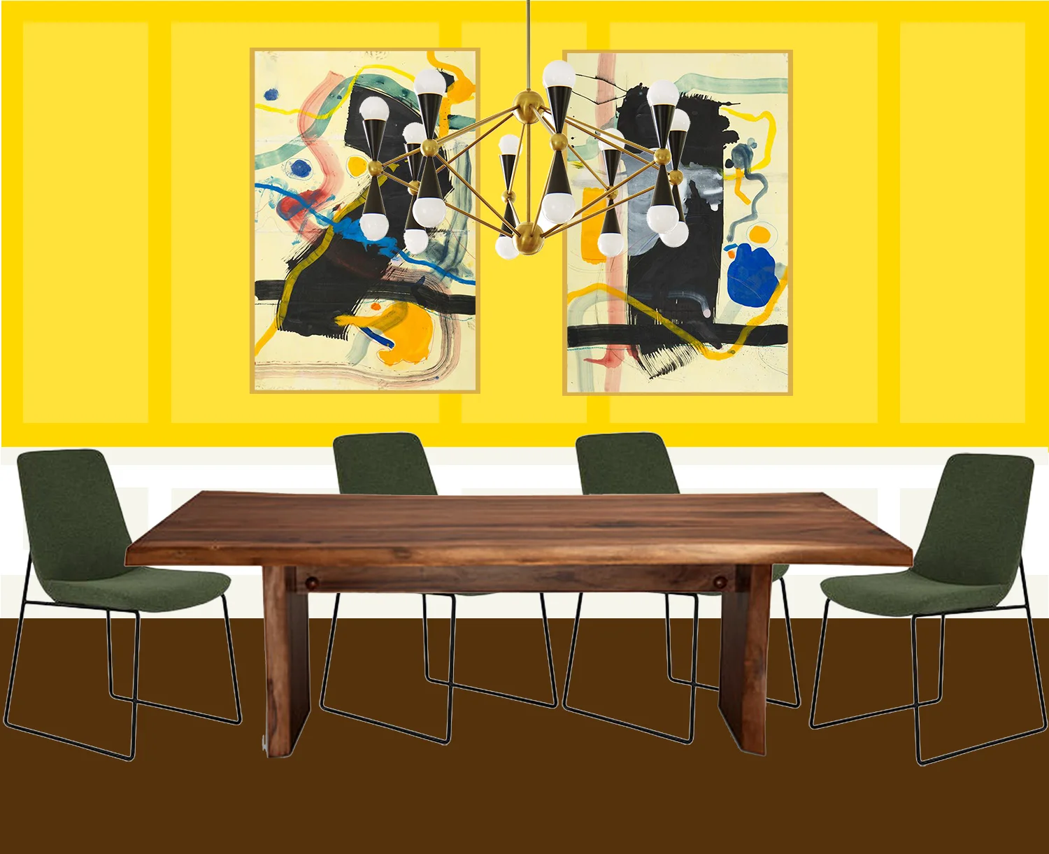 Here's a quick sketch of the dining room. We're bringing in a new handsome dining table, comfy chairs, and a Jonathan Adler chandelier. Oh hells yes! I can't wait for that gorgeousness to happen. Artworks are just placeholders for now. They're from a New Orleans artist, Leroy Miranda Jr. I still need to find a rug which has been a bit of a challenge. I don't know if I should go with something neutral or a vintage Persian rug? Stay tuned for next week! It's been really fun watching other designers completely gut their rooms which makes me want to open up my dining room! But we're not gonna do that. I don't think so? Haha.