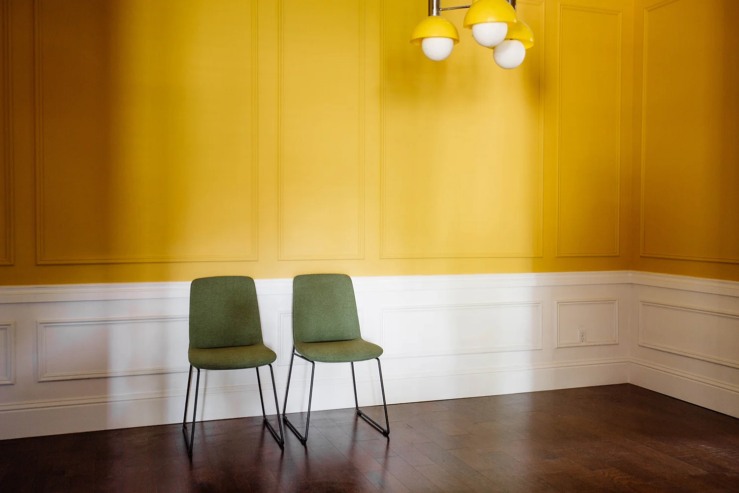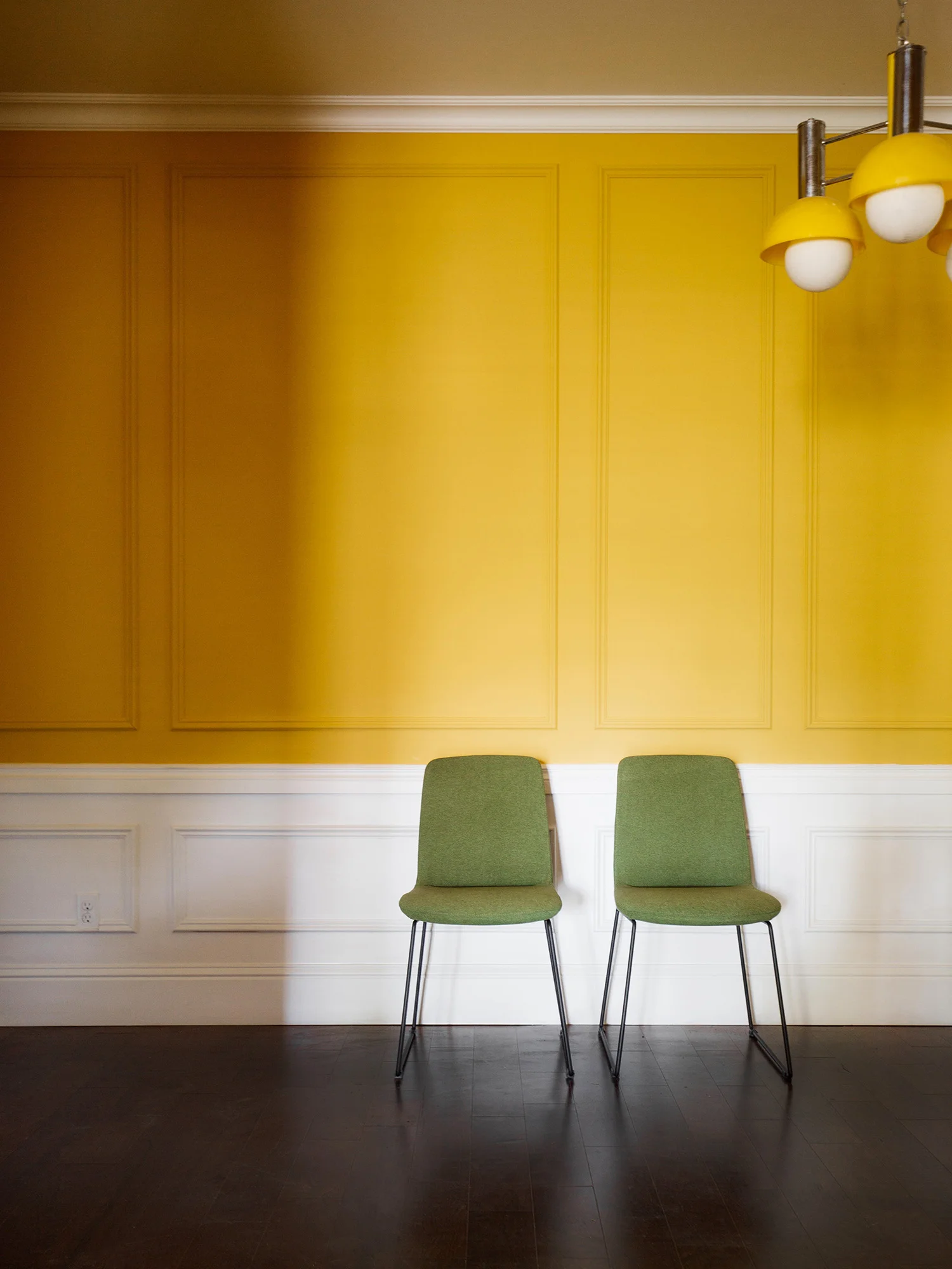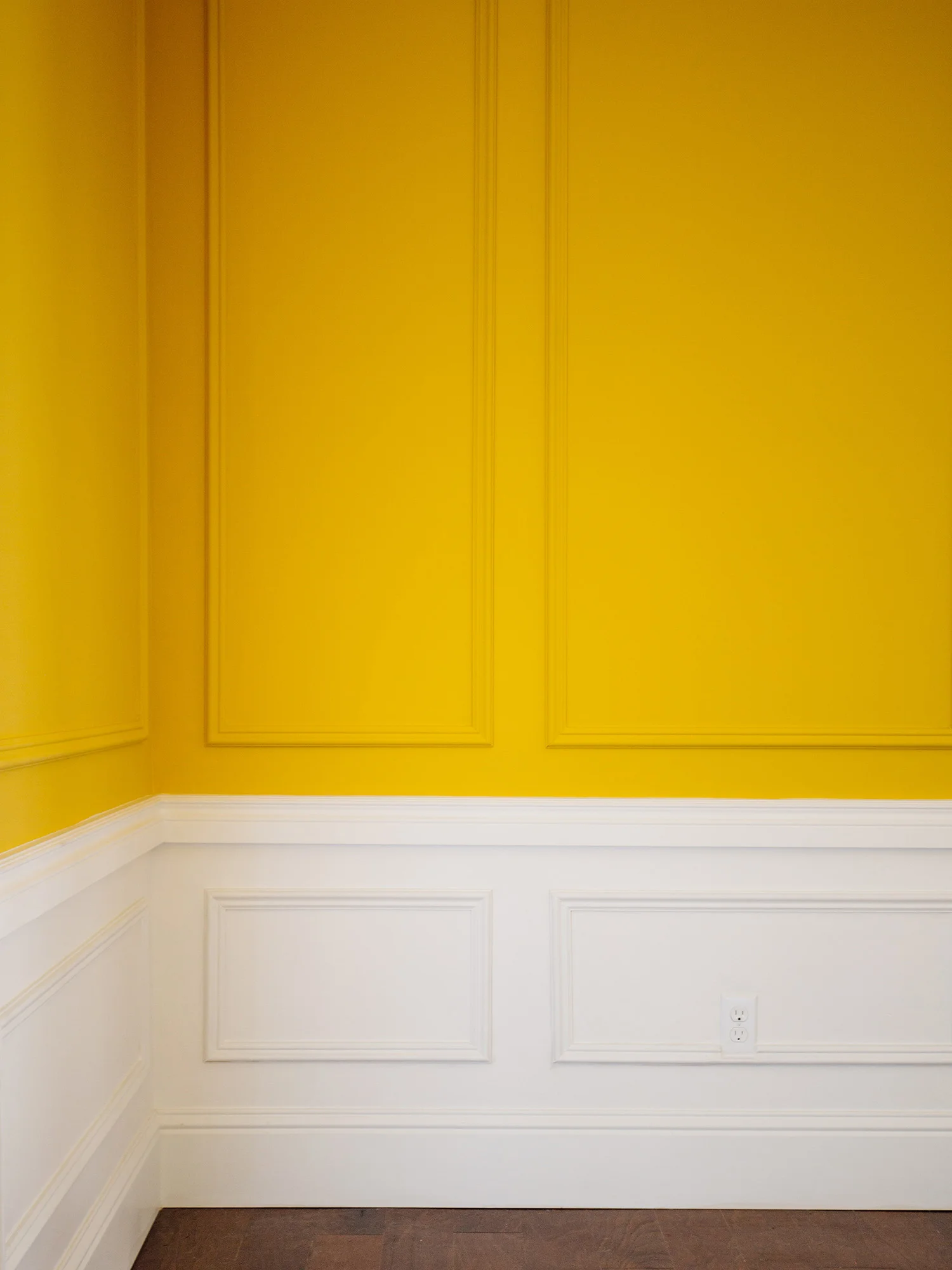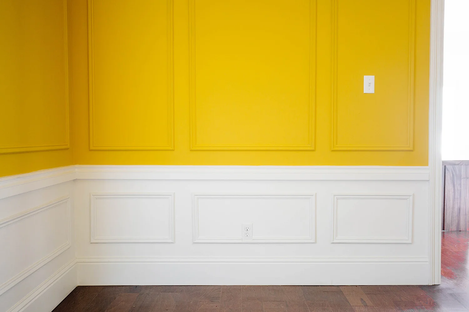I painted the wainscoting white and kept everything above the chair rail yellow to create contrast. Remember how flat and one dimensional the dining room used to be in all white? And with the new panel moulding from Metrie, there's just so much more oomph! Question for you guys: should I paint the switch plates or swap them out for brass plates? I can't decide.