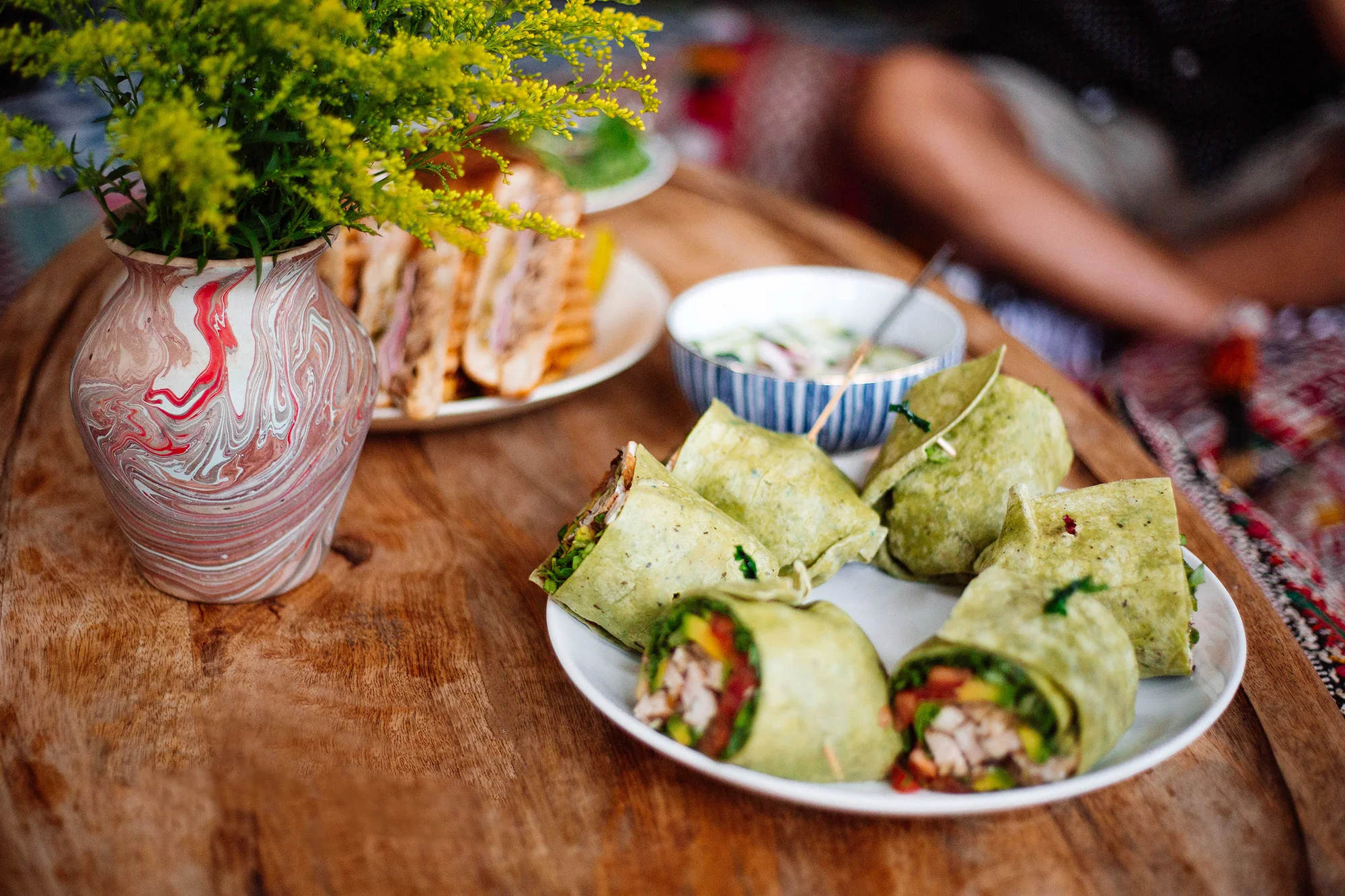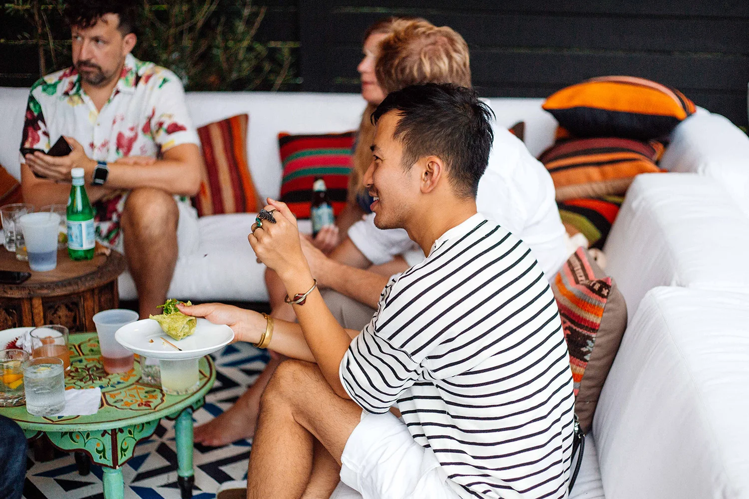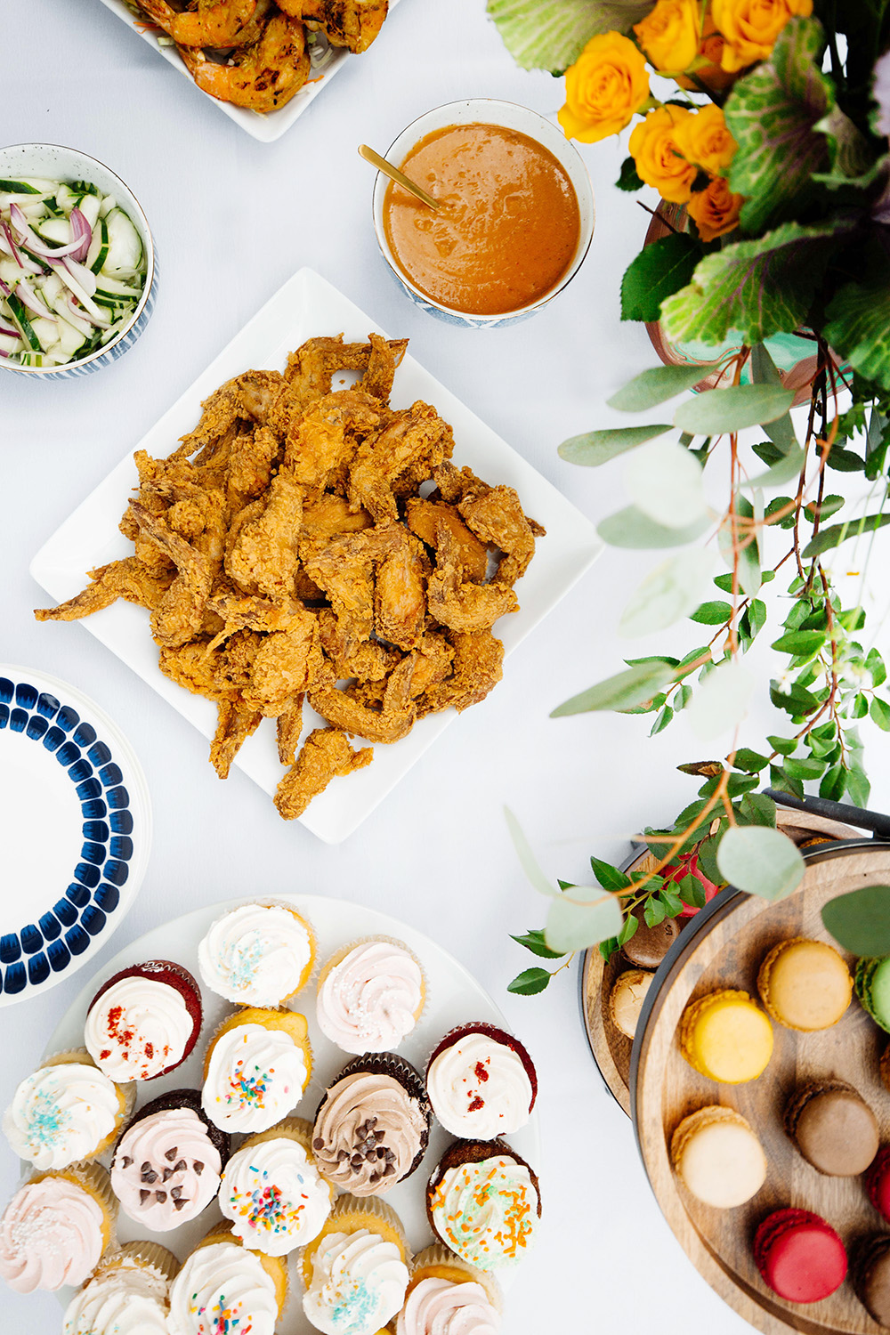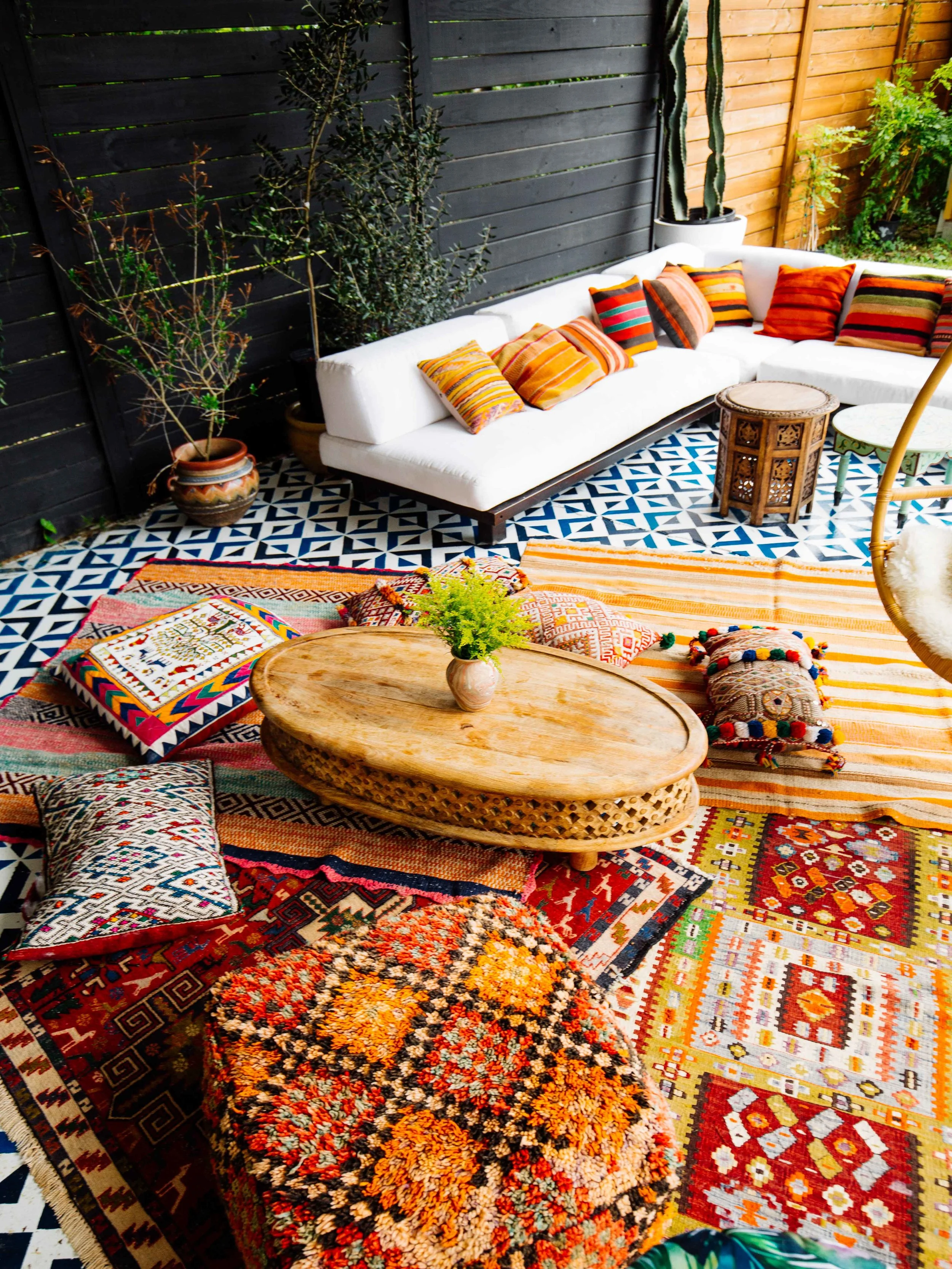 My heartmate and I invited about ten of our homies over for the festivities. I couldn’t settle on just one style of food so I ended up ordering from five different restaurants (also I didn't want to bog one down with a huge order). Our spread included fried chicken, grilled shrimp skewers, veggie wraps, salads, Cuban sandwiches, cupcakes and macarons for dessert. The fact that Grubhub took care of the food meant I could focus on the other duties of hosting an intimate bohemian backyard party, like decorating. I think the best kind of decor for any summer outdoor party is to layer bright, citrus-colored textiles, like Peruvian rugs and Moroccan pillows to imbue a sense of cozy cheerfulness. And definitely use plants to create an oasis.