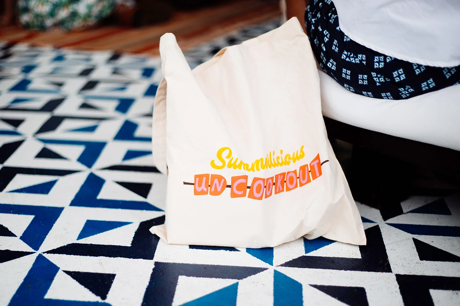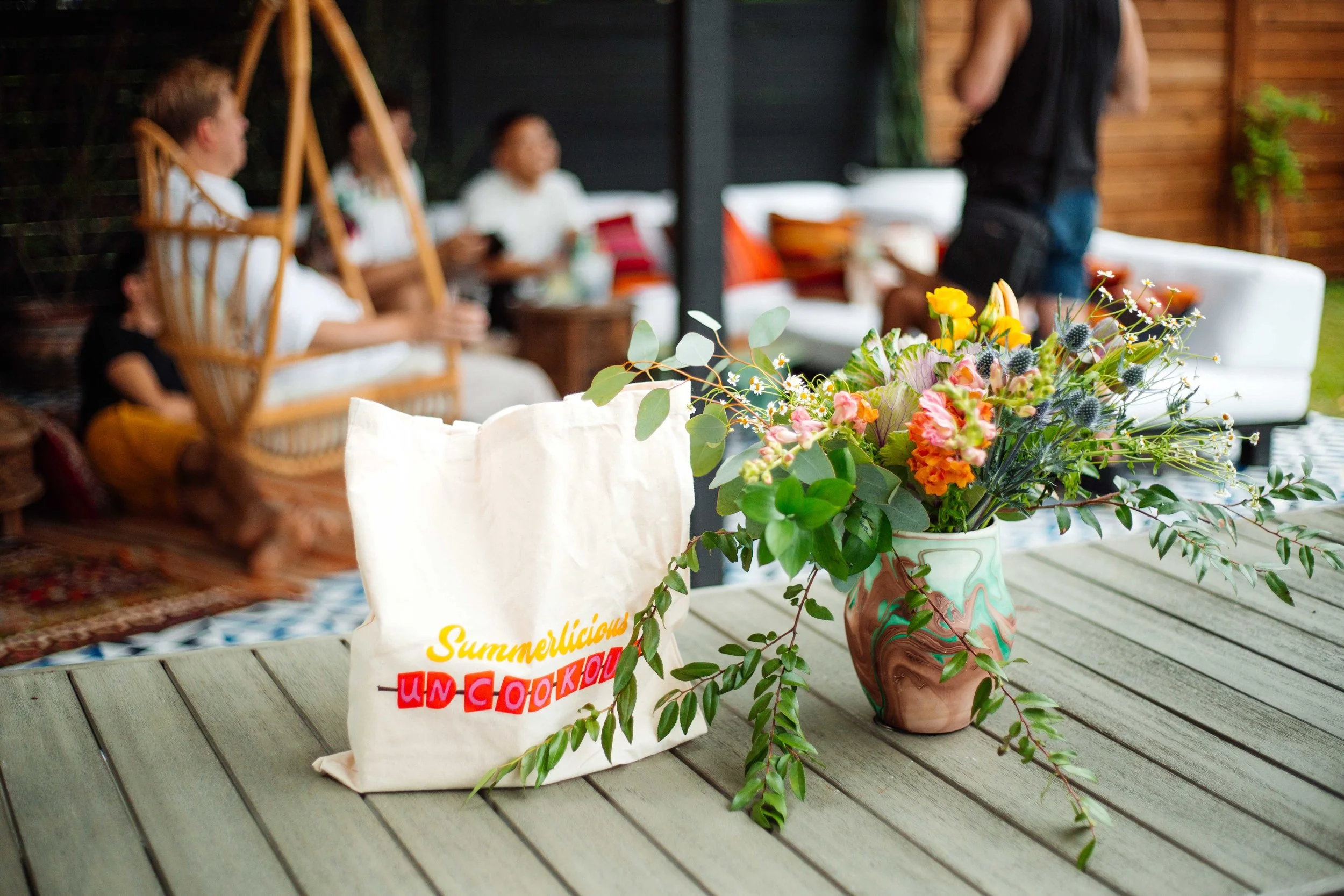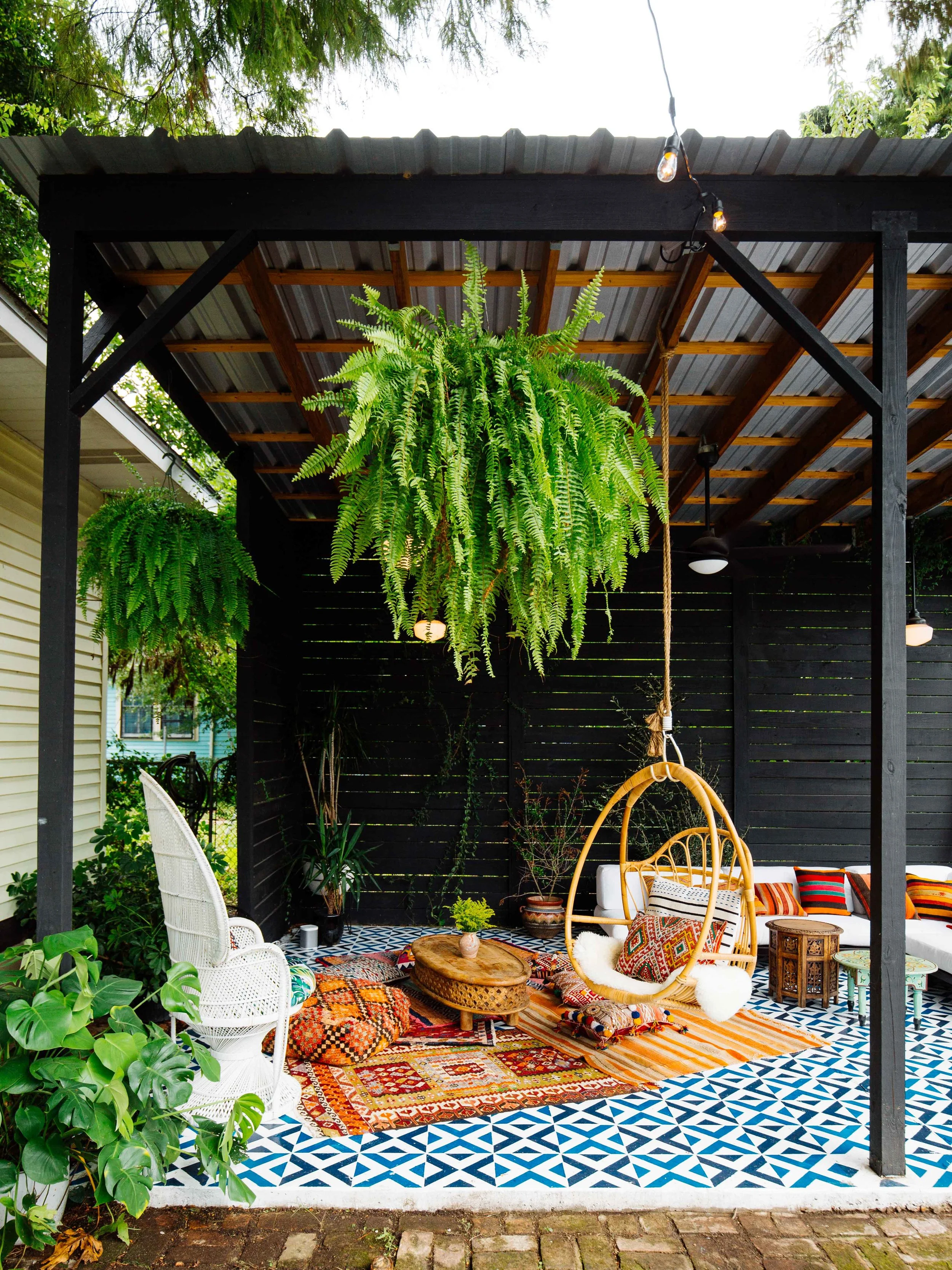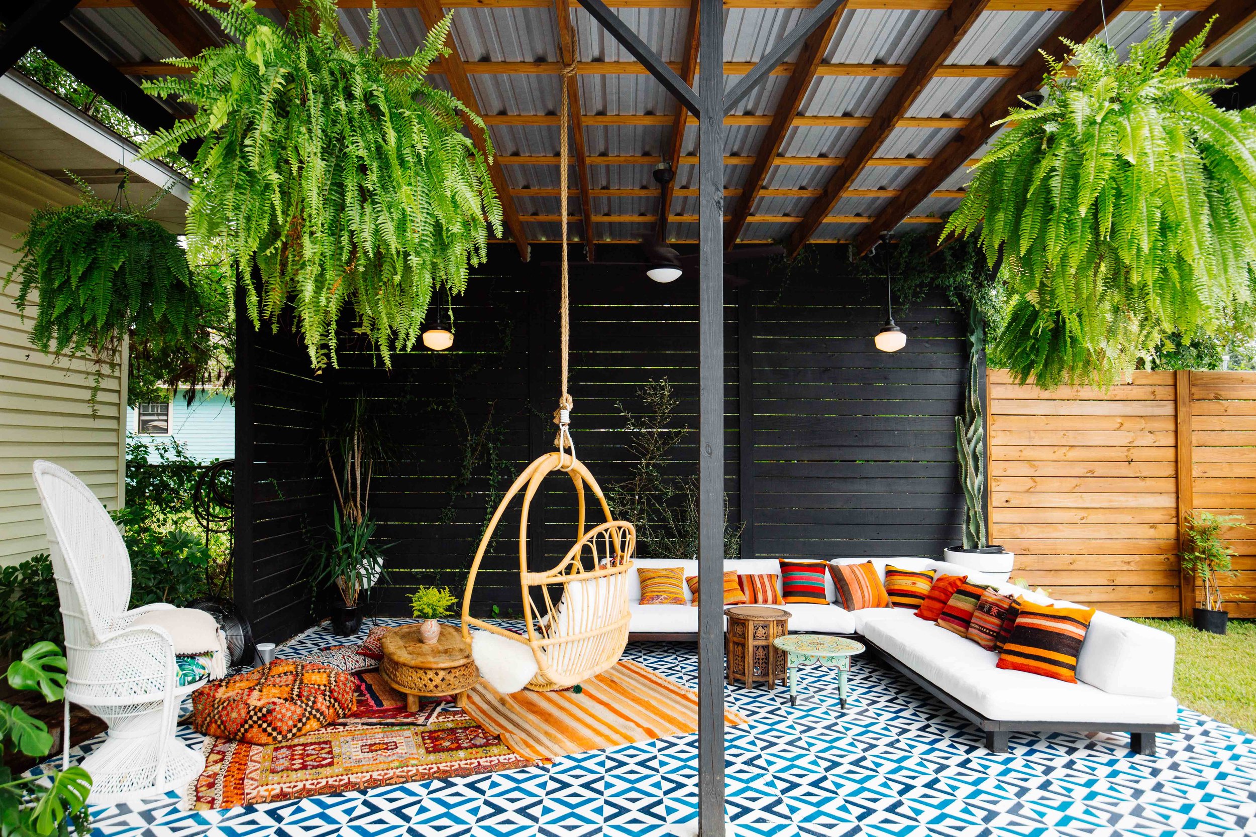 My heartmate and I invited about ten of our homies over for the festivities. I couldn’t settle on just one style of food so I ended up ordering from five different restaurants (also I didn't want to bog one down with a huge order). Our spread included fried chicken, grilled shrimp skewers, veggie wraps, salads, Cuban sandwiches, cupcakes and macarons for dessert. The fact that Grubhub took care of the food meant I could focus on the other duties of hosting an intimate bohemian backyard party, like decorating. I think the best kind of decor for any summer outdoor party is to layer bright, citrus-colored textiles, like Peruvian rugs and Moroccan pillows to imbue a sense of cozy cheerfulness. And definitely use plants to create an oasis.