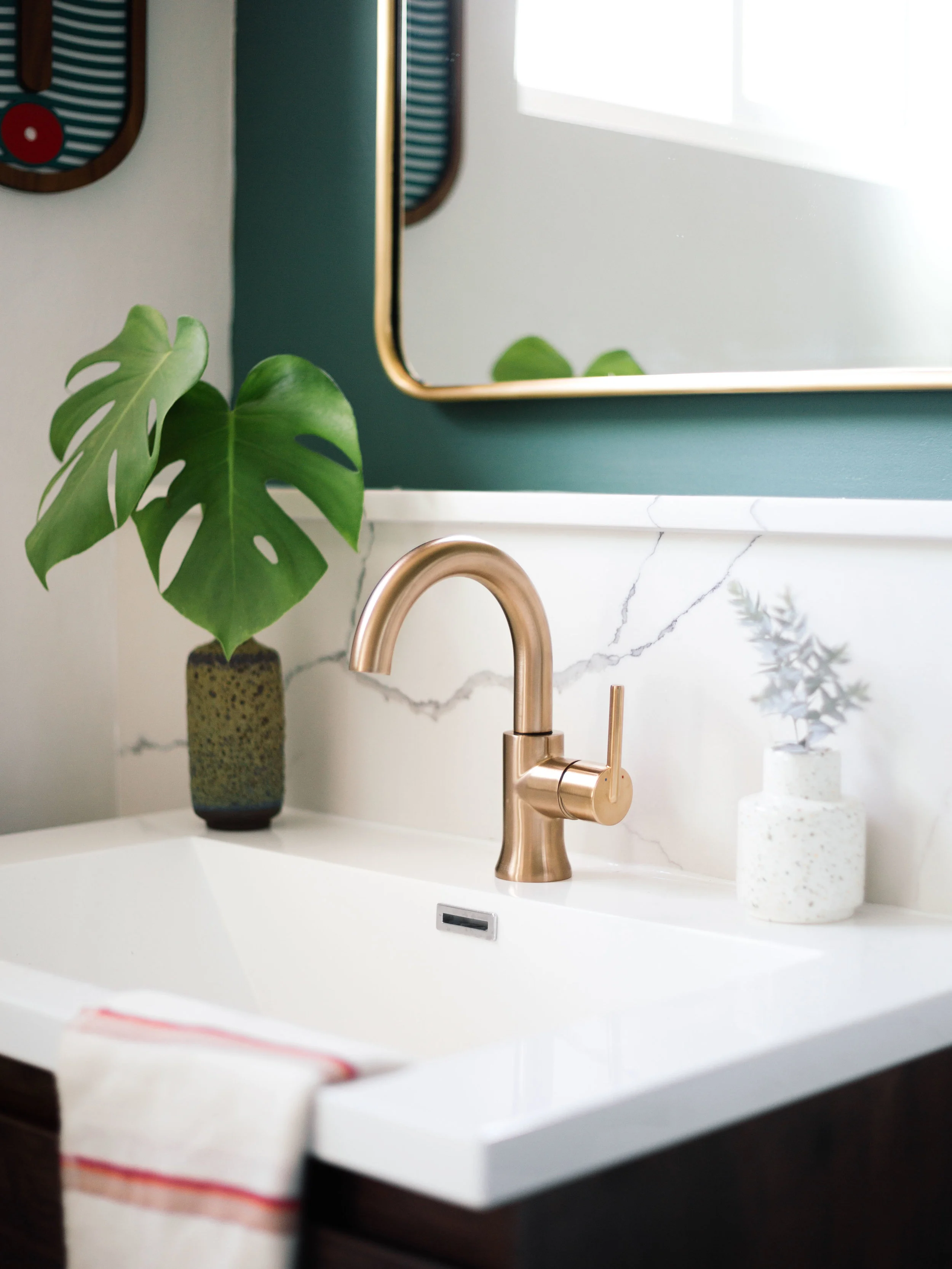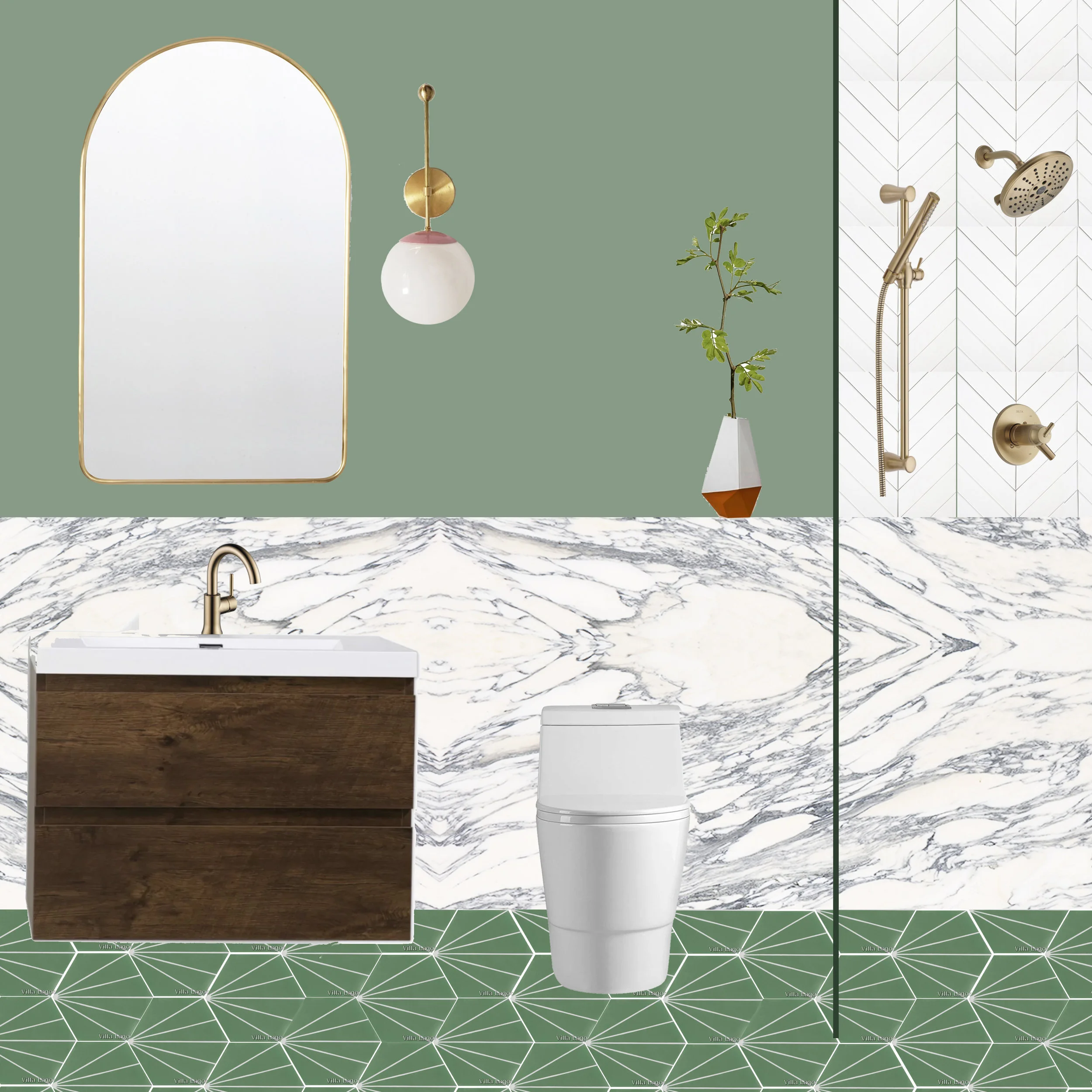 It’s hard for me to articulate my design process because it’s so instinctual. For this bathroom, I wanted to bring a big impact into this small space. I started out by choosing materials first. It was a nice change because I typically hit the ground running with color. I chose the Trinsic collection from Delta® in Champagne Bronze because I gravitated towards its elegant curves and clean lines and knew it would pair well with my modern, graphic sensibility. It has a neutral gold tone that compliments any color palette. The bathroom mood is inspired by an acacia tree from my backyard and it led me to find these green cement tiles that reminded me of it for the floors.