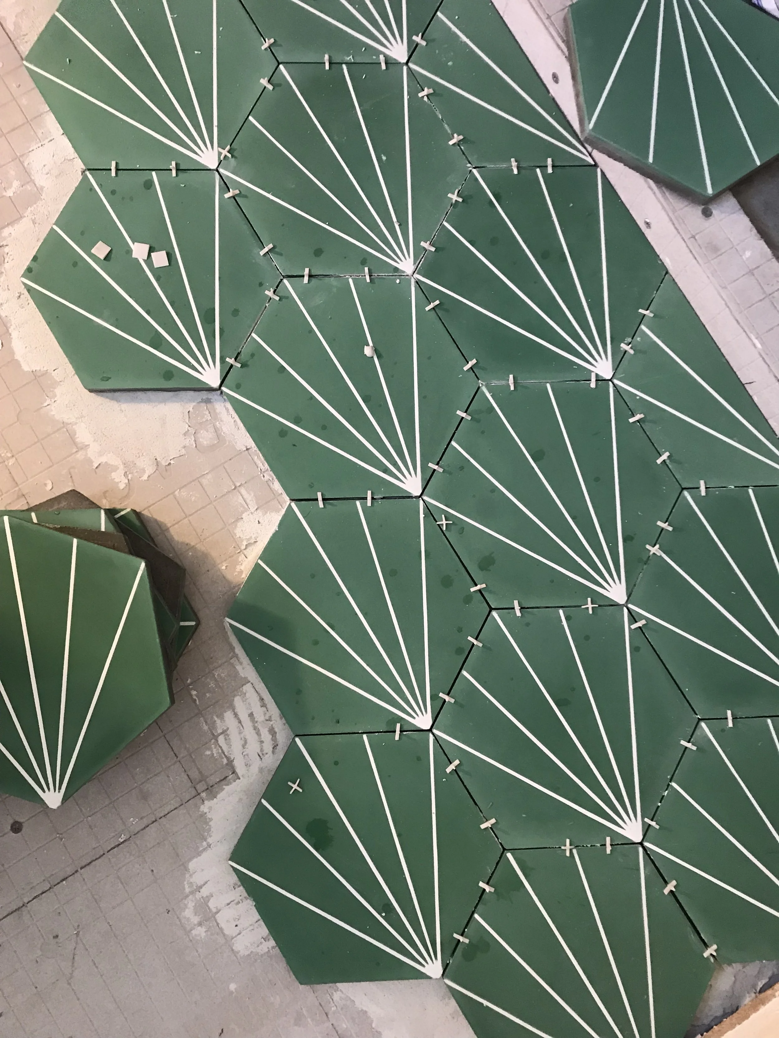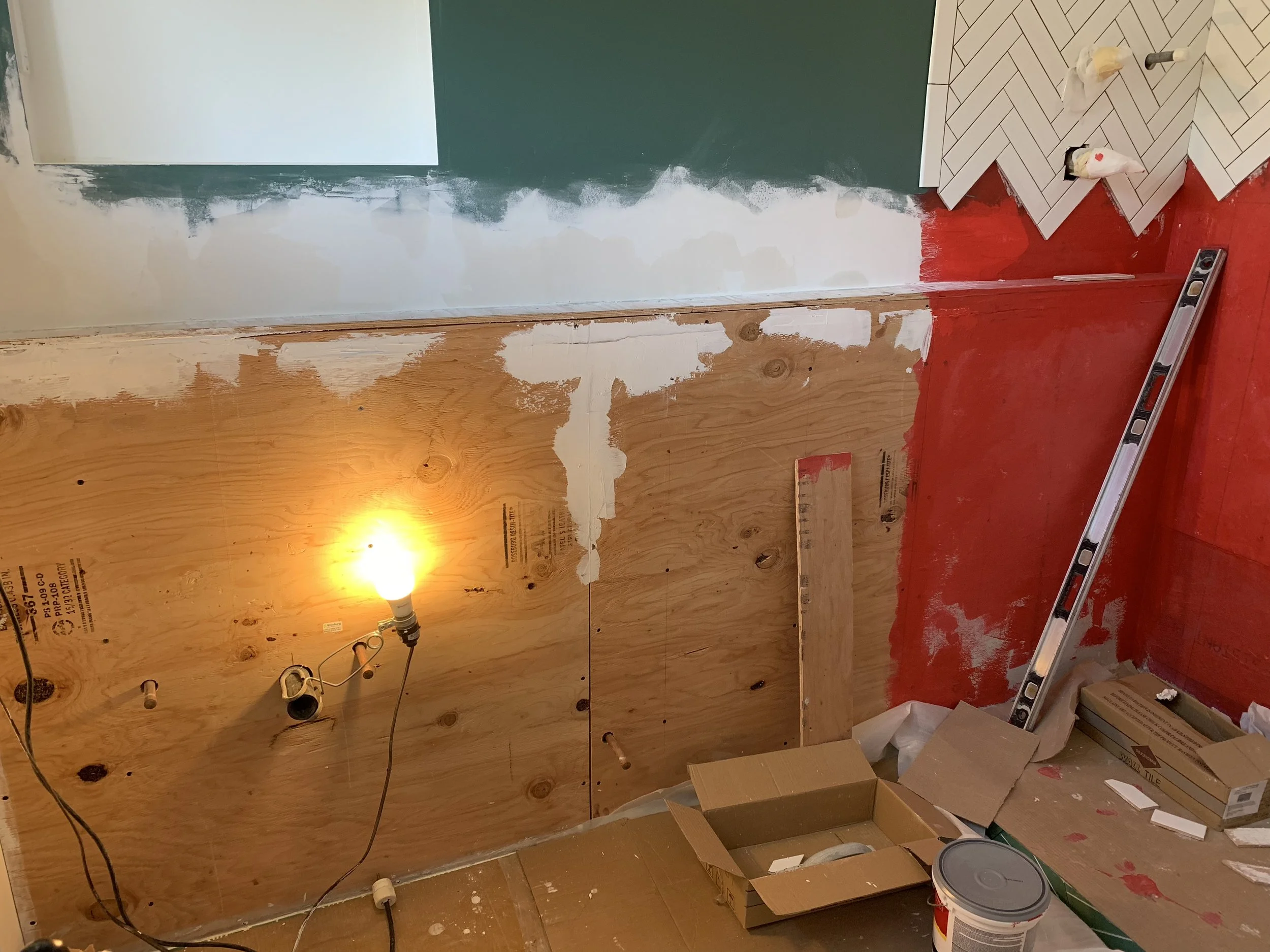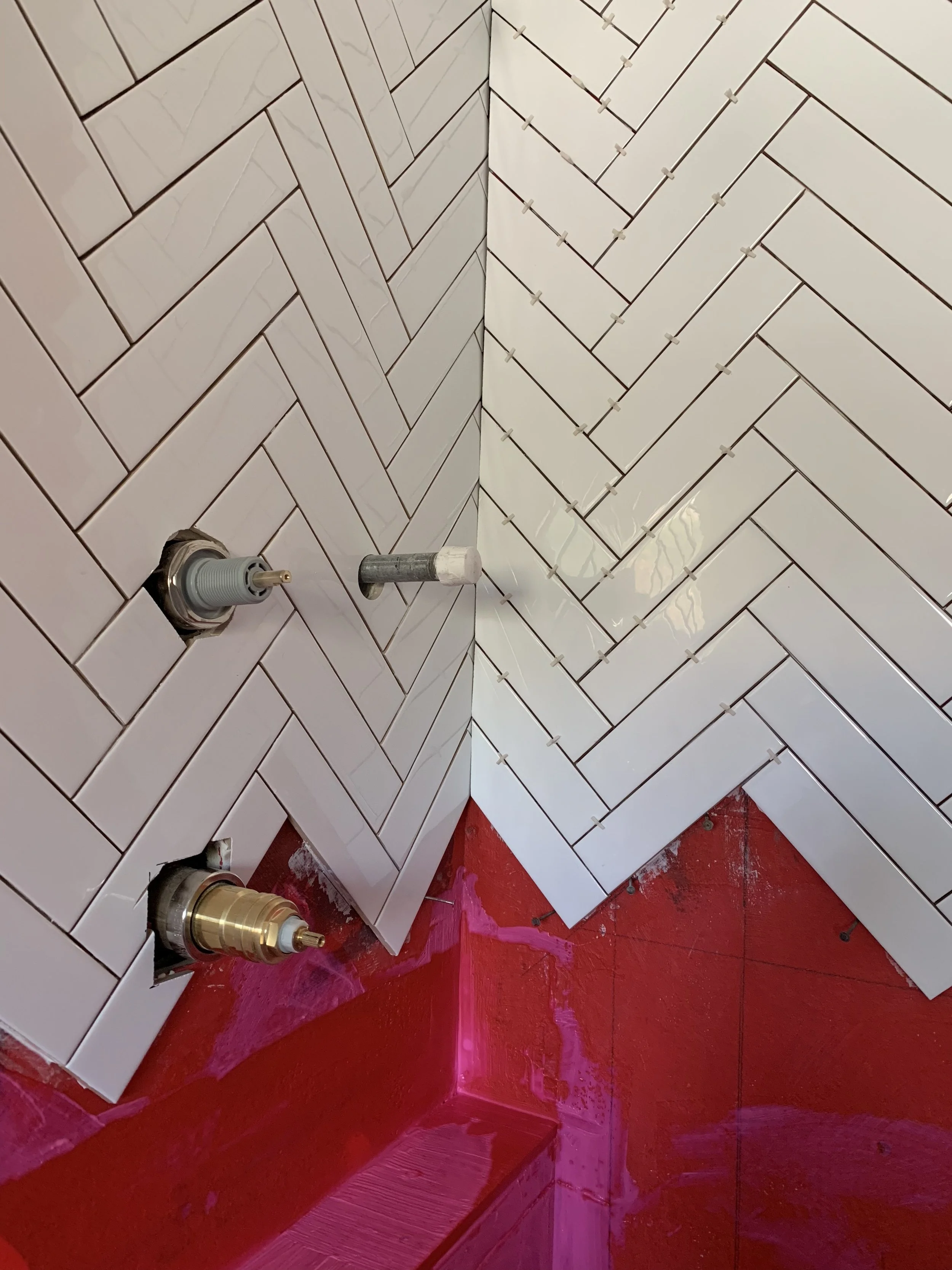 Quick thing about cement tiles, they require extra care during the process. I learned a lot from my last bathroom reno. This time around, I sealed the tiles before installation to protect the tiles from stains (grout, thinset, etc.). I applied a bright white grout using 1/16th grout lines which added more lines to the pattern and I love it. Different grout colors and grout widths can really change the look and feel of your space so it’s something to consider. Another example are these herringbone tiles. I used 2x8 white glossy subway tiles and it felt like it took light years to install them, but it was also kinda therapeutic. The entire bathroom was very matte so I wanted the shower wall to stand out with a sheen. I chose white grout because it would’ve been way too busy had I used a darker one. And white on white hides any imperfections in the tiling. The red you see is a waterproof membrane.