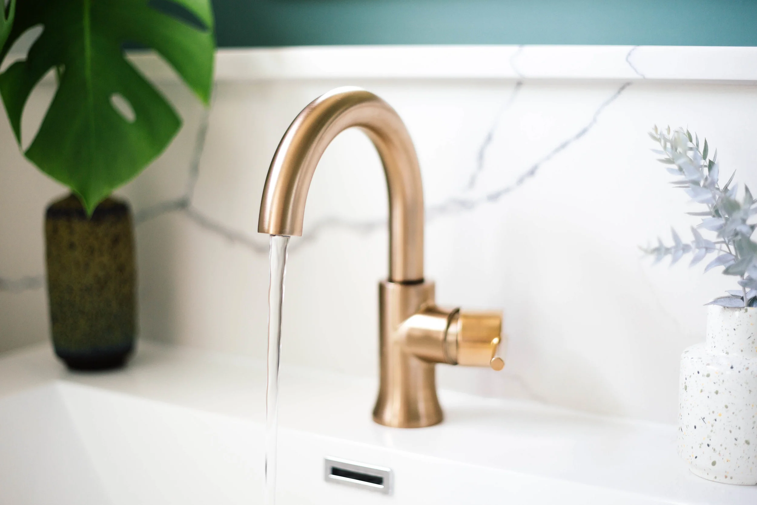 The single handle high-arc faucet continues the arch in the mirror. I like that it swivels so it gives me a little more control. I actually like to give my hair a quick rinse in the sink every morning so this swivel is perfect. All the curves create a nice contrast from all the geometric shapes.