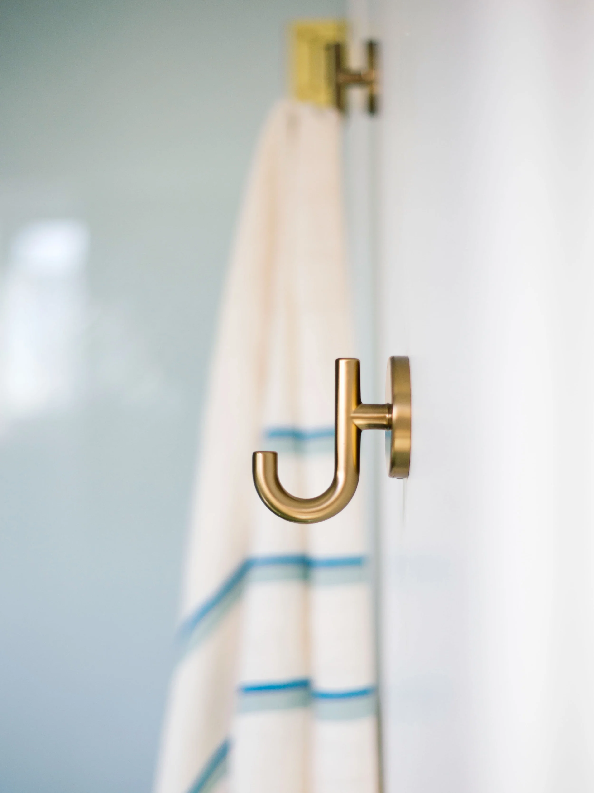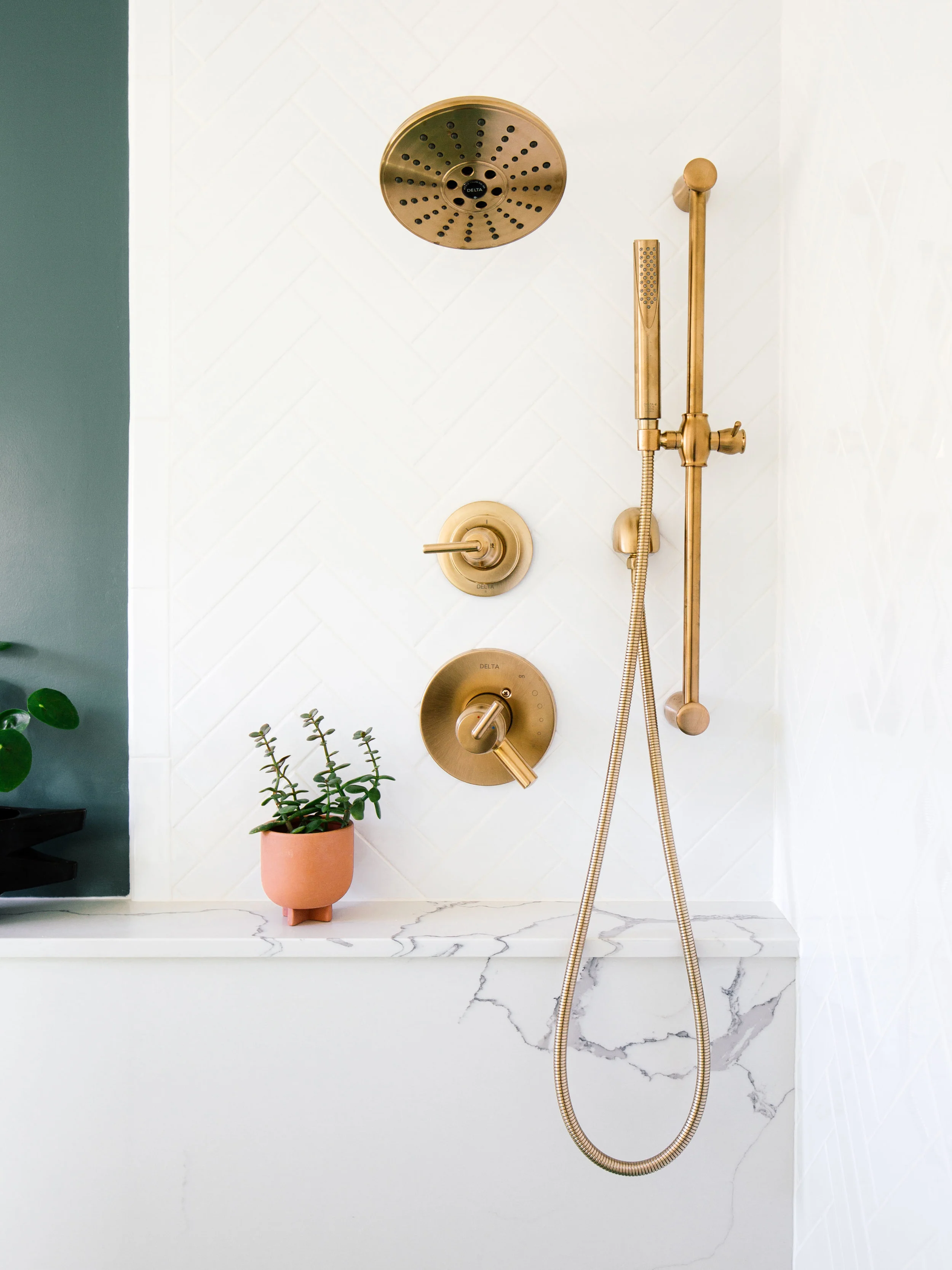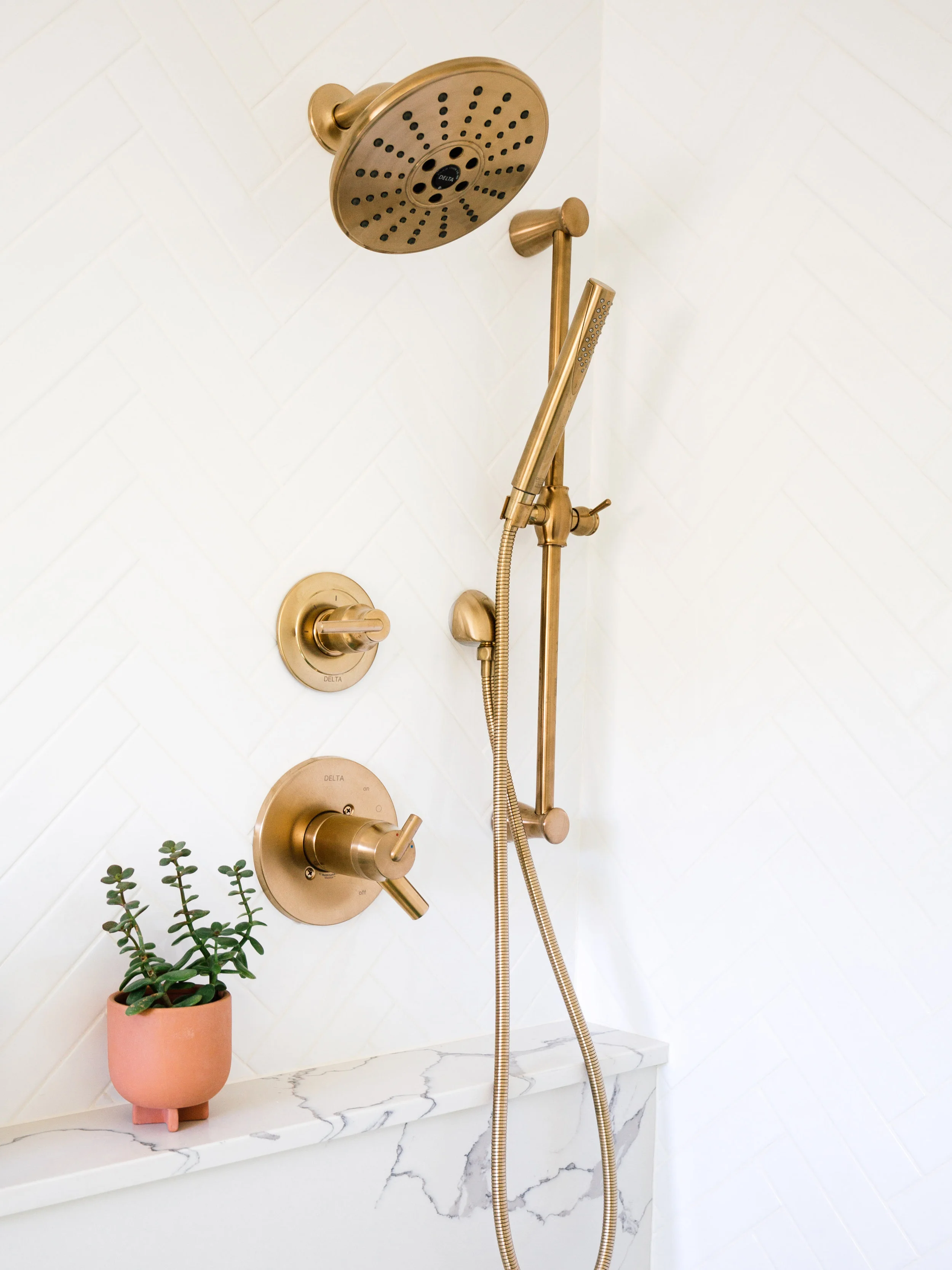 The walk-in shower feels more open and fits our needs better. We never bathe. I opted for both a showerhead and handshower to create a luxurious spa-like experience in the comfort of our own casa. The Delta 17T Series Shower Trim gives you more control and uses 20% less water without compromising water pressure. It’s amazing. The handshower also makes it easier to clean hard to reach places, water plants, and bathe our pups! I’m also obsessed with these Delta robe hooks.
