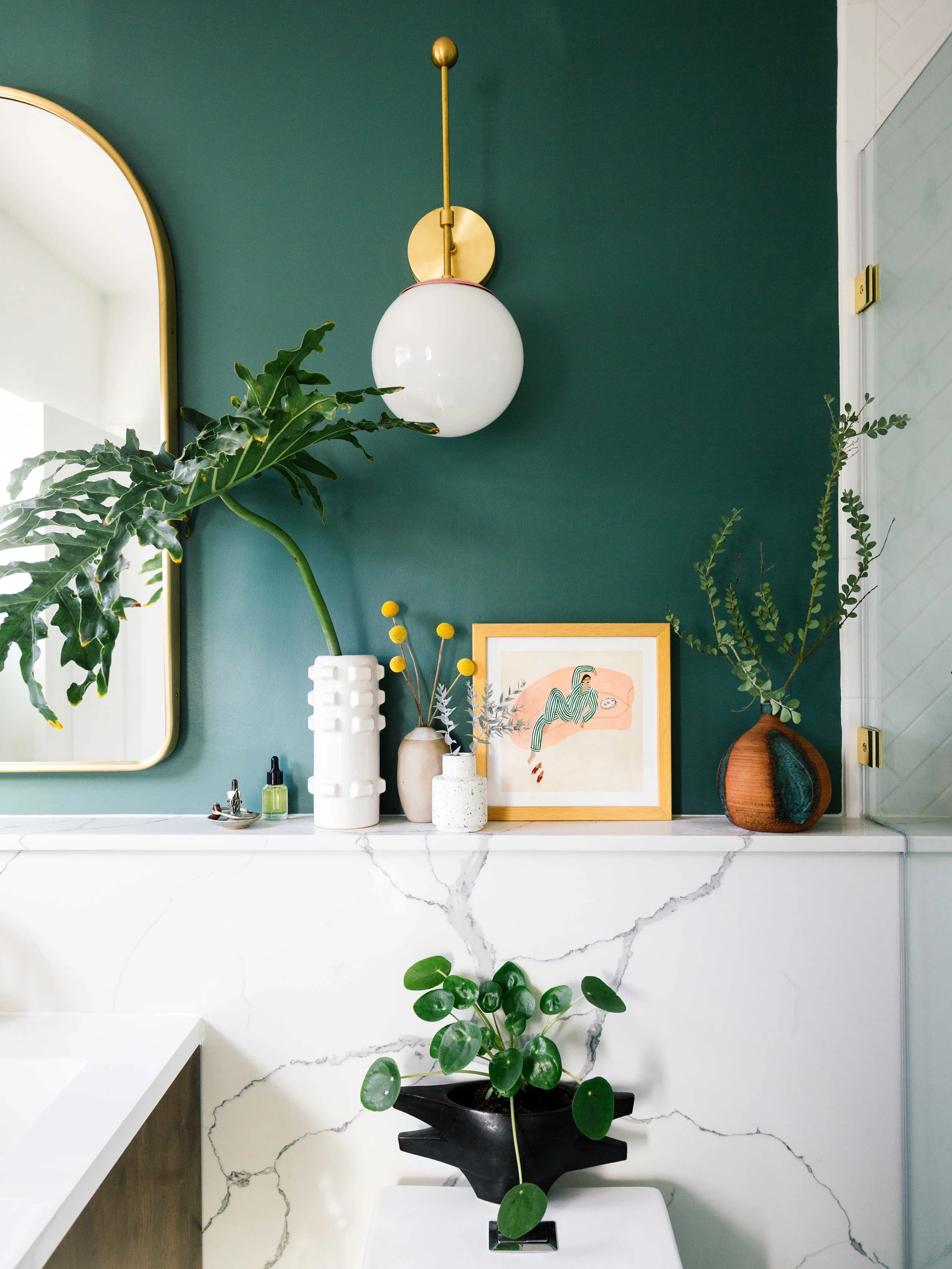 Now, let’s talk about this ledge that runs along this entire wall. It’s 101” w x 44” h x 5” d quartz with grey veins. It’s called Calacatta Alaska. To save a few nickels and dimes, I actually got a pre-fab slab. This adds more surface space to put my toiletries. But to be honest, I just wanted to put more plants and art!! Is it me or does it elongate the bathroom wall so it feels bigger too?