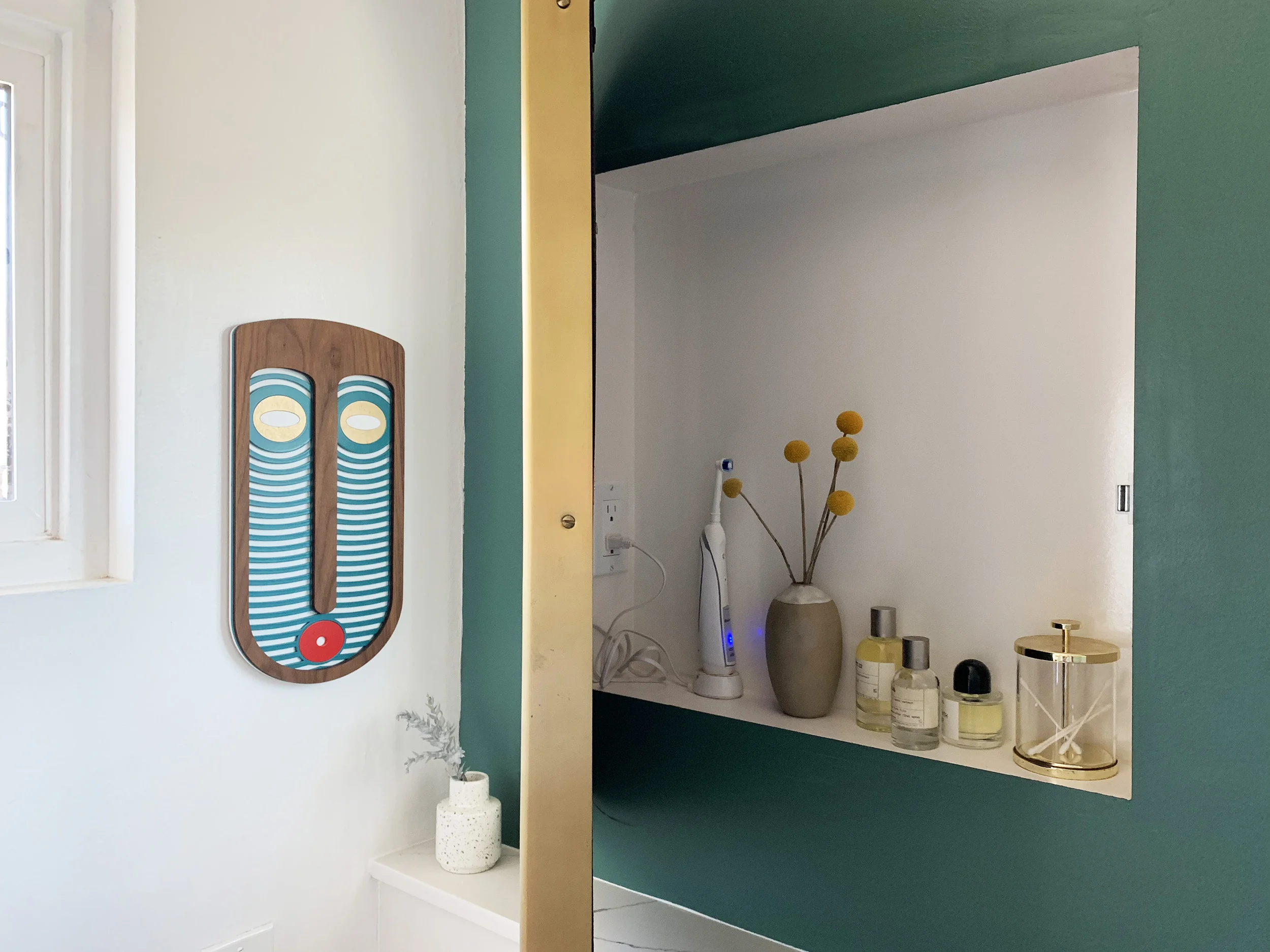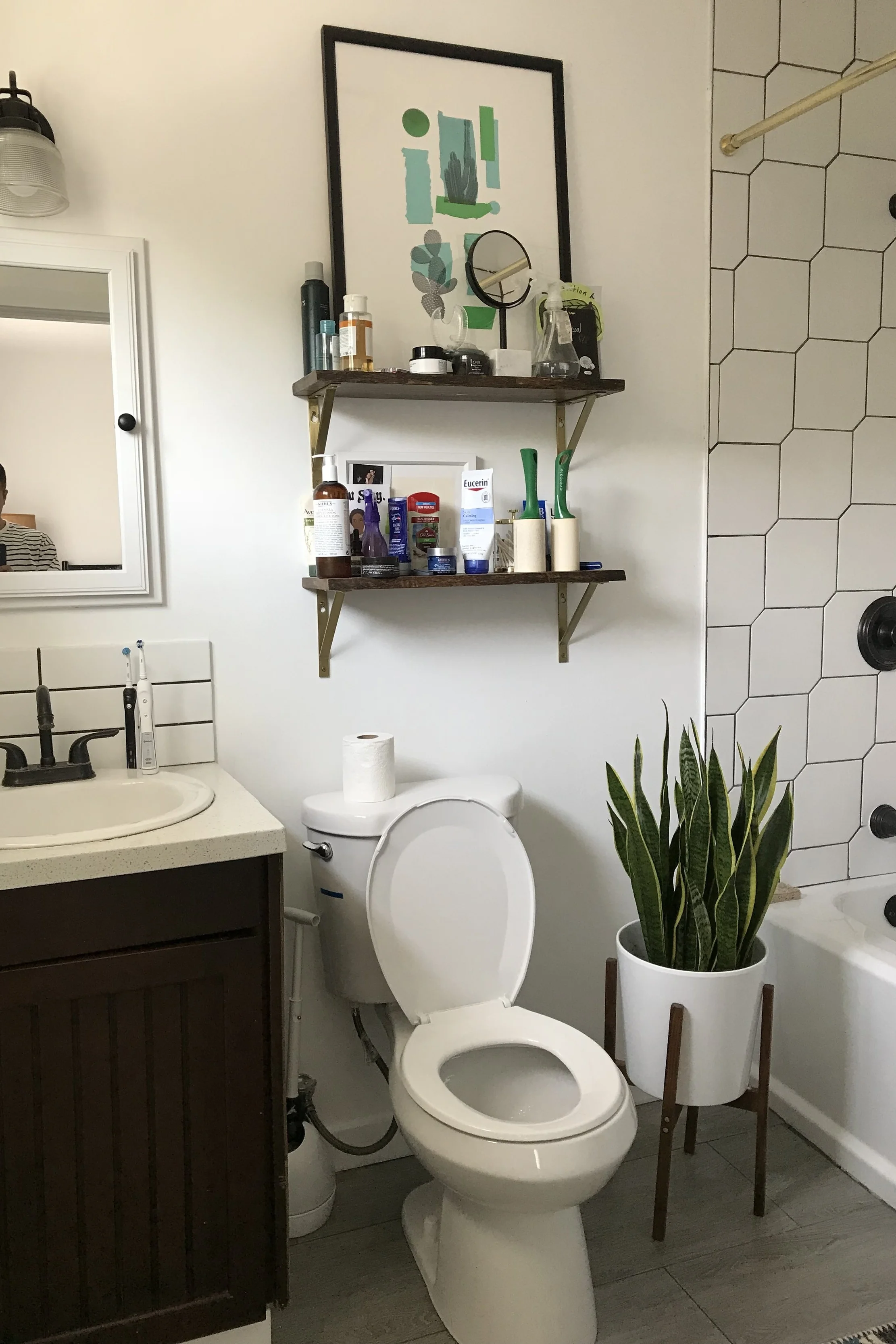 And let’s not forget one of my favorite things I added is this DIY arched medicine cabinet. I asked my dad to create a niche and then used a piano hinge to attach a brass arched mirror to it. Also, I love that we put an outlet in there to hide my electric toothbrush wire. It’s all in the little details! We still need to put some shelves in. The floating cabinet below adds a modern touch and makes the space feel more open.