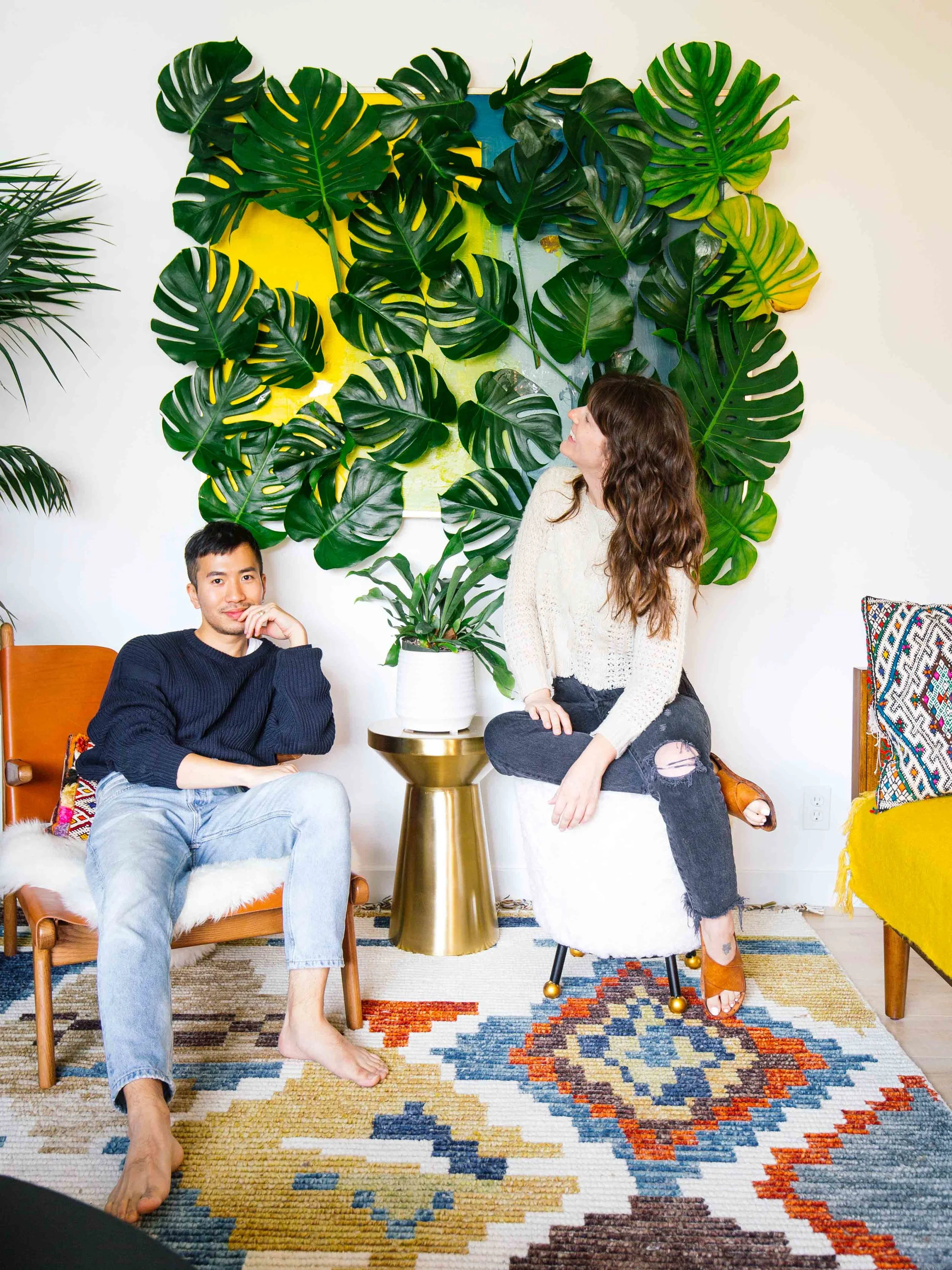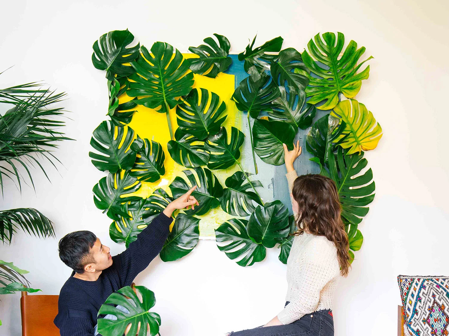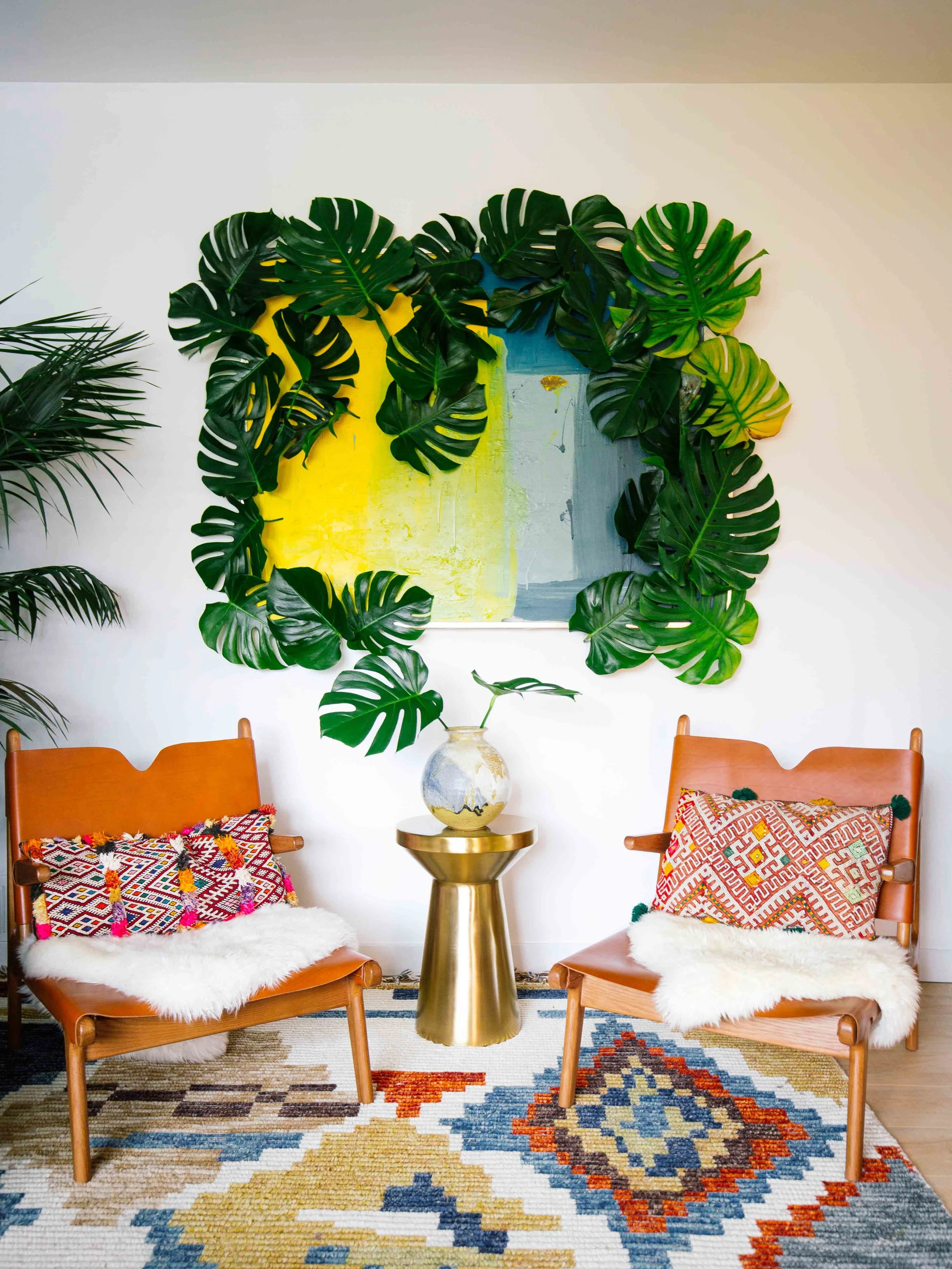 I knew I wanted to include Monsteras (also known as “Swiss Cheese Plants” if you’re not familiar with the official name). Ashley and I laid out all the stems, which were leftovers from a shoot, and started playing around with options. Turns out, Monstera leaves have a mind of their own, and covering an entire wall was pretty tricky! Eventually we had the idea to use them to create a piece of art, concentrating them in one smaller area. I grabbed an old painting I’d thrifted and painted over and we used green floral tape (and a lot of finagling) to cover the whole canvas.