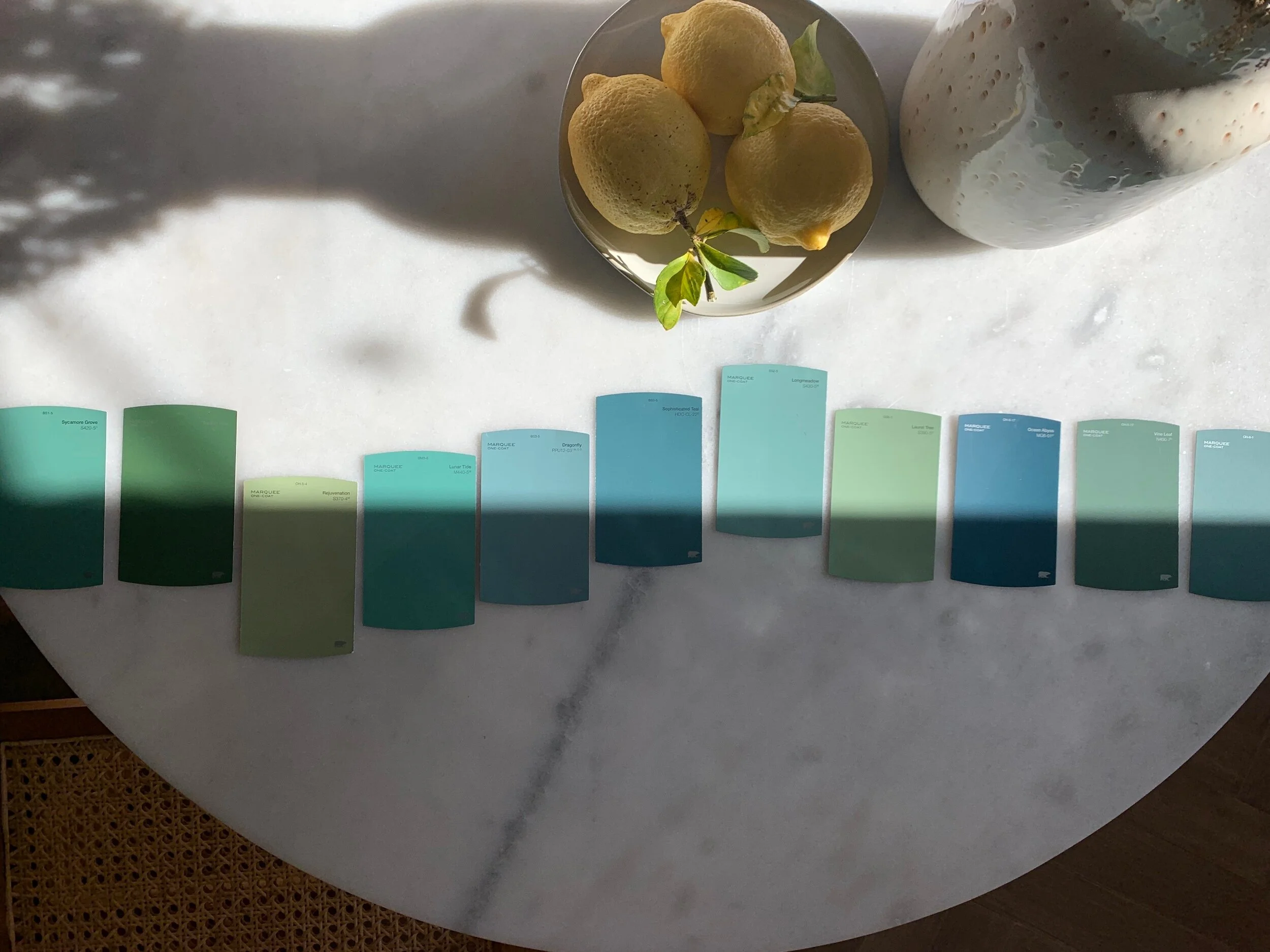 On this week’s episode of our One Room Challenge, we are looking at paint colors. I went to The Home Depot and grabbed a bunch of paint chips in greens and blues. So many pretty colors! I almost just wanna paint each surface a different color!