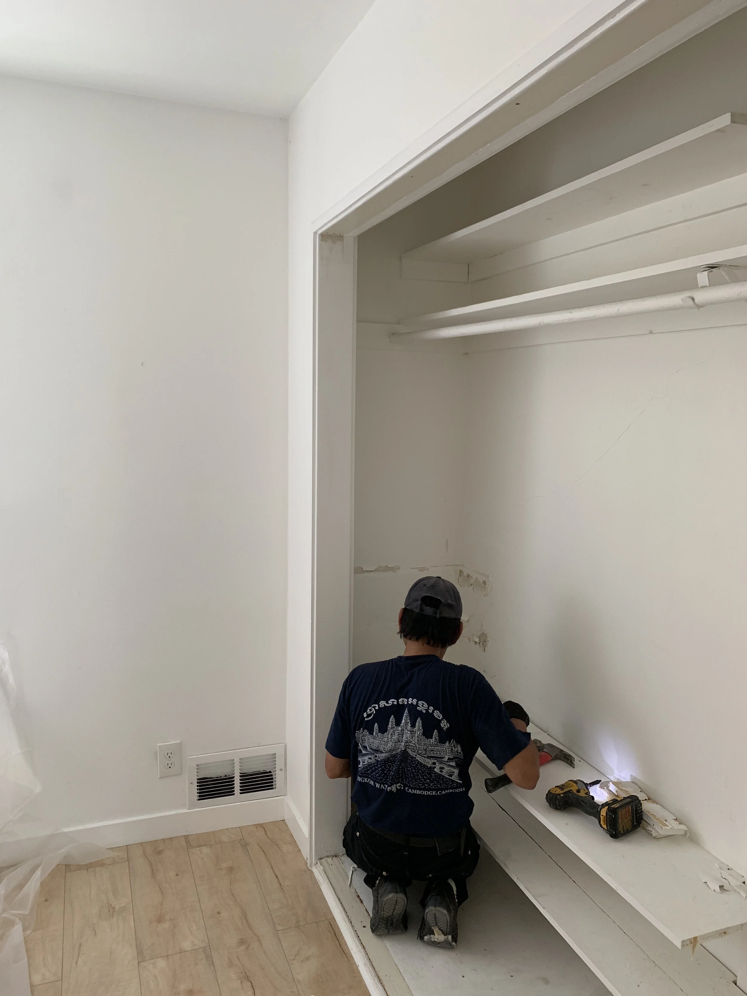 Progress happening over here! On the left side we are floating a desk with some built-in shelves kinda hidden. And over on the right is the closet which we’re gonna install bi-fold doors. We also have herringbone wood floors in here too! Things are shaping up!