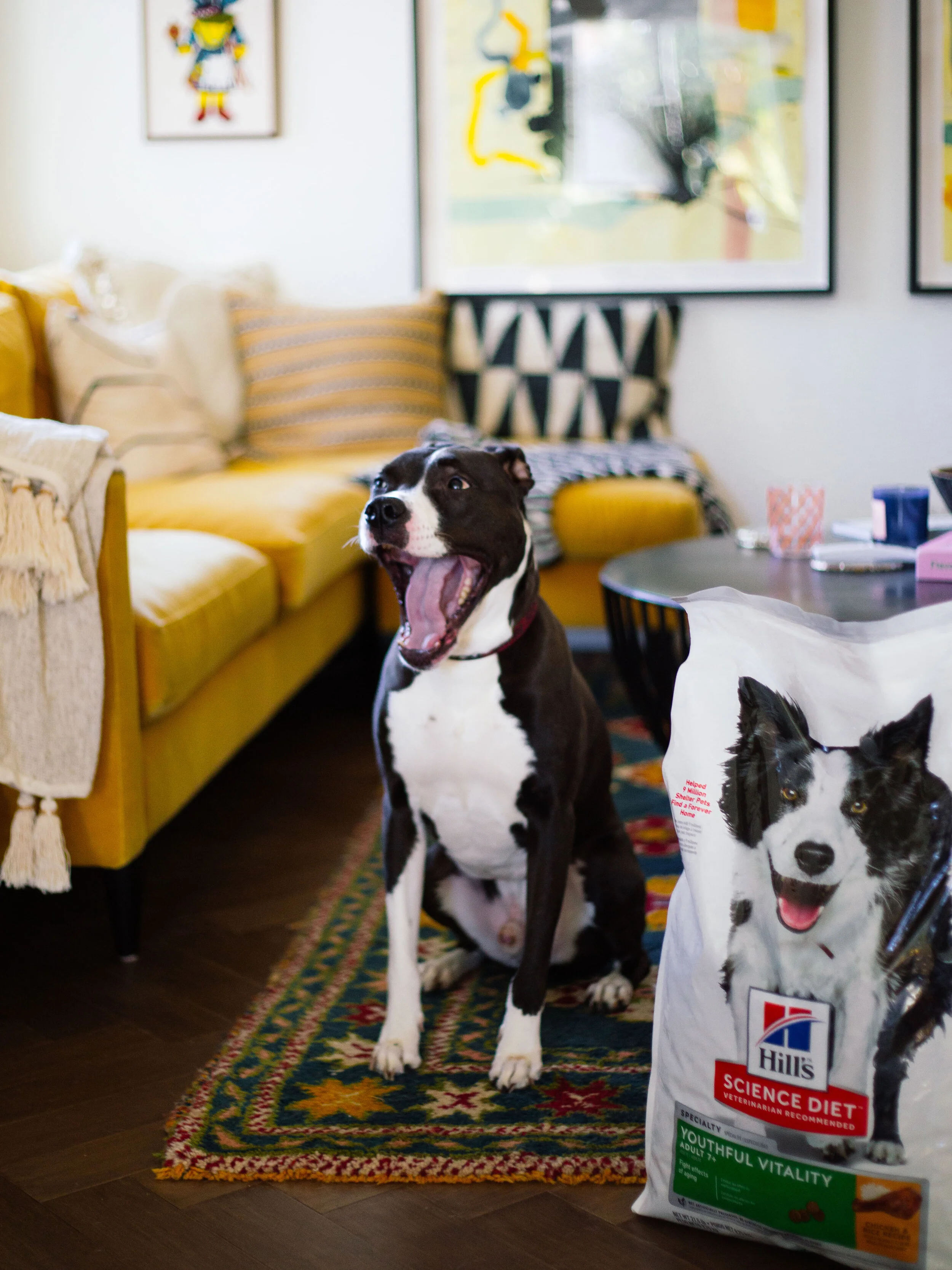 Basically, I was first connected to Hill’s when we adopted Verbena, our 1-year-old kitty and most recent addition. At her first appointment, our vet recommended the brand to give her the nutrition she had been missing (she was so skinny and under-nourished from living on the street). She’s been flourishing since then — honestly the sweetest, cuddliest lap cat ever — which got us thinking about what we’re feeding our pups Luigi and Sterling as well. Then, once I teamed up with Hill’s Pet Nutrition and learned about their various types of food to benefit different pet needs, I knew it was time to make a change.
