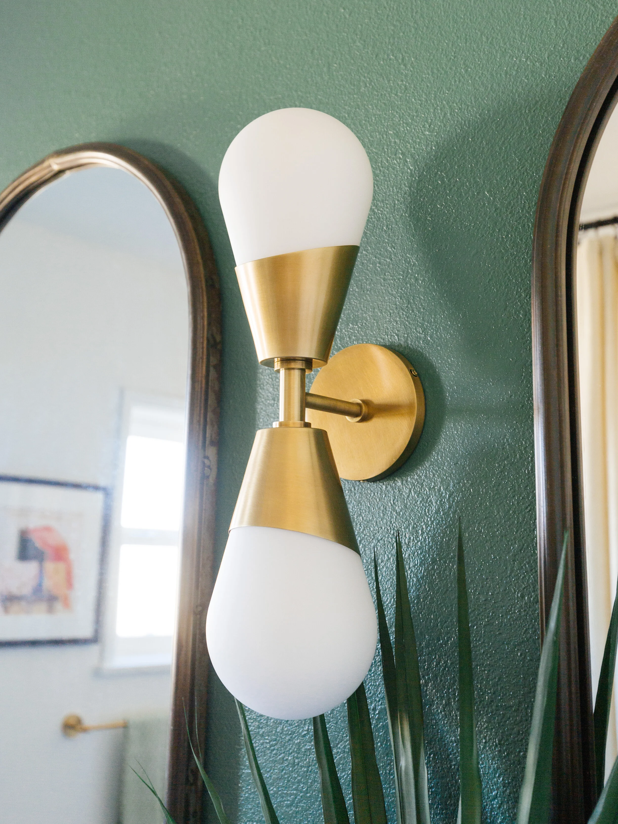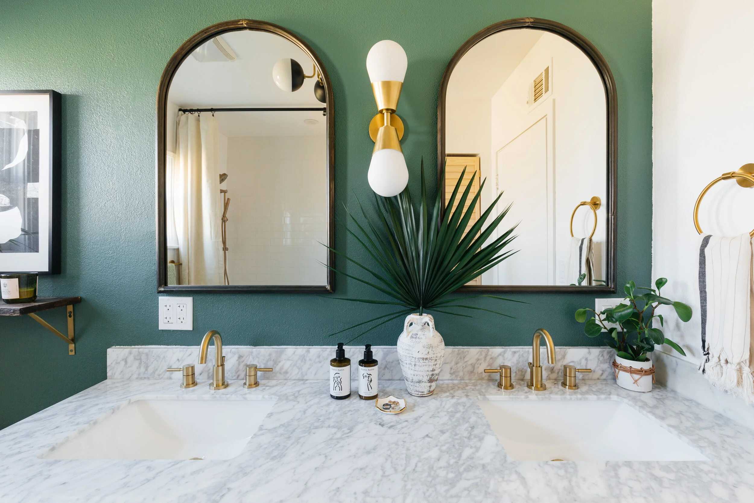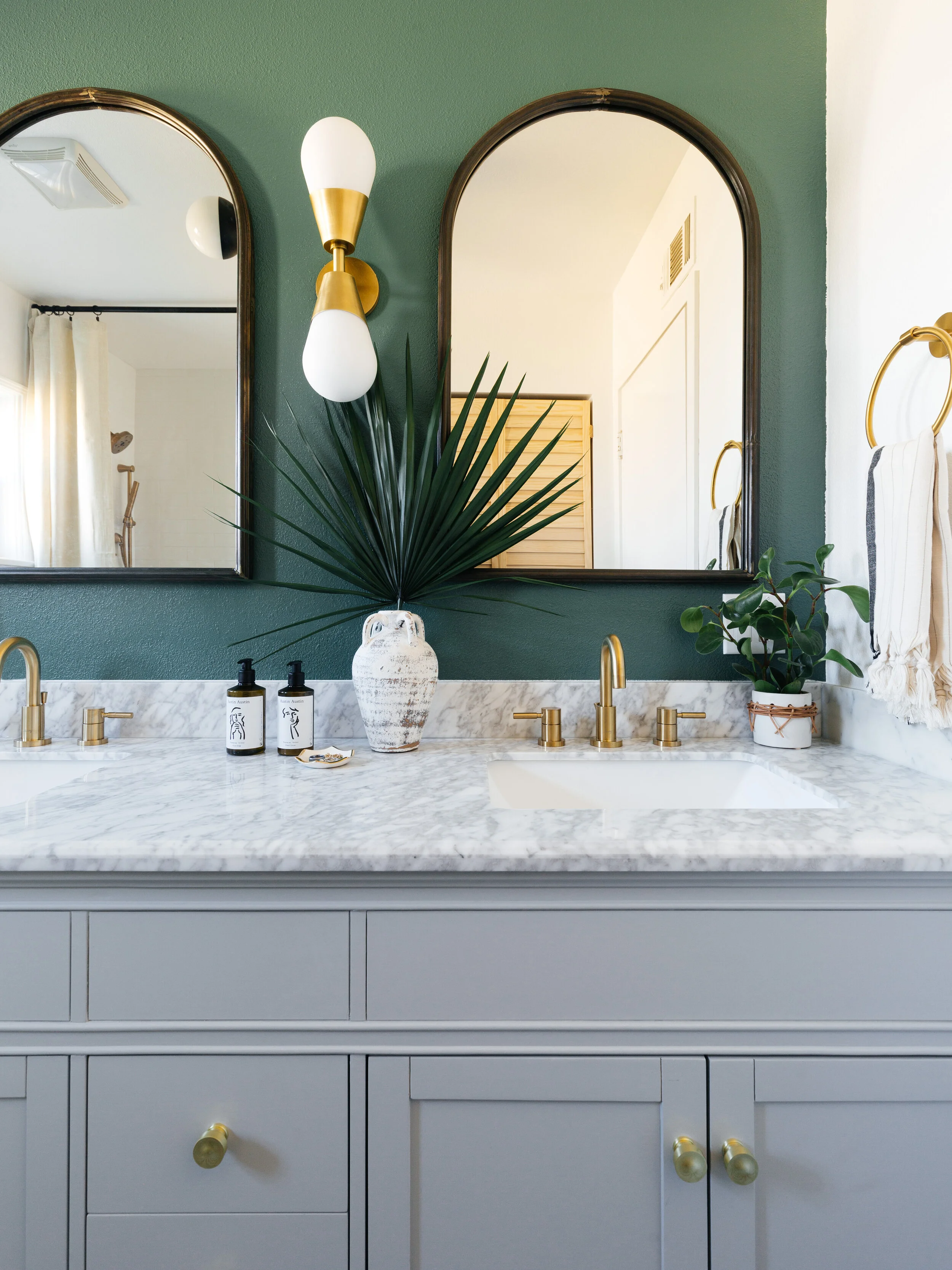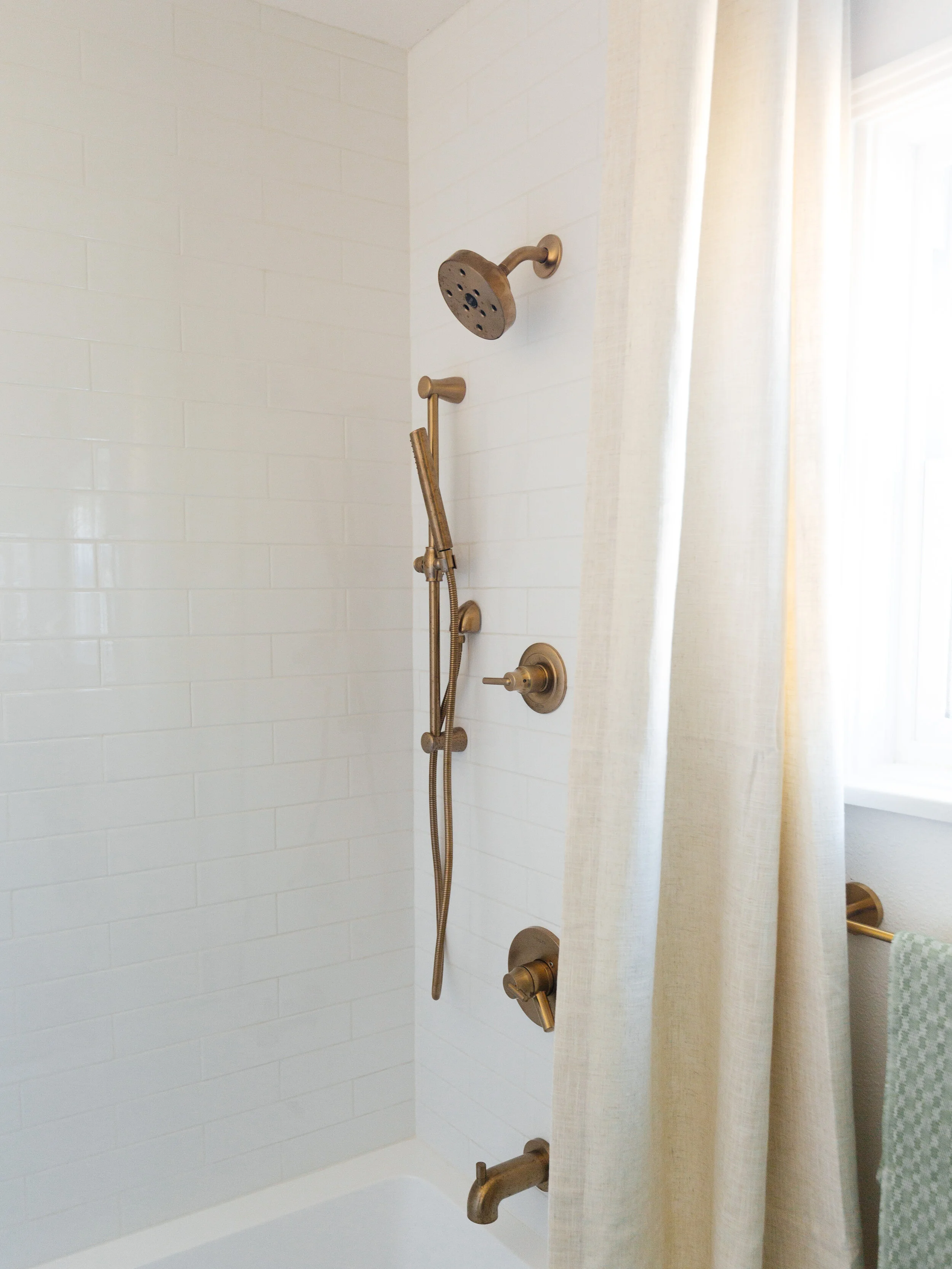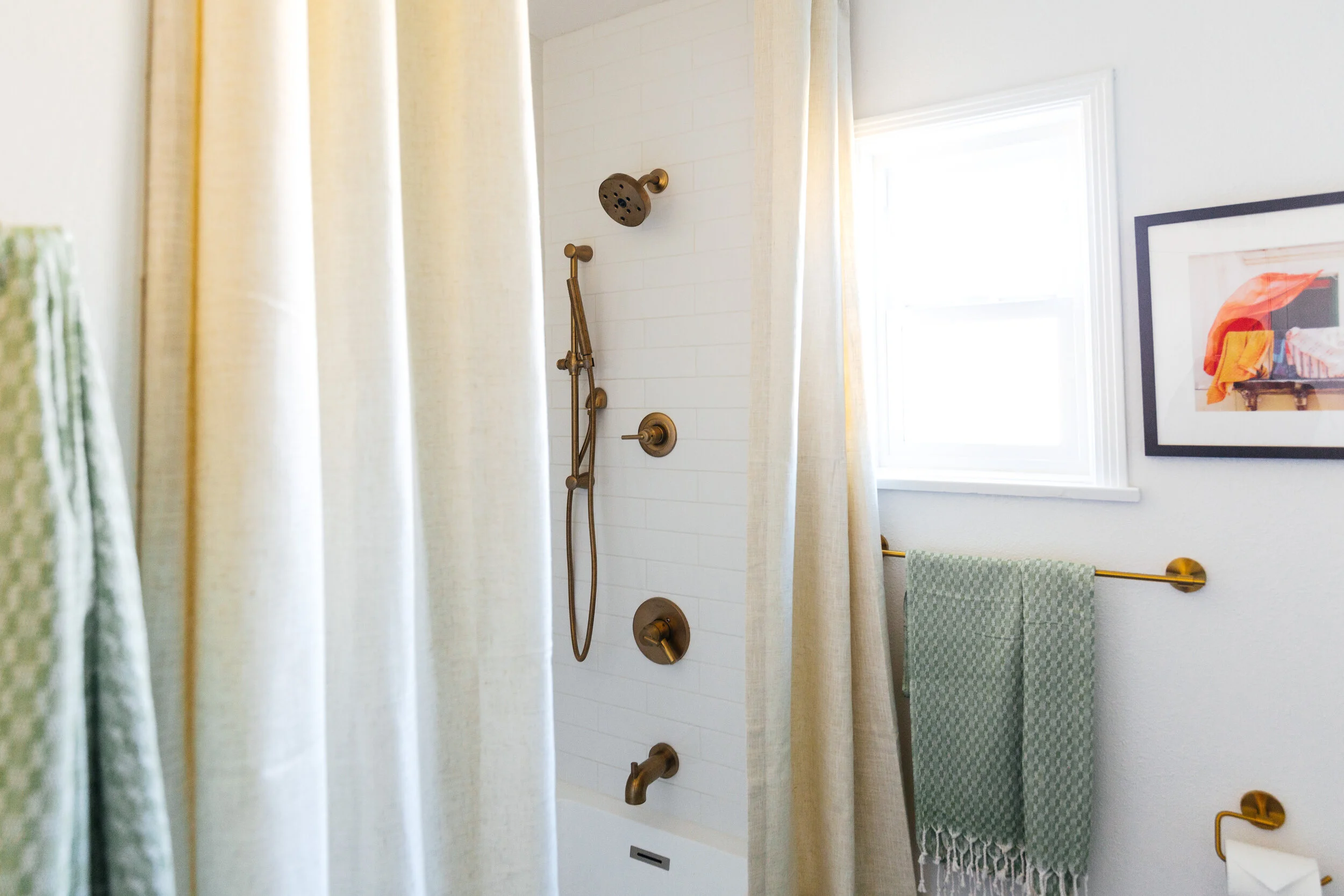 I chose to hang arched mirrors because they add an architectural element to the space. We hung the curtain rod all the way up to the ceiling to accentuate the height. I think it’s so odd that standard shower curtains are so short or why they’re never hung in pairs just like windows. By hanging linen curtains floor to ceiling just makes the shower feel more luxurious and romantic, doesn’t it?