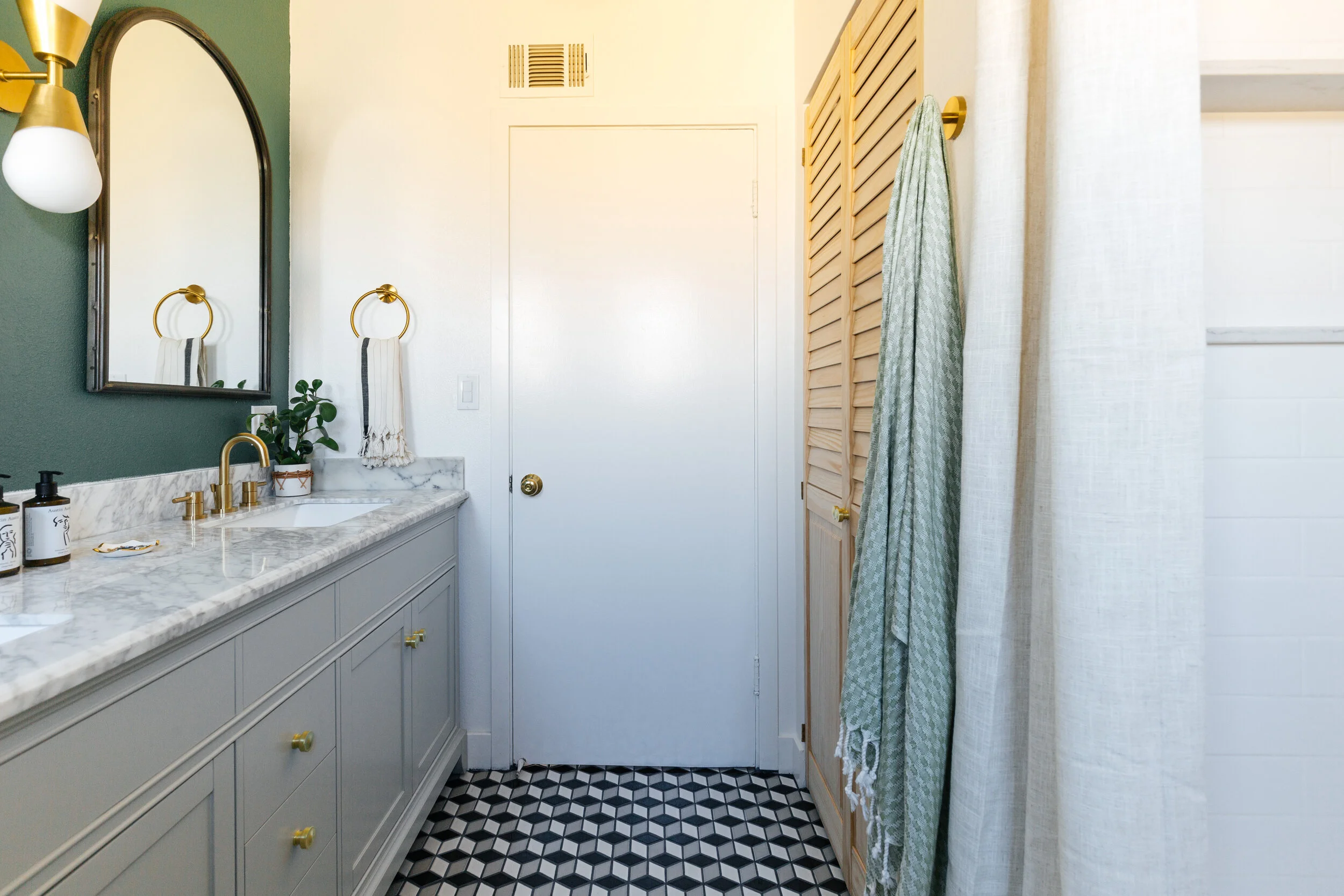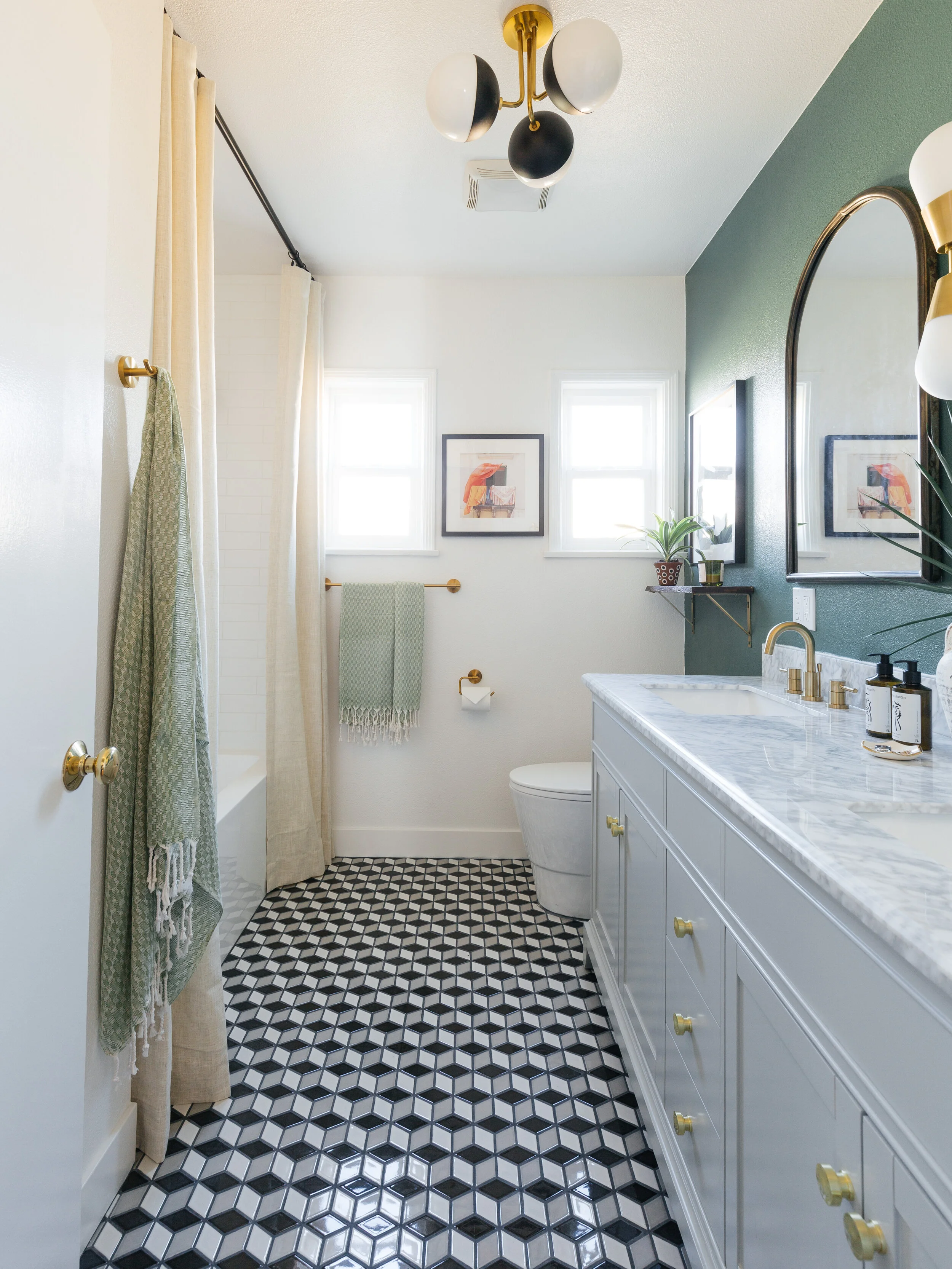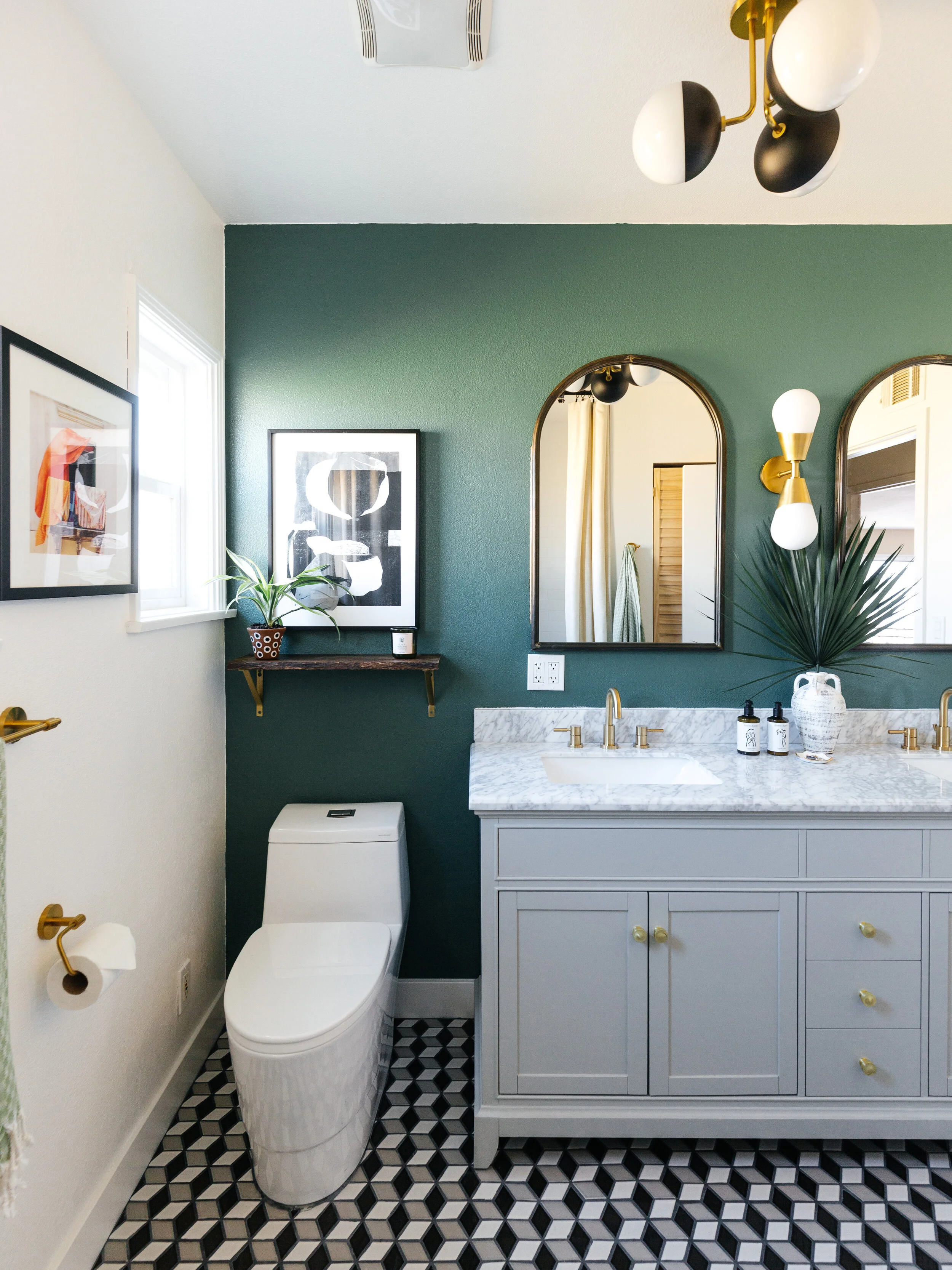 After we nailed the layout, we thought about what kind of bold designs and details to add to the space. This room itself isn’t that interesting so by adding these prism mosaic tiles from Floor Decor, it makes the space visually more exciting. You can never go wrong with a tumbling tile pattern. I chose dove grey grout to make the pattern stand out even more. And then we painted the vanity wall a dark foresty green. We didn’t want the room to be too white but didn’t want it to feel too dark either so an accent wall is a great way to add visual interest without being overwhelming.