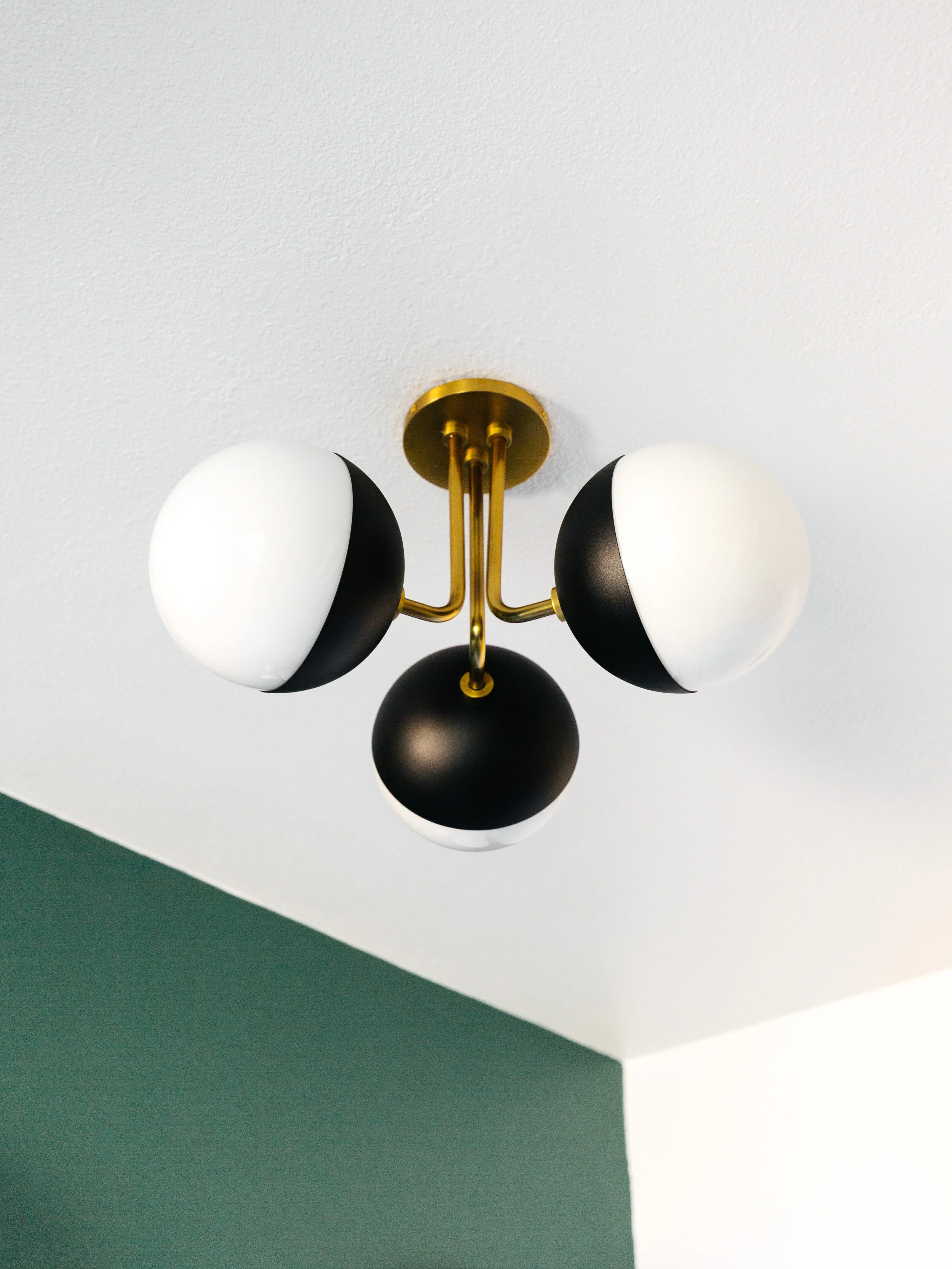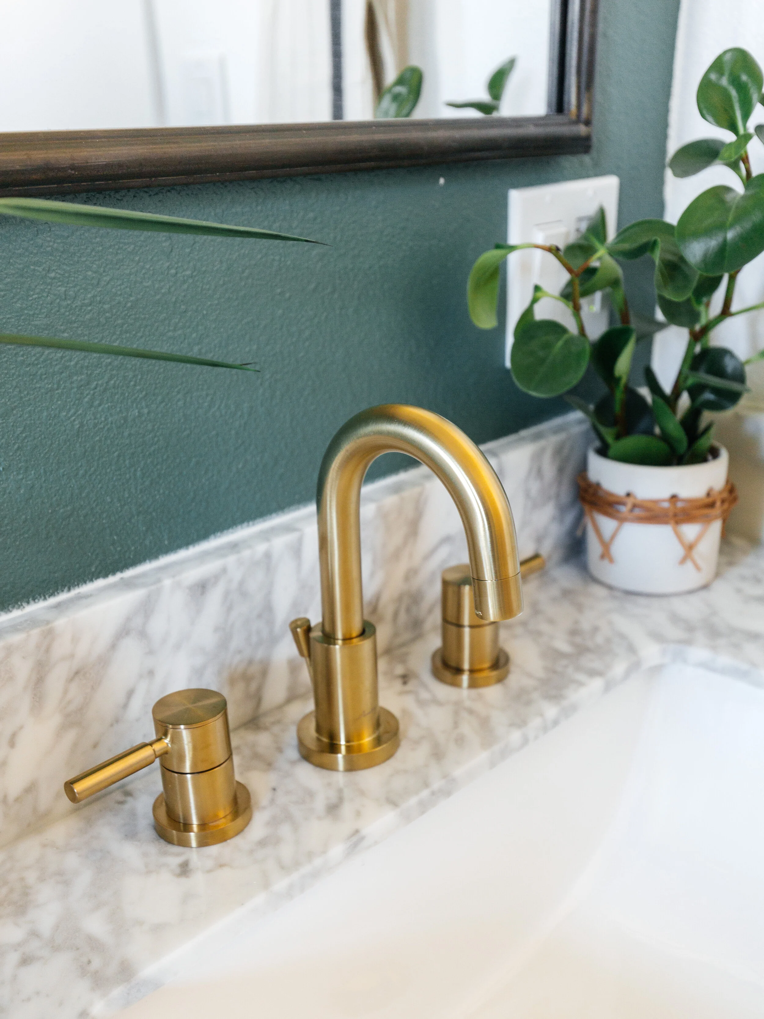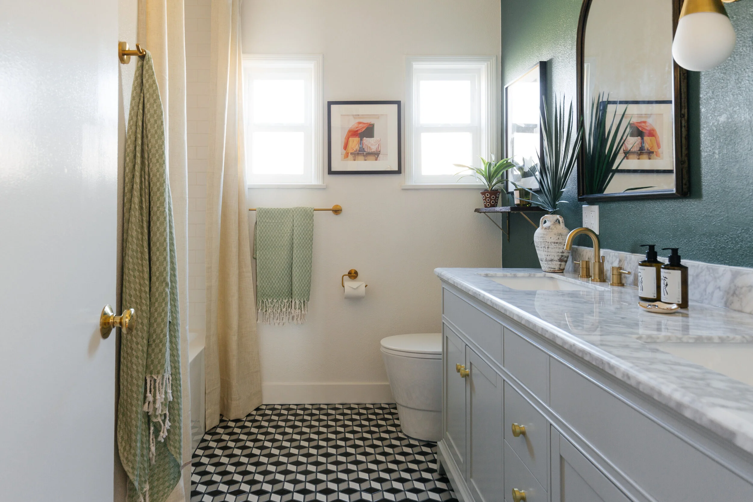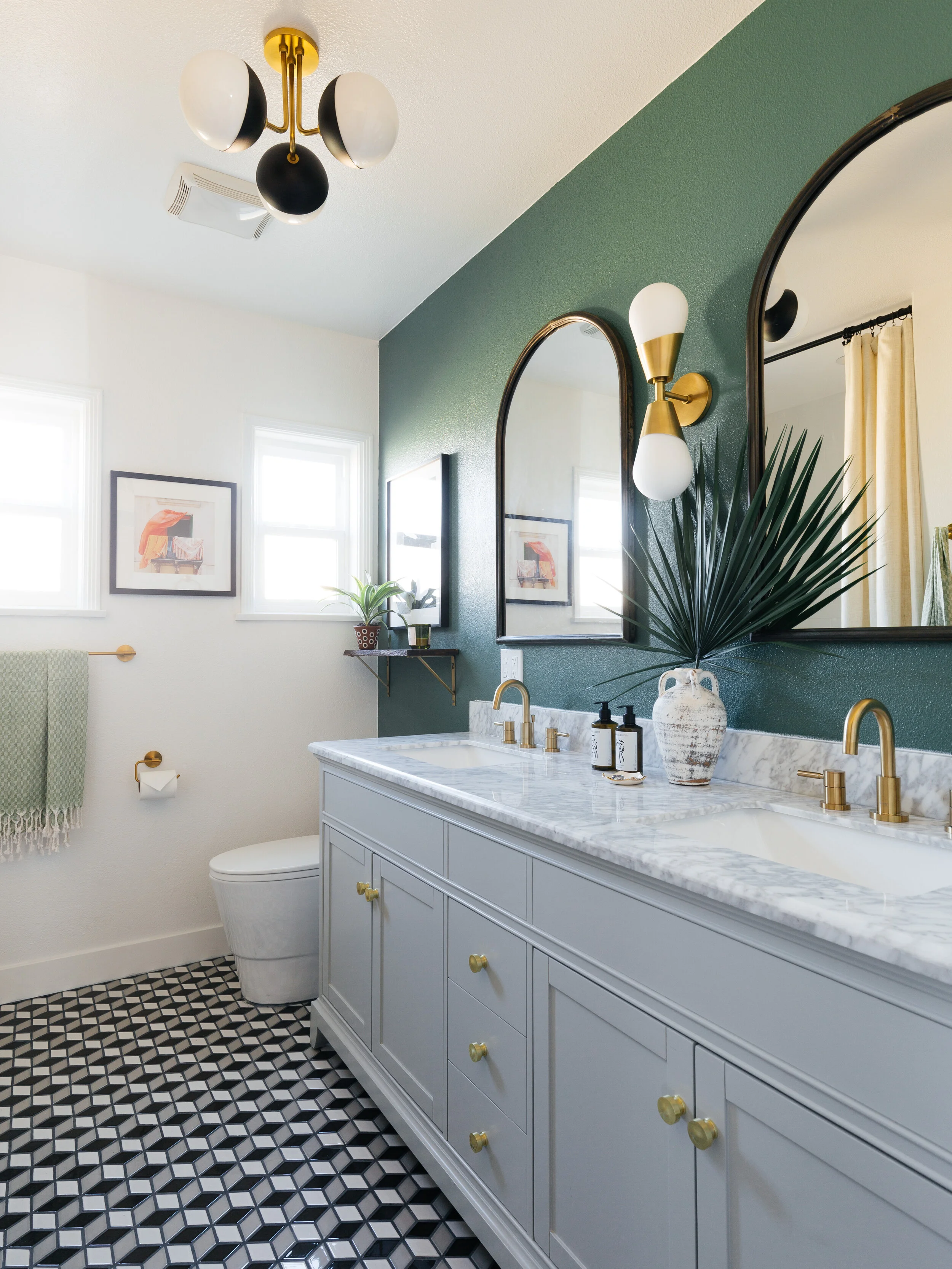 After we nailed the layout, we thought about what kind of bold designs and details to add to the space. This room itself isn’t that interesting so by adding these prism mosaic tiles from Floor Decor, it makes the space visually more exciting. You can never go wrong with a tumbling tile pattern. I chose dove grey grout to make the pattern stand out even more. And then we painted the vanity wall a dark foresty green. We didn’t want the room to be too white but didn’t want it to feel too dark either so an accent wall is a great way to add visual interest without being overwhelming.