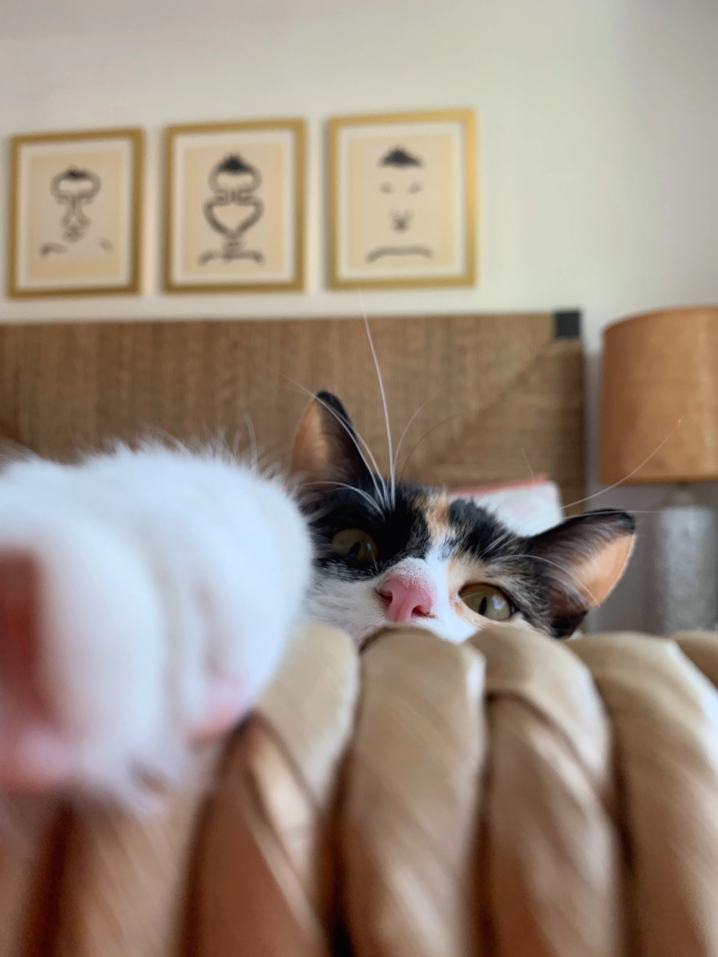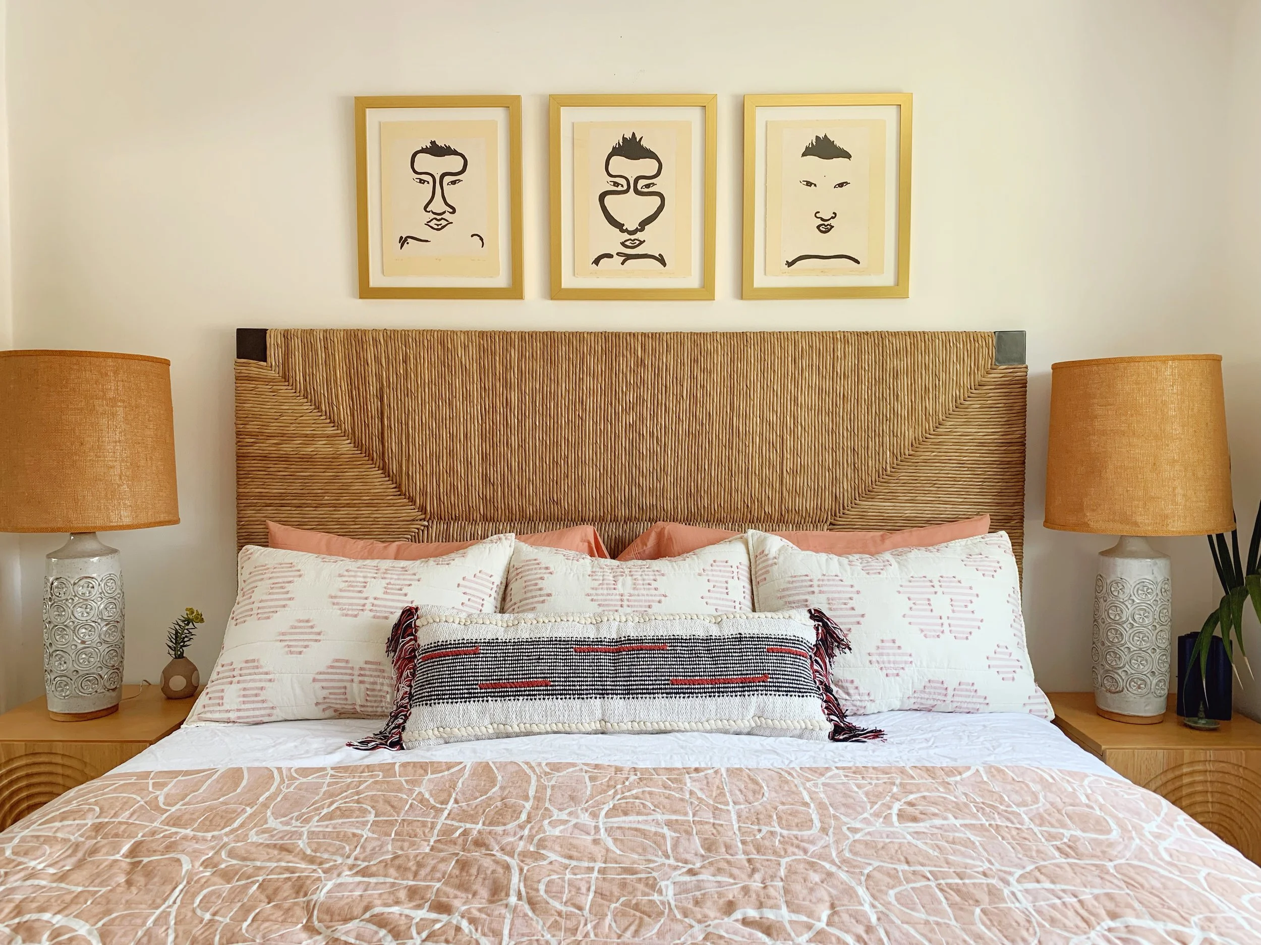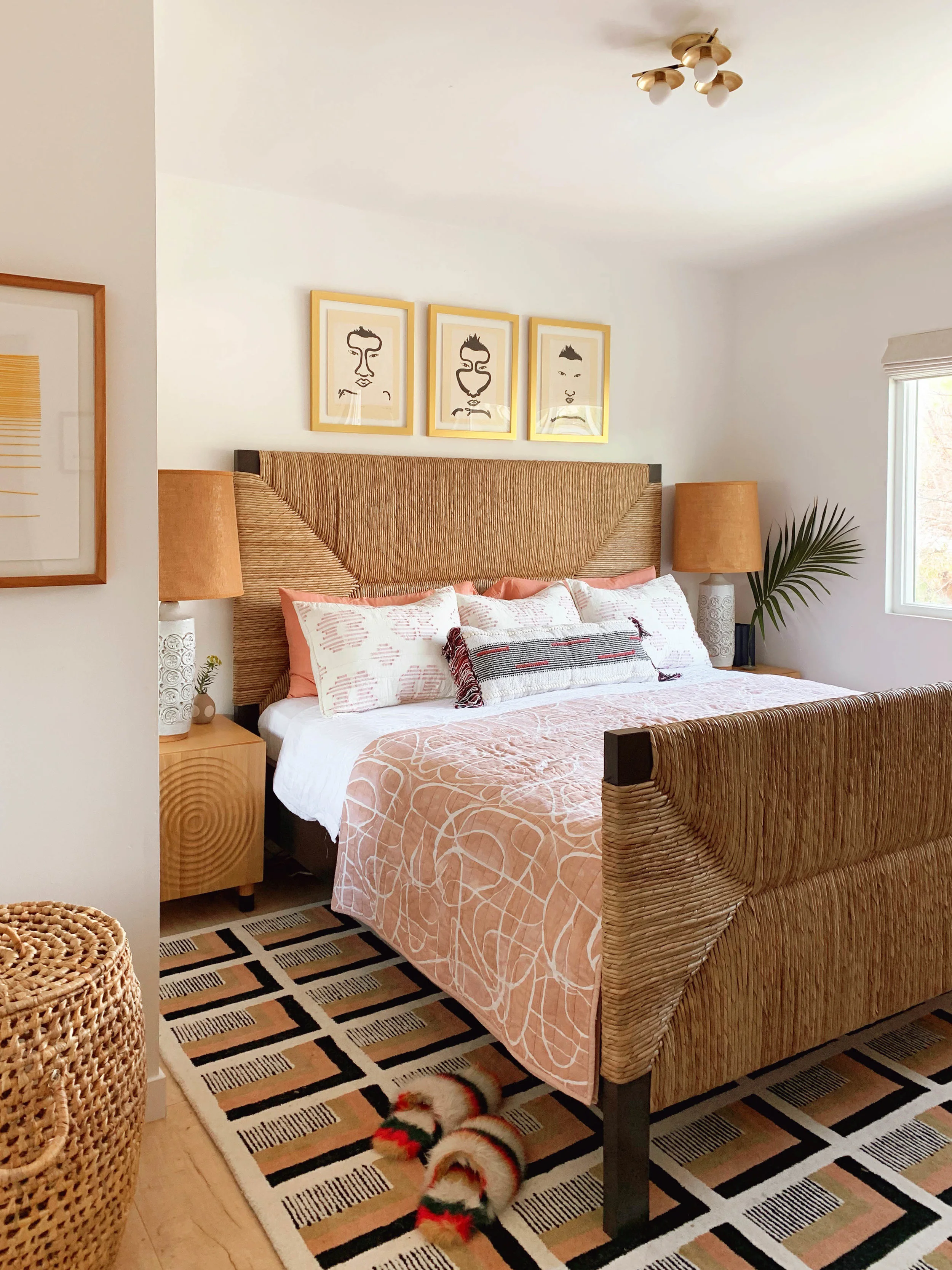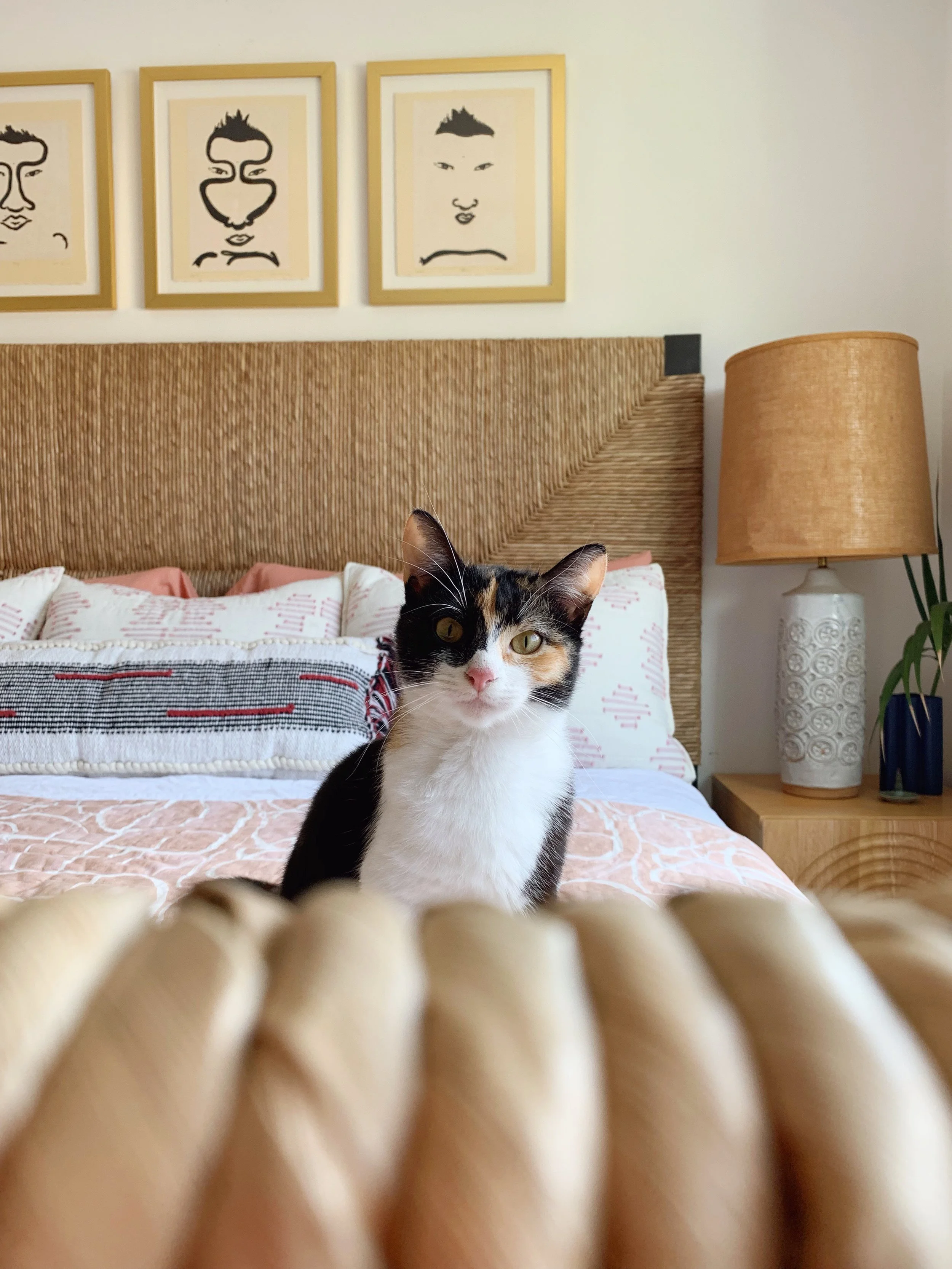 After working on my family’s bedroom makeover, it was time to do a little refresh on ours! The colors are inspired by our little Verbena. That teeny tiny pink nose and her calico coat. Have I introduced her to y’all on here?! So we sold our New Orleans home at the end of December and as we were packing up, I saw this little kitty roaming around our house. She was super sweet and friendly so we decided to keep her. We named her after our street. It was meant to be. Never in a million years did I ever think I’ll have a cat. But here she is and she’s getting along with our pups! Anywho, I’m loving all these blush and beige vibes!
