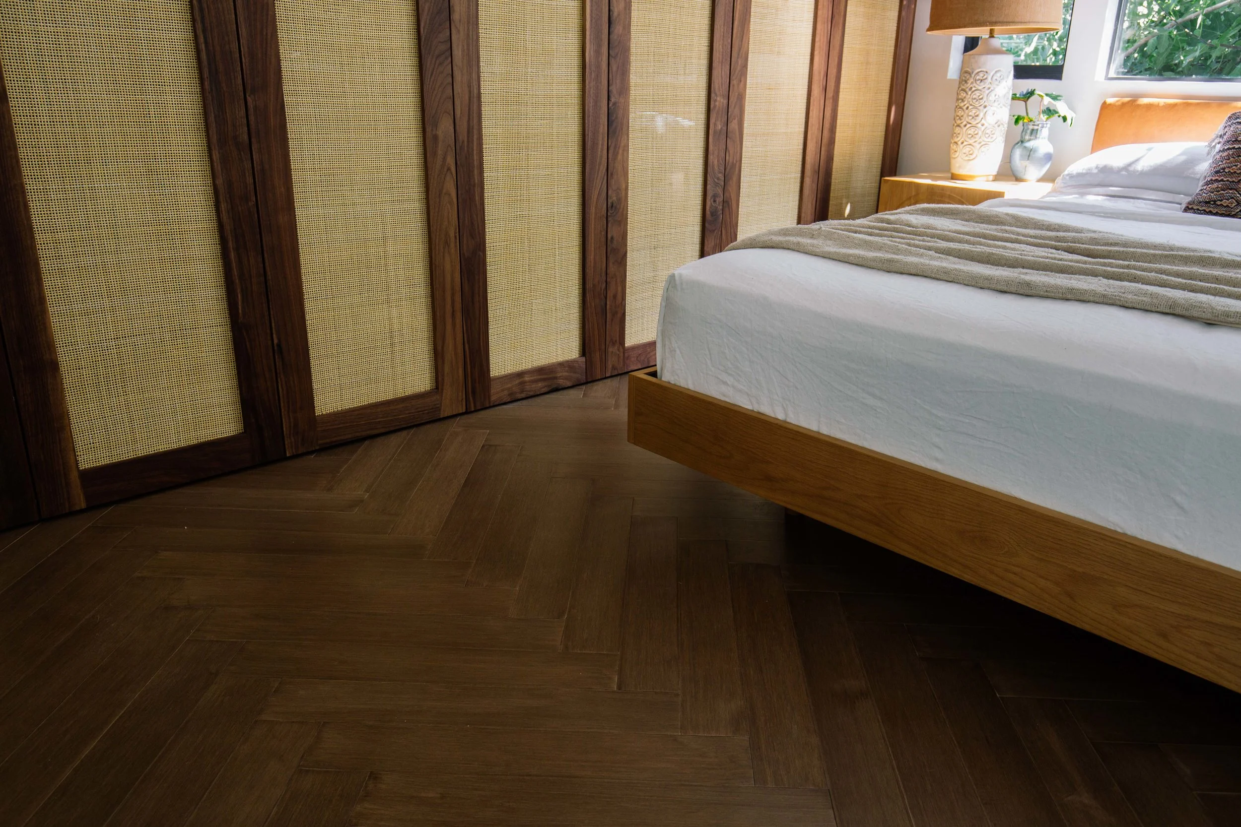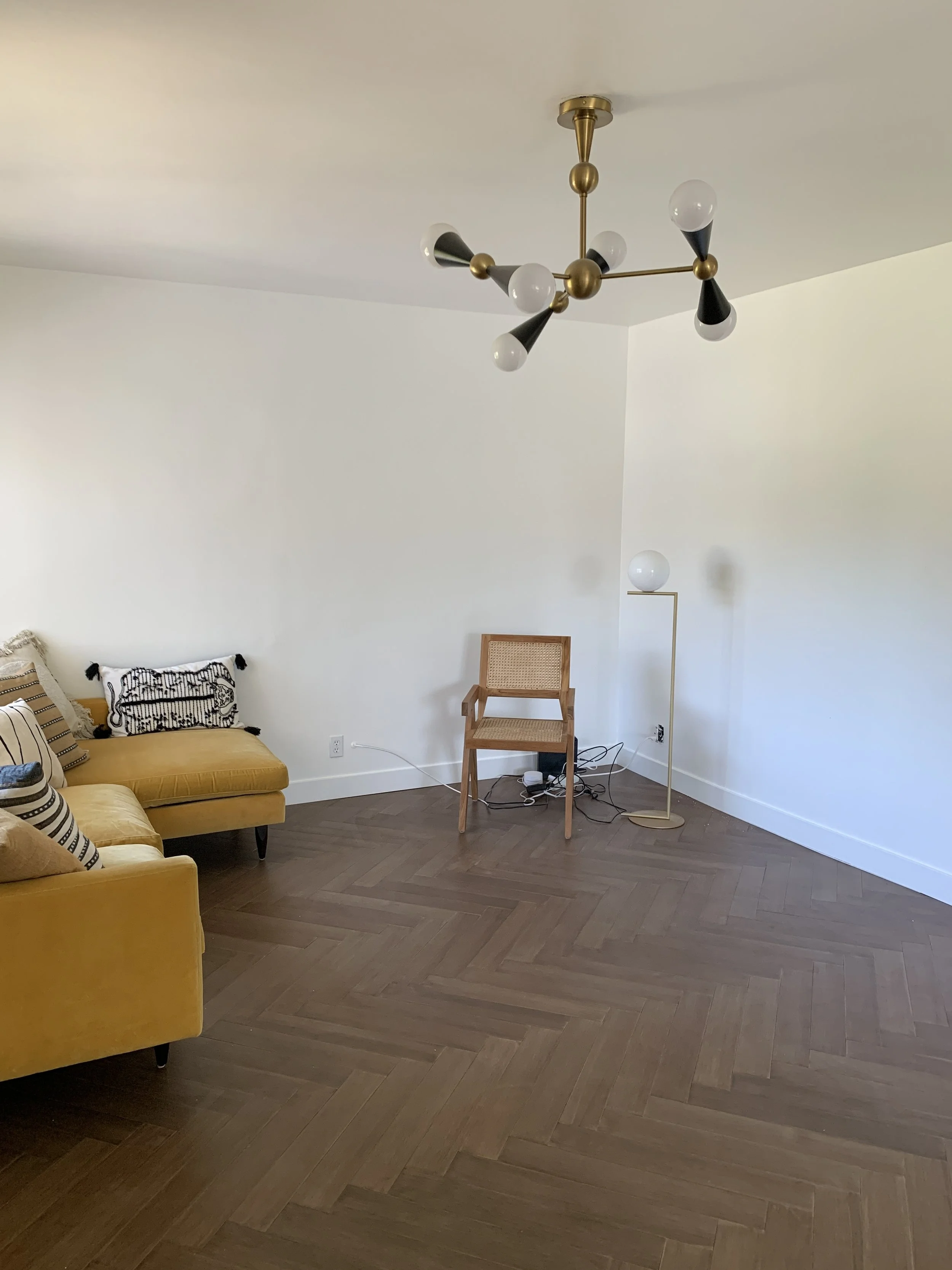 Let me also show you what the living room looks like. Herringbone wood floors adds a touch of elegance, doesn't it? What do you guys think?! After all said and done, materials and labor cost us a little over $9000. I love how it completely transformed our home. I don’t think I’m ever gonna leave our bedroom, to be honest. Now hop on over to Floor & Decor for more floor inspiration and check out their other fabulous herringbone options.