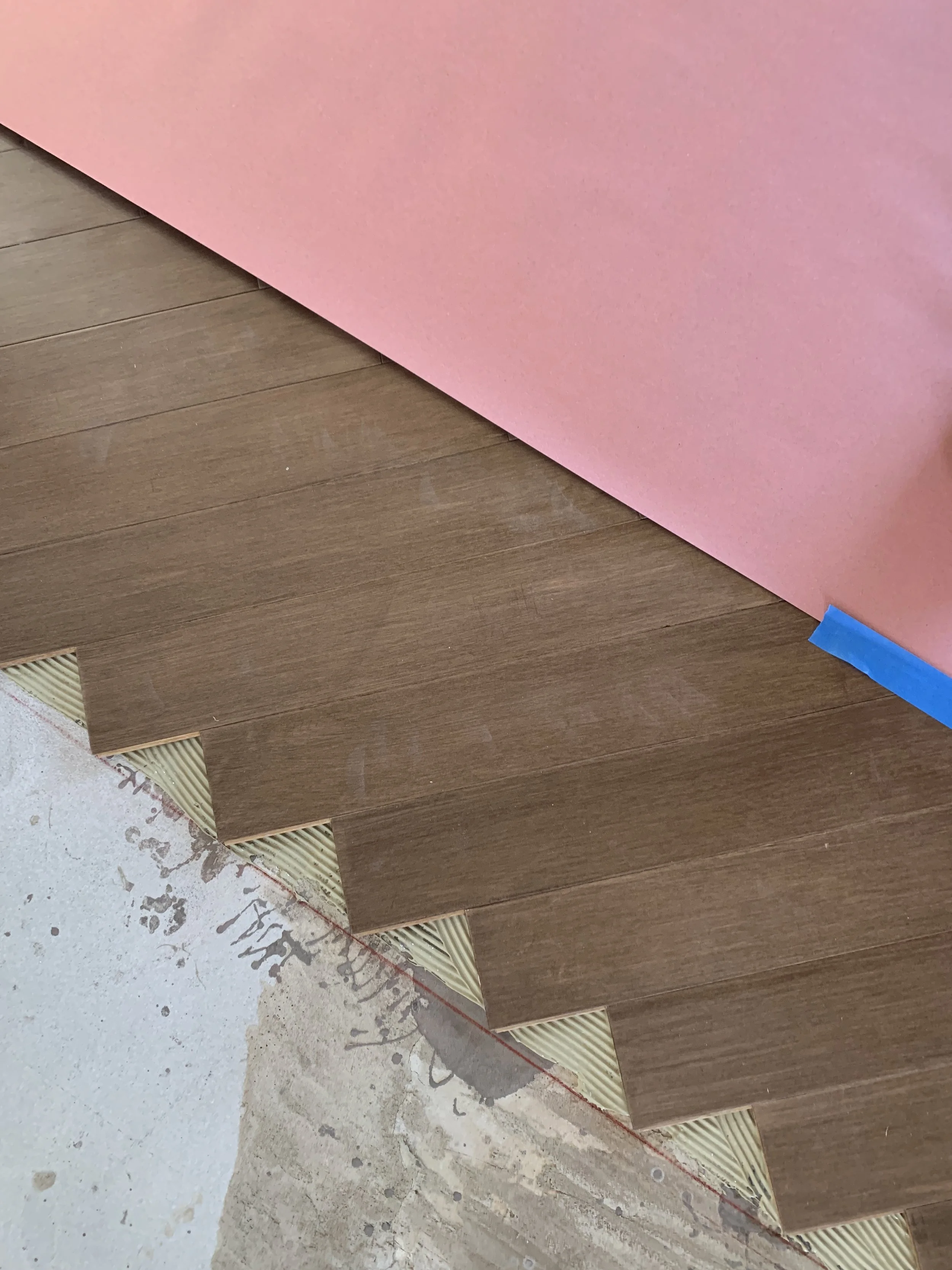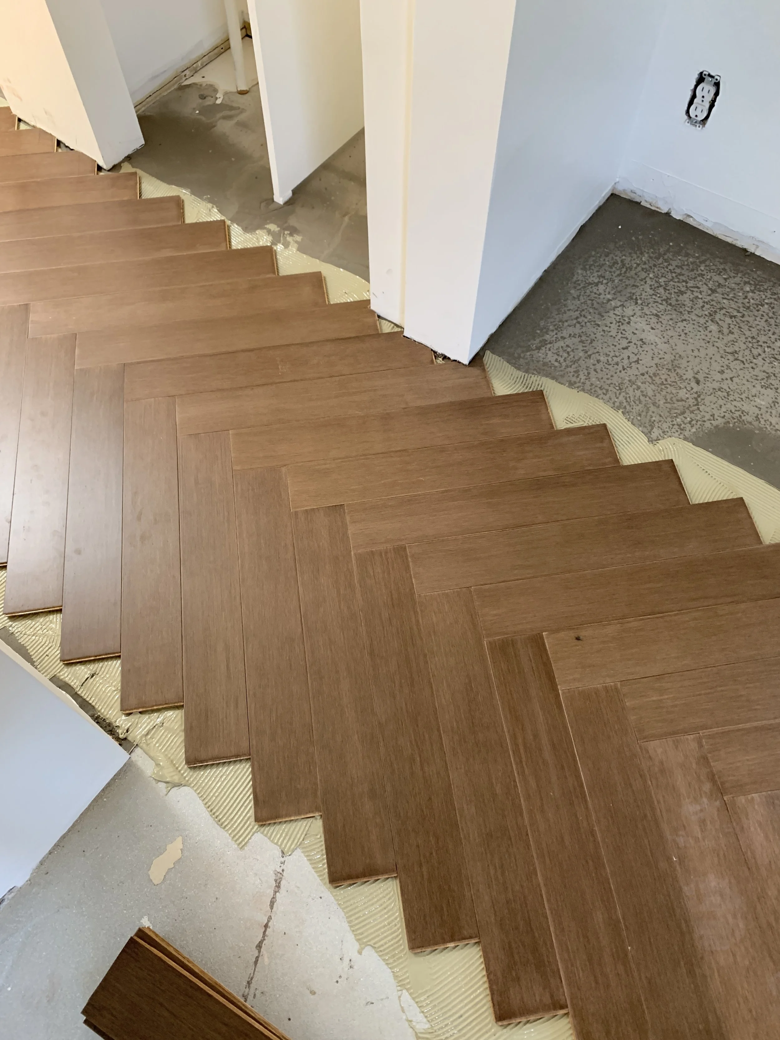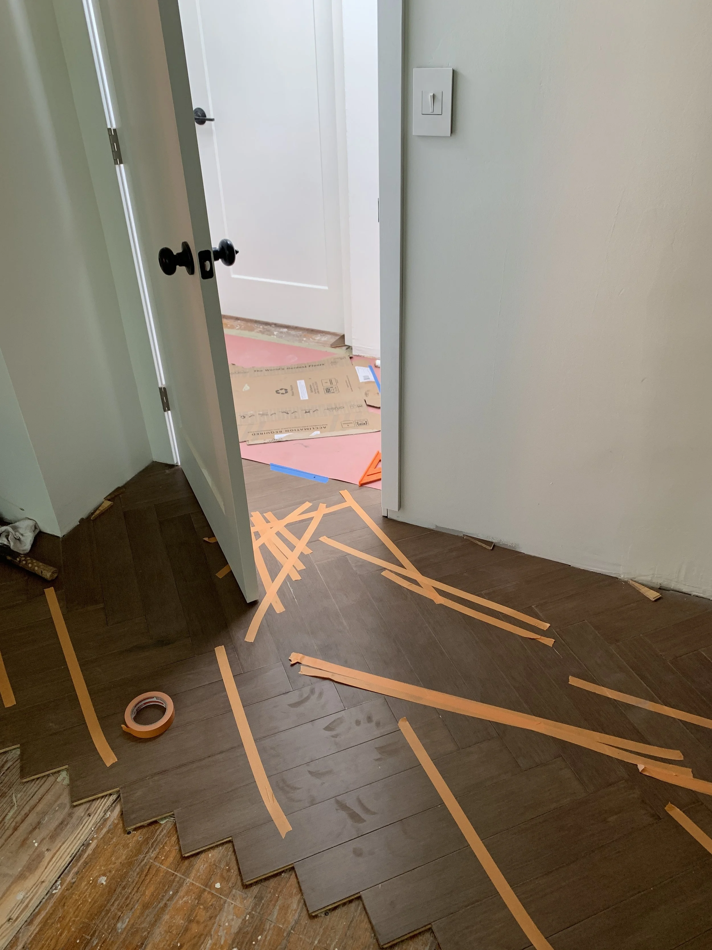 We started the install of the herringbone floors in the hallway first because I wanted to make sure there was a center line and then we moved into the rest of the spaces.