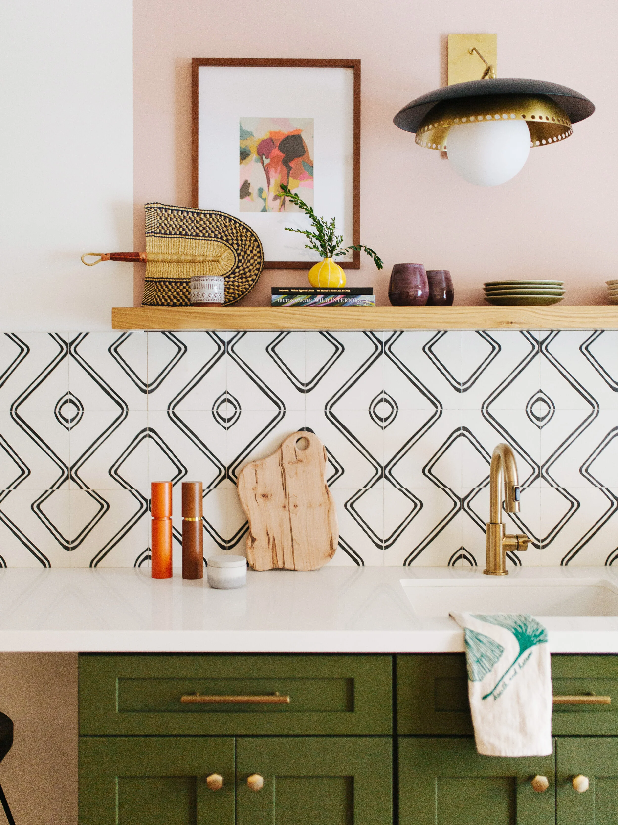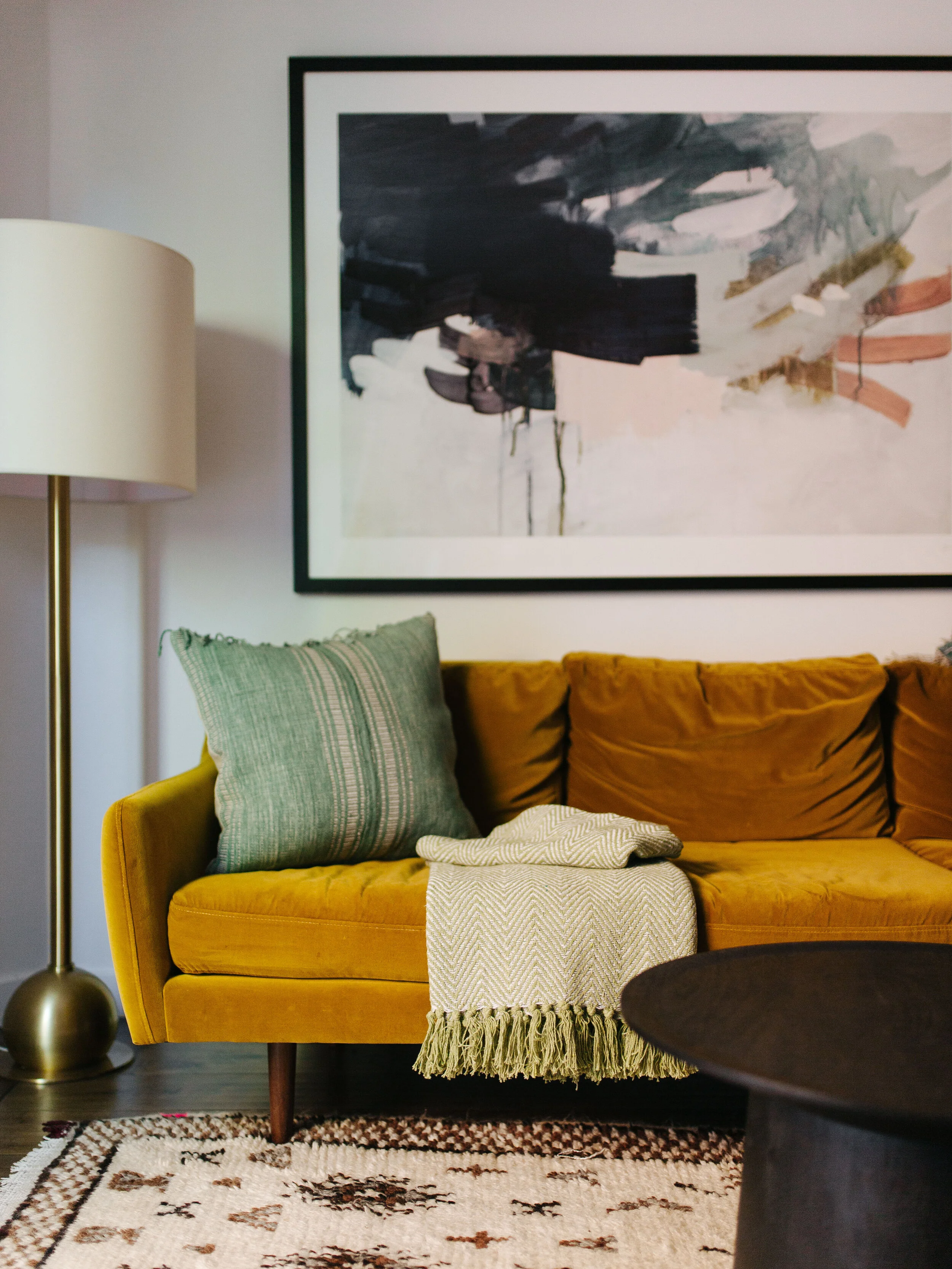 For those who have been spending a lot of extra time in the kitchen these days (perfecting their bread recipes and such!) a stylish salt cellar is also a must. What I loved about this one is that it’s minimally designed so it can work seamlessly with any decor, and the cast concrete material gives it weight that makes it feel chef-worthy. This maple wood cutting board instantly caught my eye because of its natural striping and shape. I can just picture how perfect it would be with some cheese and charcuterie, so I’ll give this to another friend who loves to entertain! I could even pair it with this ginkgo leaf print tea towel for a sweet little hostess or housewarming gift. Of course for me no room is complete two important things: pops of color and wall decor. I think this bright yellow bud vase filled with some fresh herbs would make a sunny addition to any kitchen and this seagrass and leather African fan and this framed abstract print could help make it feel more eclectic and personalized — crucial to all Dab-approved spaces.