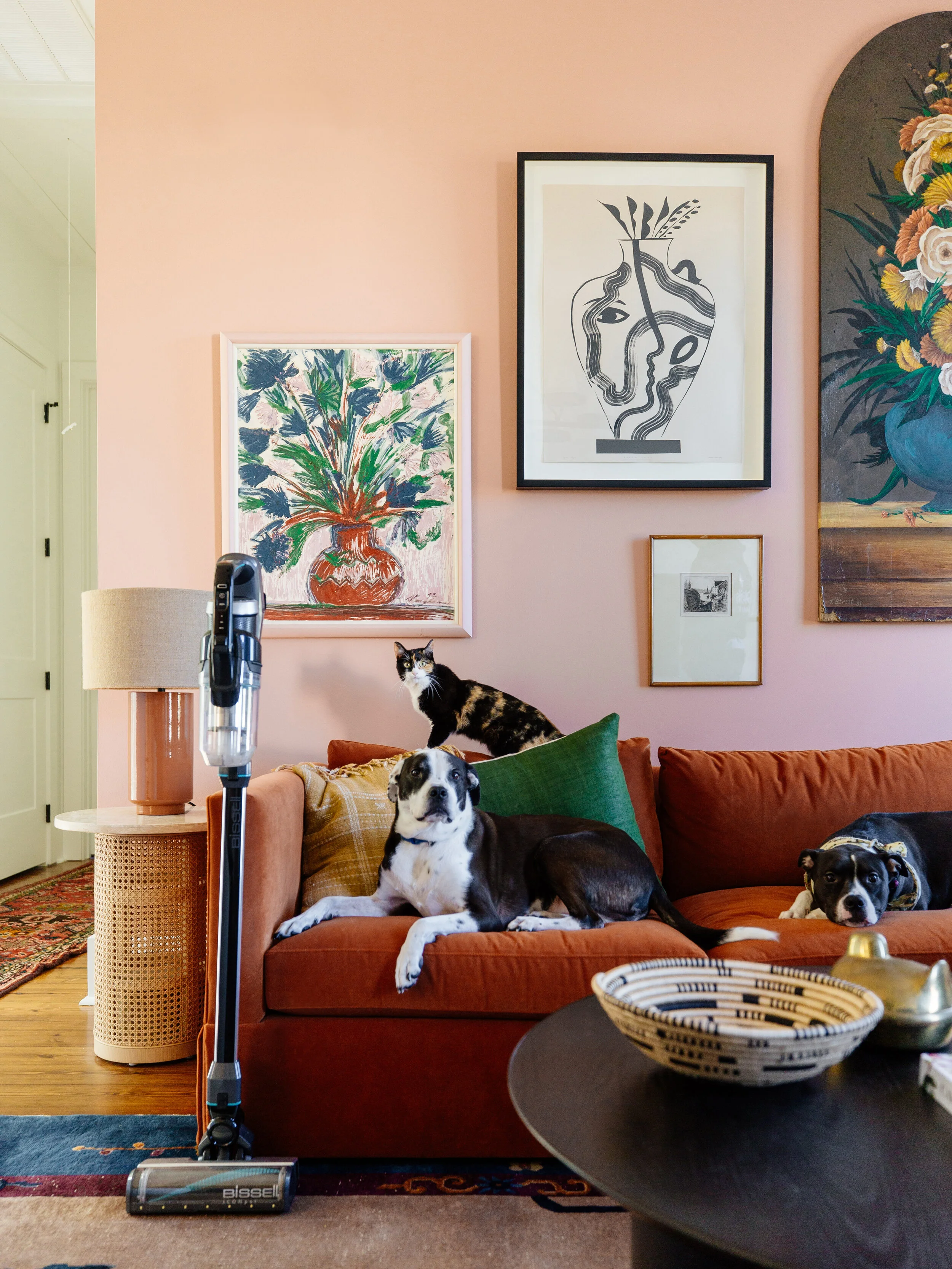 In my line of work, it’s important for my home to be as photo-ready as possible, but pet parenthood also comes along with the occasional spill or stain, too. For example, Luigi has a sensitive stomach so every now and again his upset tummy leads to an accident on the rug or sofa. And then there are saliva marks both pups leave on the upholstery, too. For these types of messes and more, the BISSELL® Pet Stain Eraser™ PowerBrush Cordless Portable Carpet Cleaner makes cleaning surfaces a breeze so our space can be picture perfect in no time.
