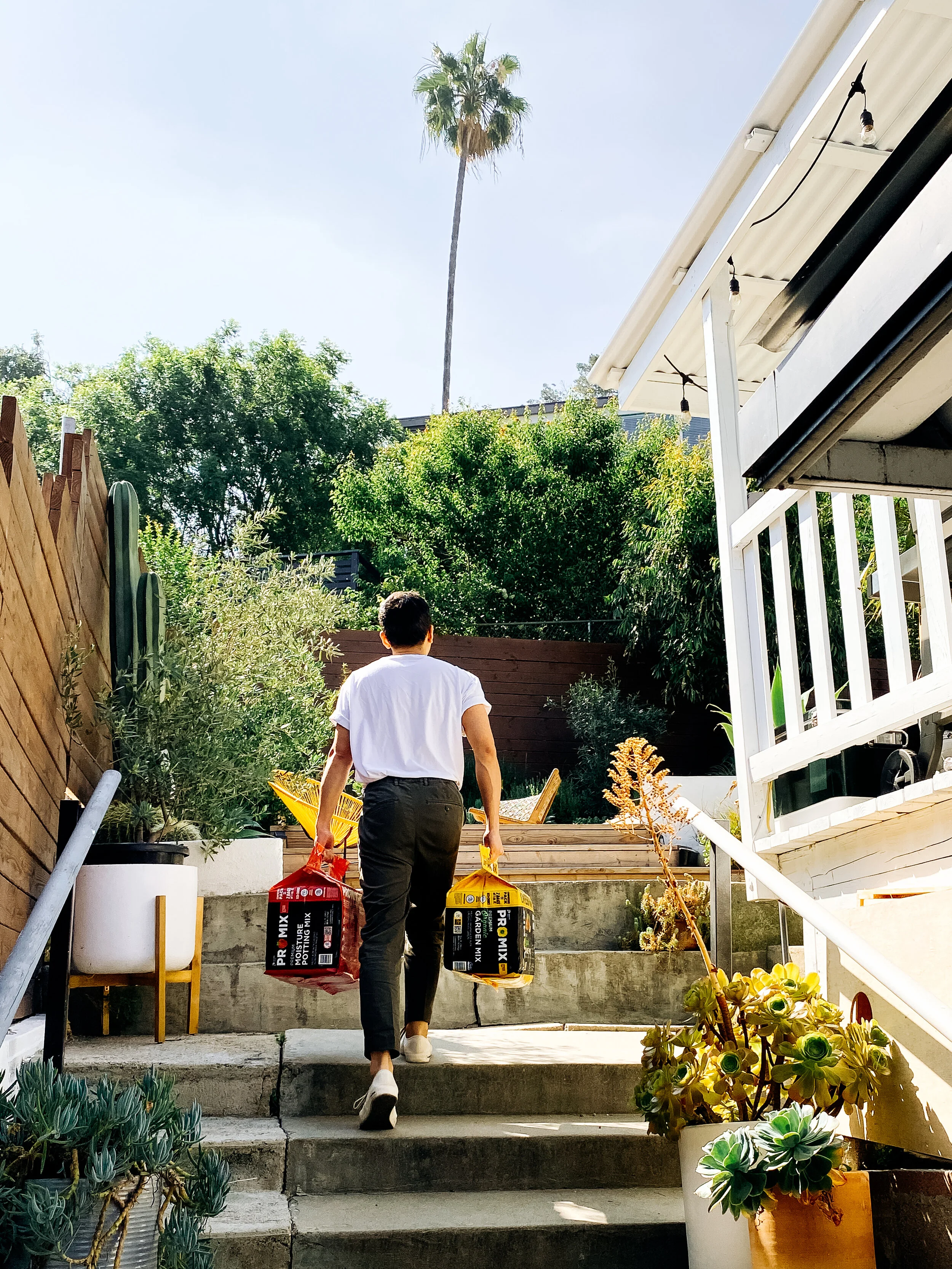 My boo and I have been hanging out a lot in our backyard since we’re spending more time at home. We’re really thankful that we have a little outdoor oasis to escape to. Last month, we had some spring storms roll in and made everything grow wild. So over the weekend we pulled up a bunch of weeds, mowed the lawn, and cleaned up the patio. I figured it was also time to repot my plants. You’re probably wondering, what? Yeah, I’m kind of notorious for just leaving store-bought plants in their plastic pots and nesting them in ceramic pots.