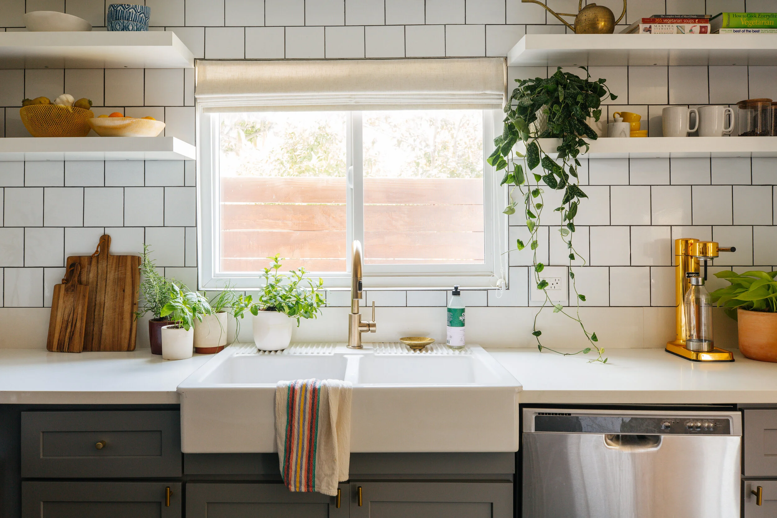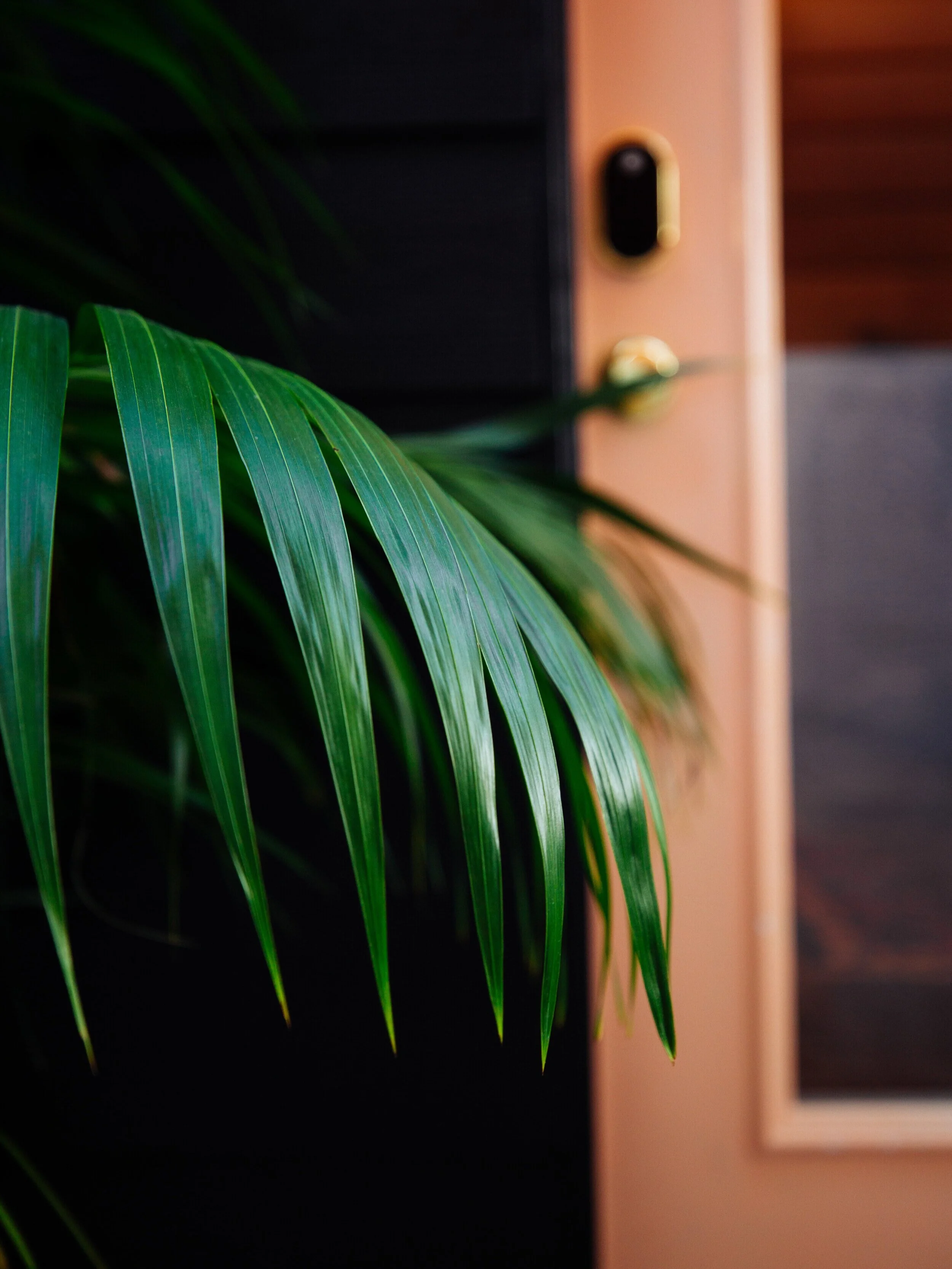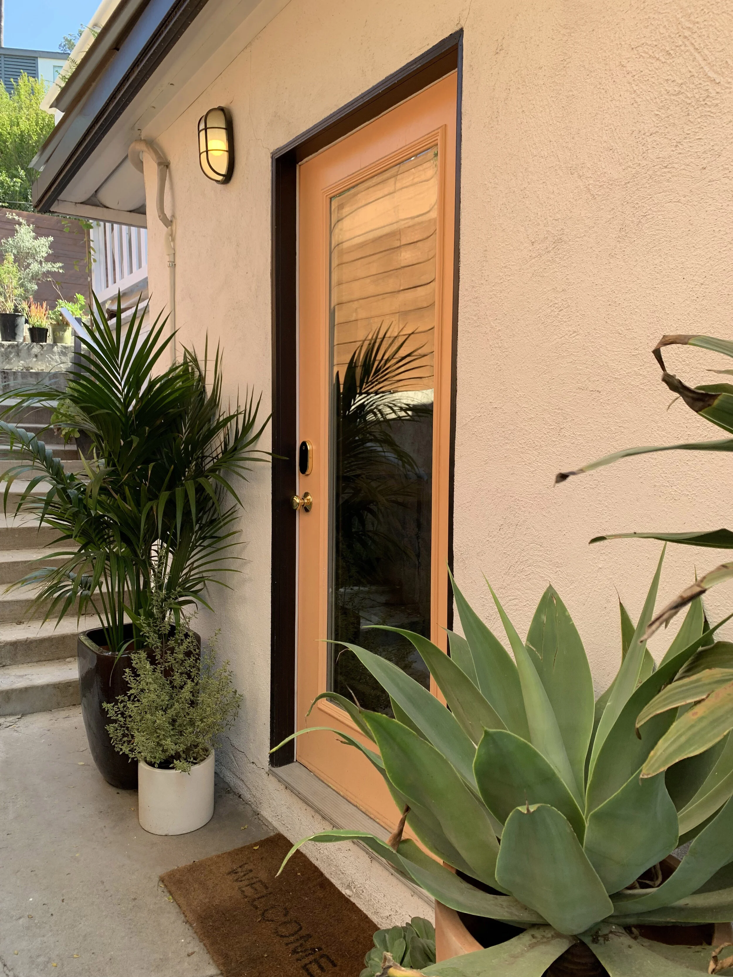 Let’s start with the outdoor pots, shall we? Our in-law suite recently got new siding and we painted it black so it looks like a separate guesthouse from our main house. I planted two simple Kentia palms in white pots. We used the organic garden mix which is perfect for outdoor plants or raised garden beds. The soil has natural active ingredients to improve the soil structure and minimize soil erosion. Our side alley is way more lush now. Doesn’t it look fancy with The Sterling Guesthouse removable window cling? It’s my pretend boutique hotel.