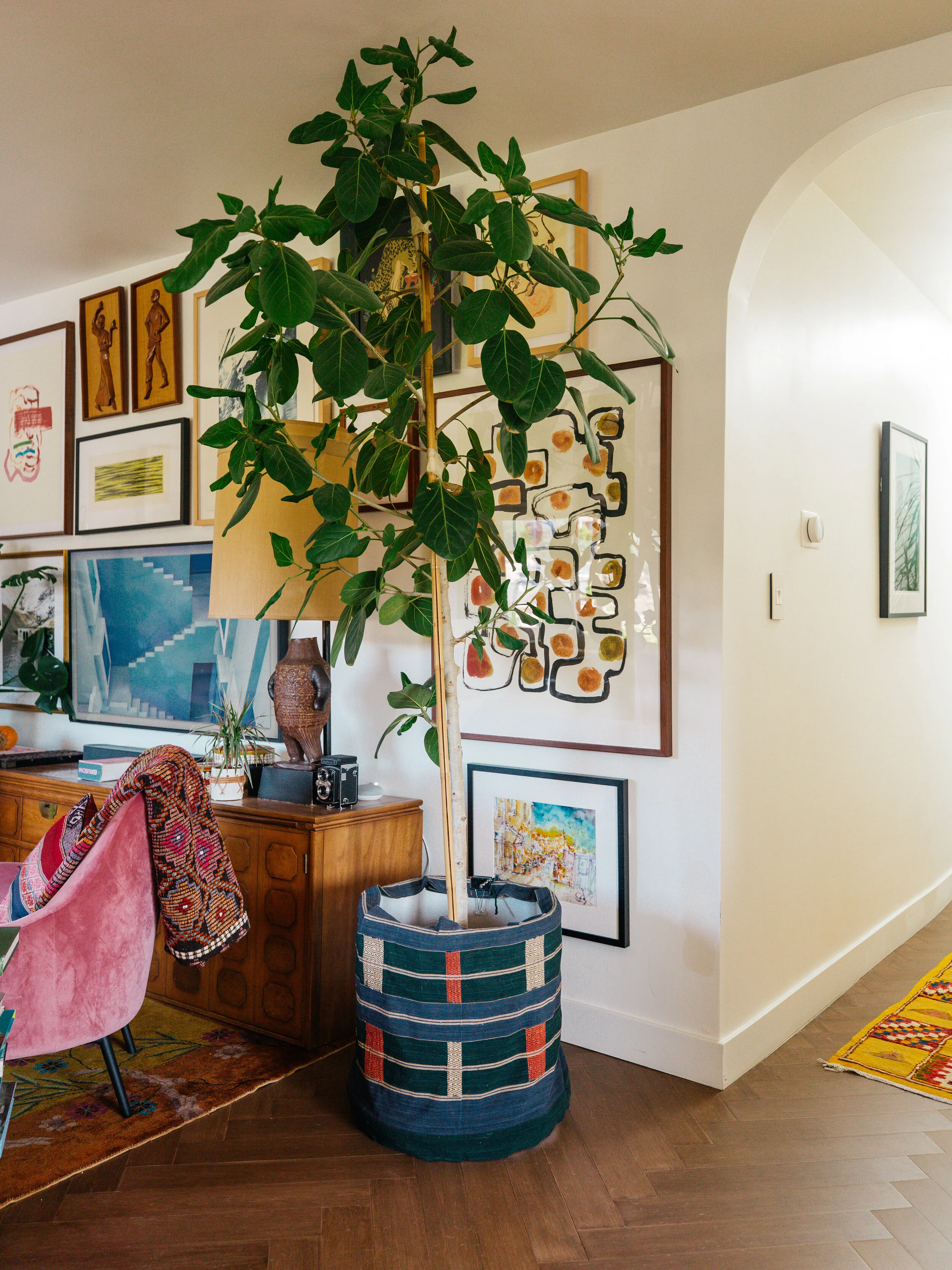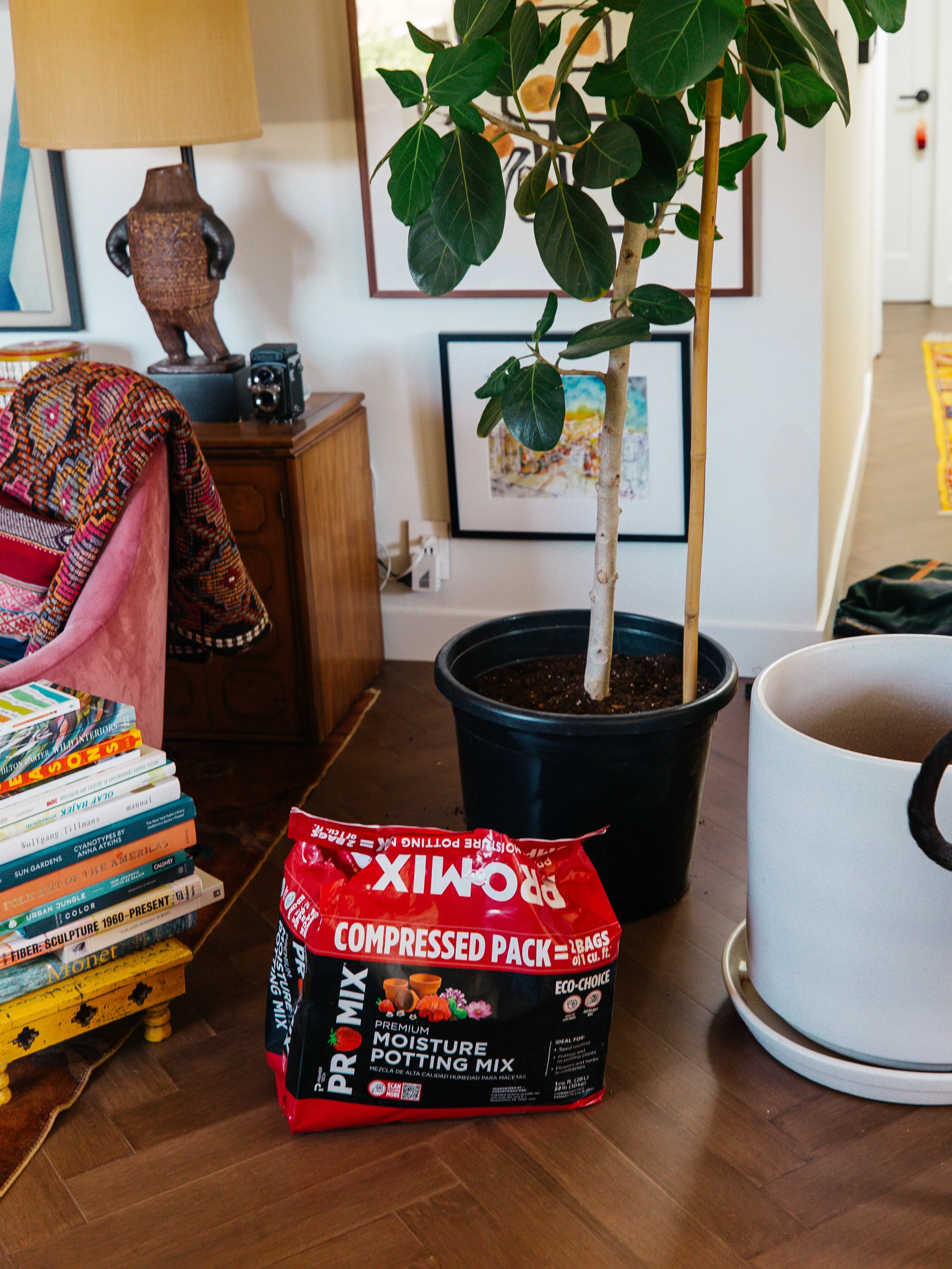 Now we’re gonna step inside and repot the indoor plants. Yep, all the plants you’ve seen in my home previously were in plastic pots sitting inside ceramic pots as well! Guilty! Here, we’re gonna use the moisture potting mix which has great moisture control for optimal and necessary water retention and aeration. They also use exclusive technology with mycorrhiza which help stimulate roots for healthy plants. I’ve been meaning to repot my Ficus Audrey and I finally found a pot big enough for it. And even though I don’t mind the white pot, I actually miss the fabric so I wrapped it back up. Also moved my monstera to this corner of my living room.