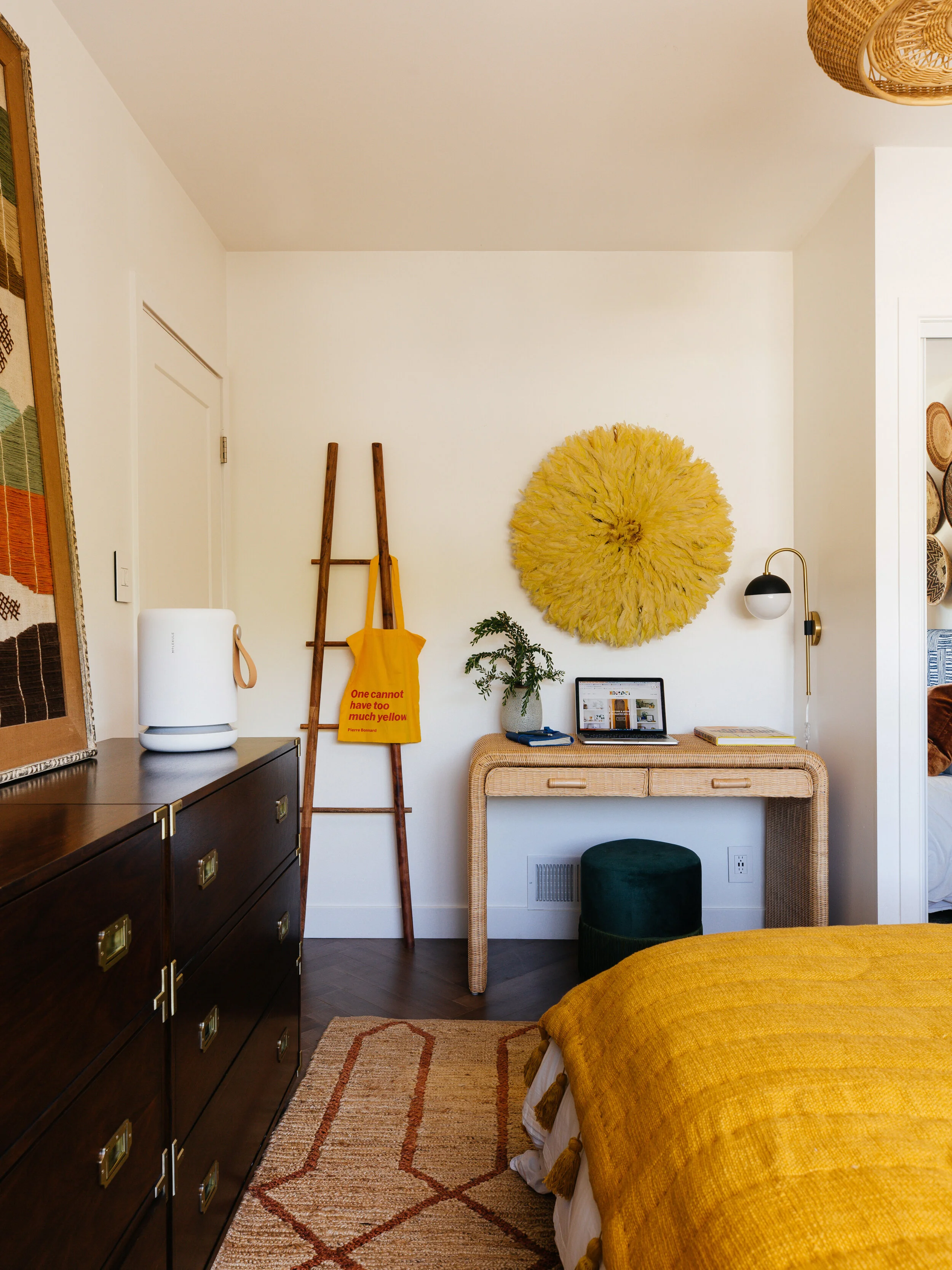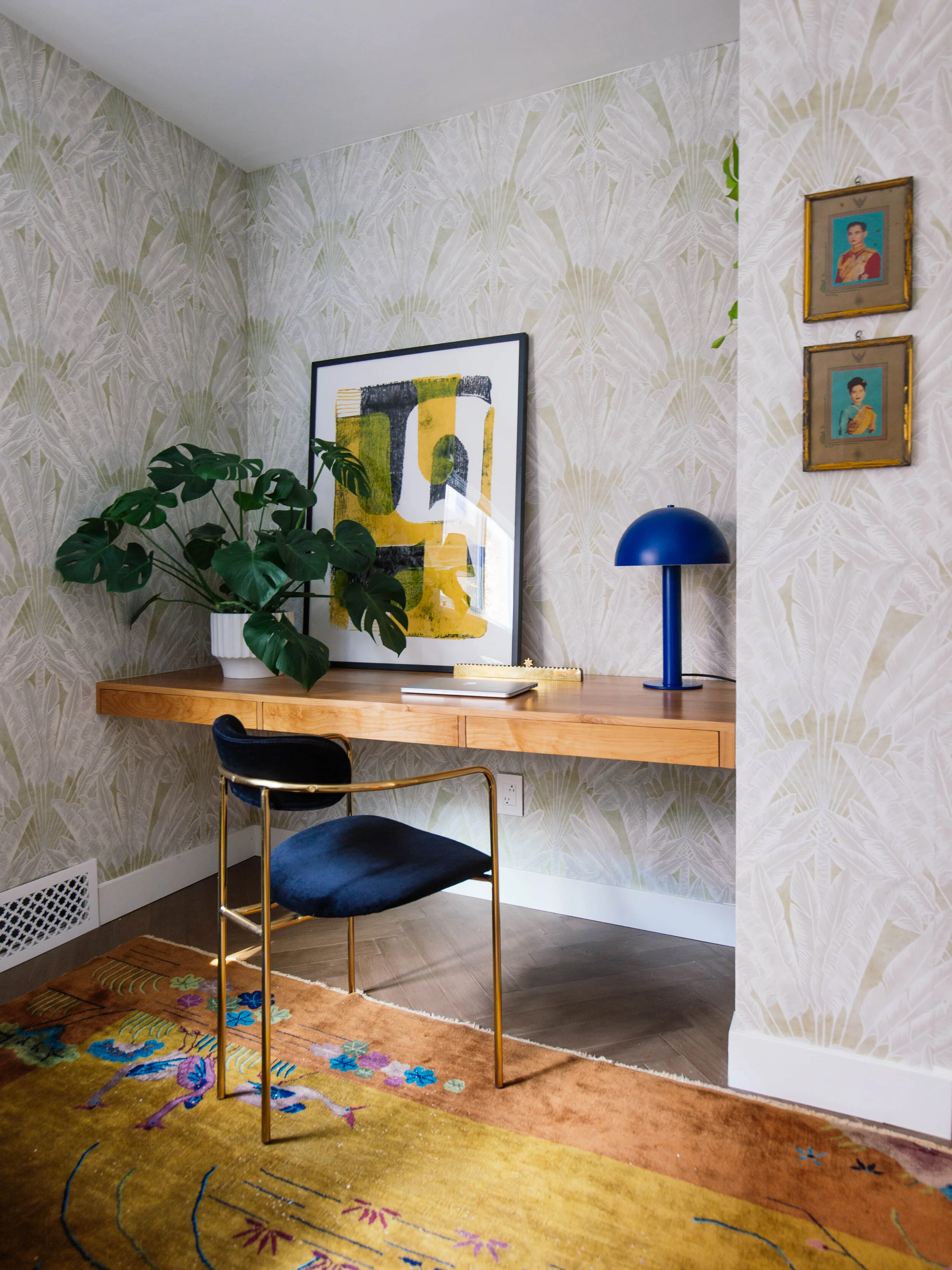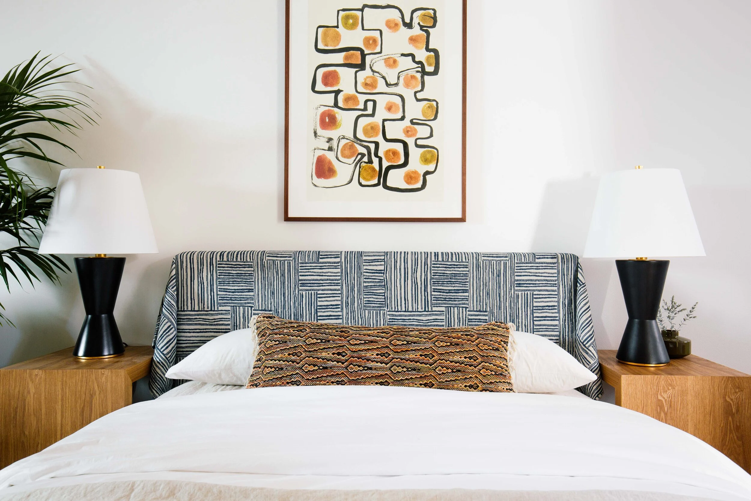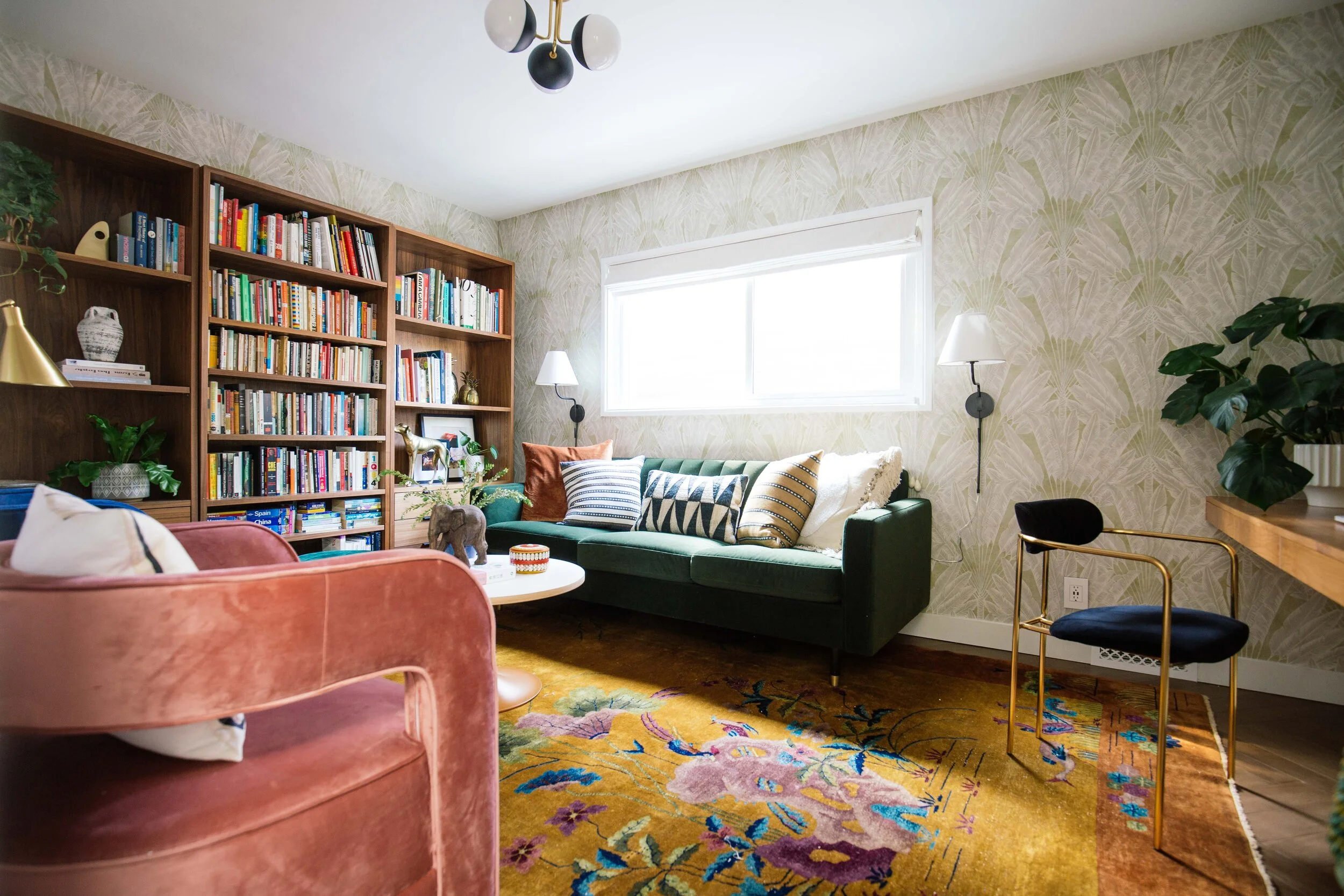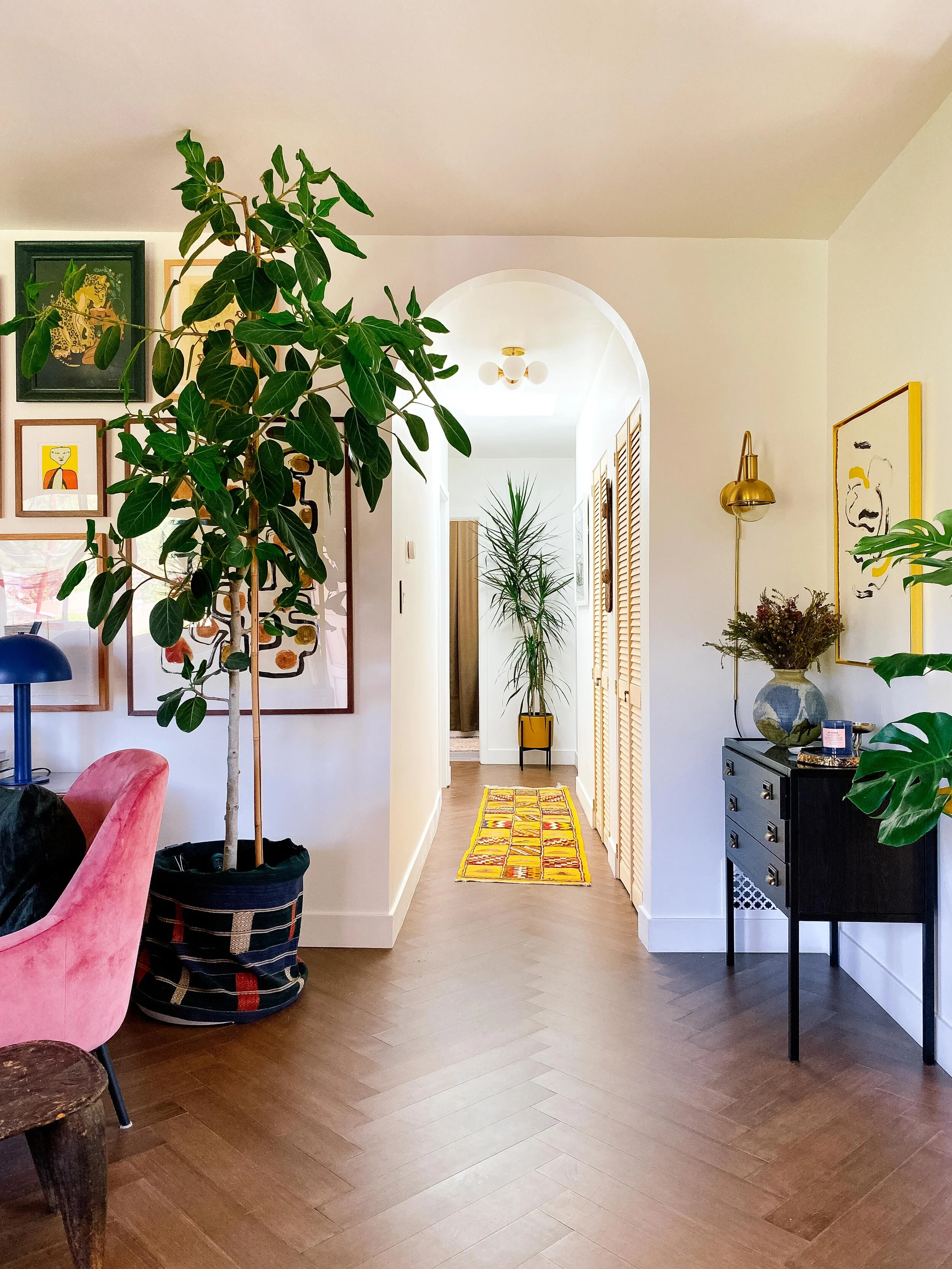 Our home was built in the 1950s and it’s about 1,500 square feet. We tore the old laminate floors and installed herringbone engineered hardwood floors. That alone changed the feel of the whole house. The floors add so much richness to the space. We had a ceiling fan in the living room which I immediately swapped out for this Jonathan Adler Caracas light. Yellow Jasper sofa from Room & Board. Antique Chinese Rug was from Overstock. The large paintings are by Leroy Miranda Jr. Coffee Table. Pink chair (background). Accent table from Jungalow. Riley sconces from Mitzi.