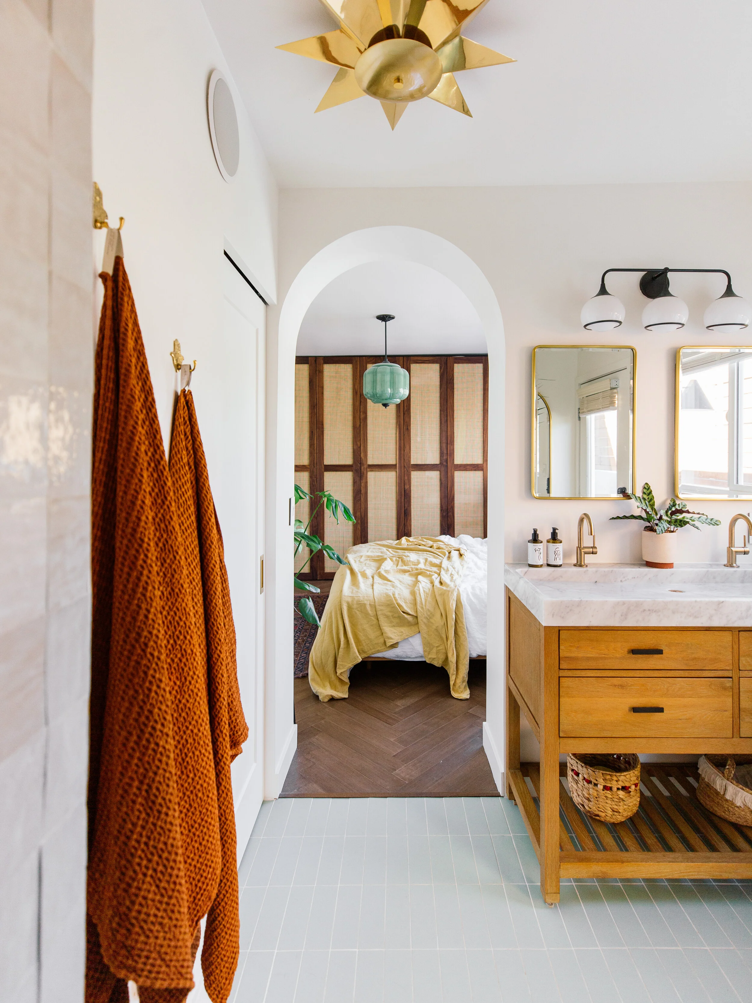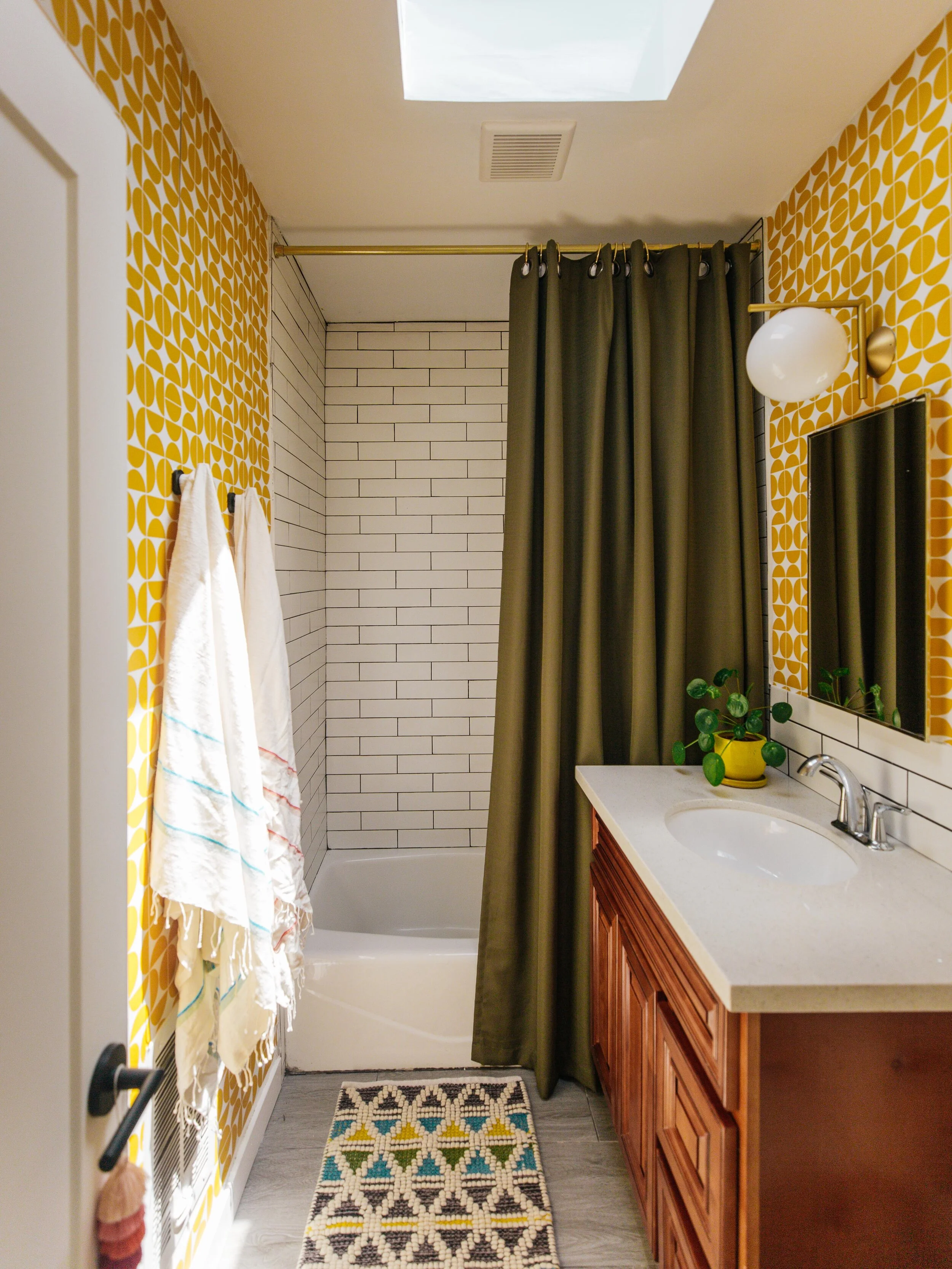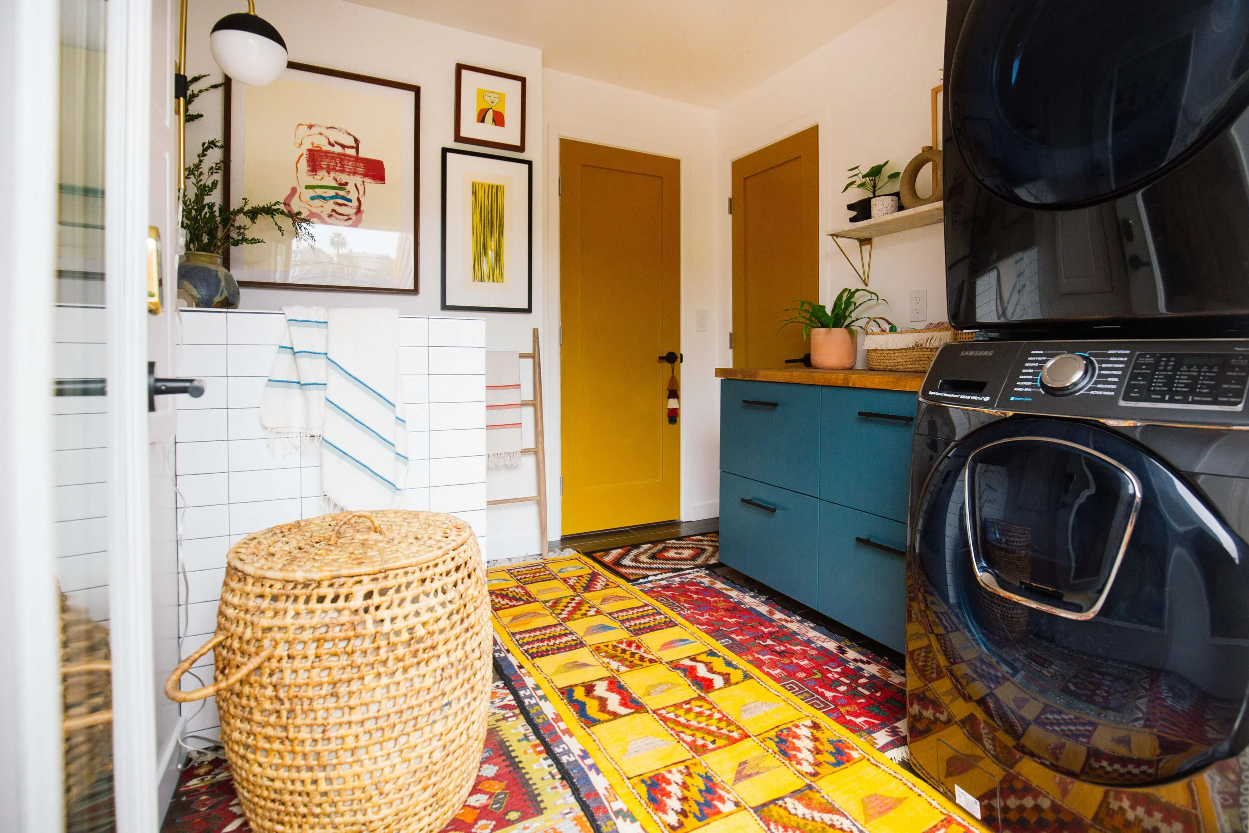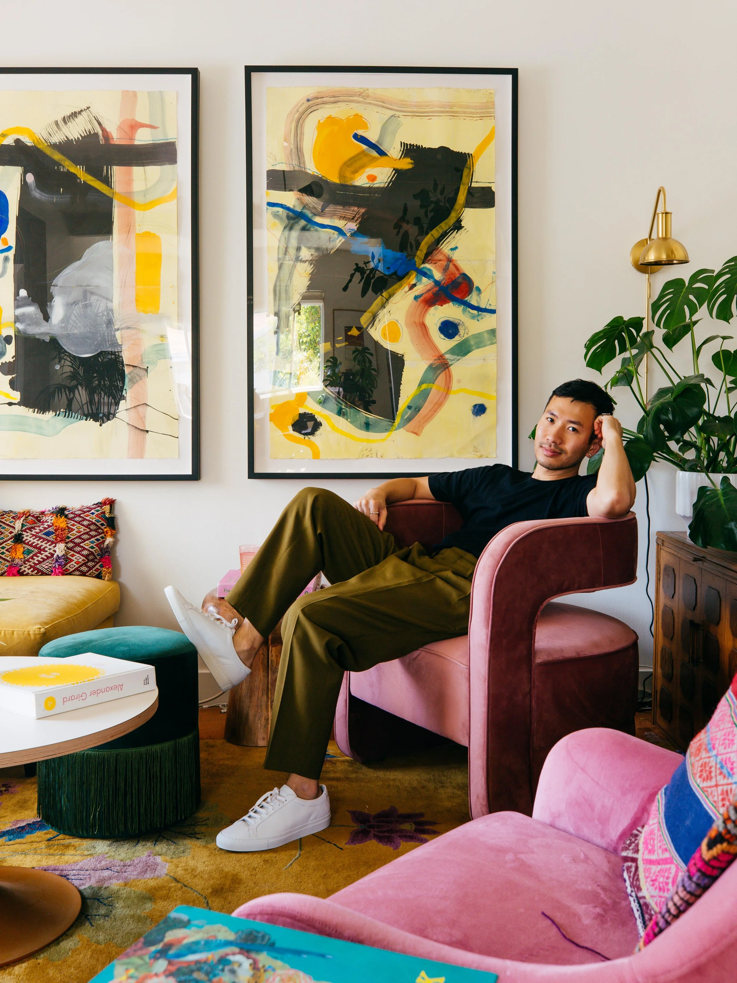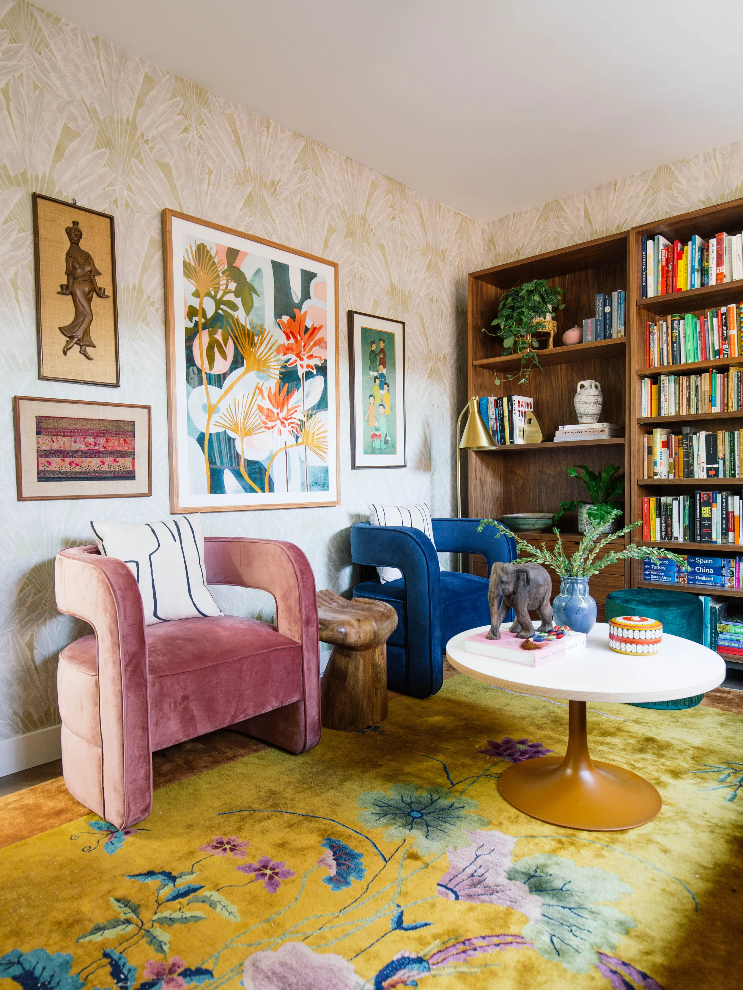 Our home was built in the 1950s and it’s about 1,500 square feet. We tore the old laminate floors and installed herringbone engineered hardwood floors. That alone changed the feel of the whole house. The floors add so much richness to the space. We had a ceiling fan in the living room which I immediately swapped out for this Jonathan Adler Caracas light. Yellow Jasper sofa from Room & Board. Antique Chinese Rug was from Overstock. The large paintings are by Leroy Miranda Jr. Coffee Table. Pink chair (background). Accent table from Jungalow. Riley sconces from Mitzi.