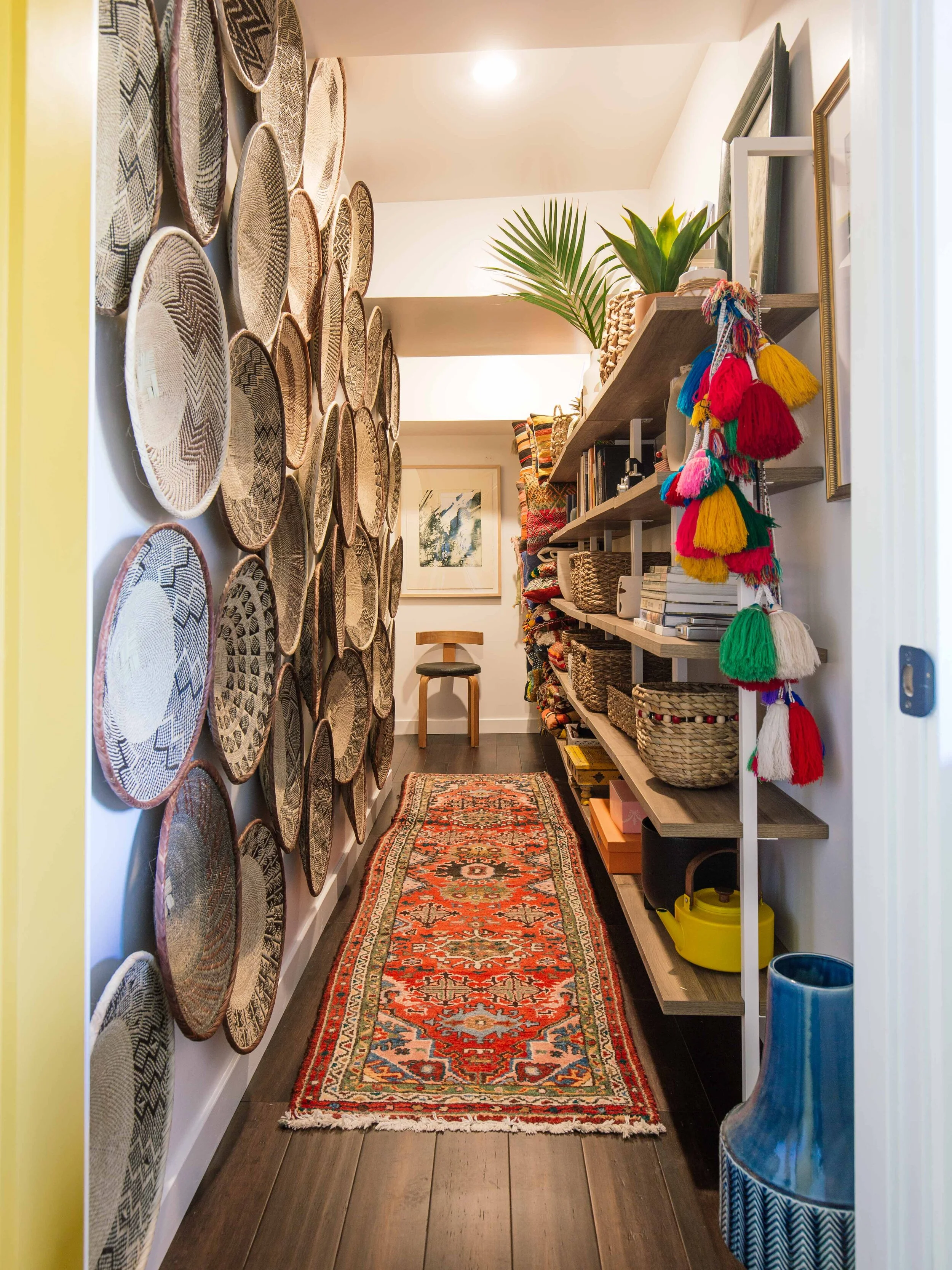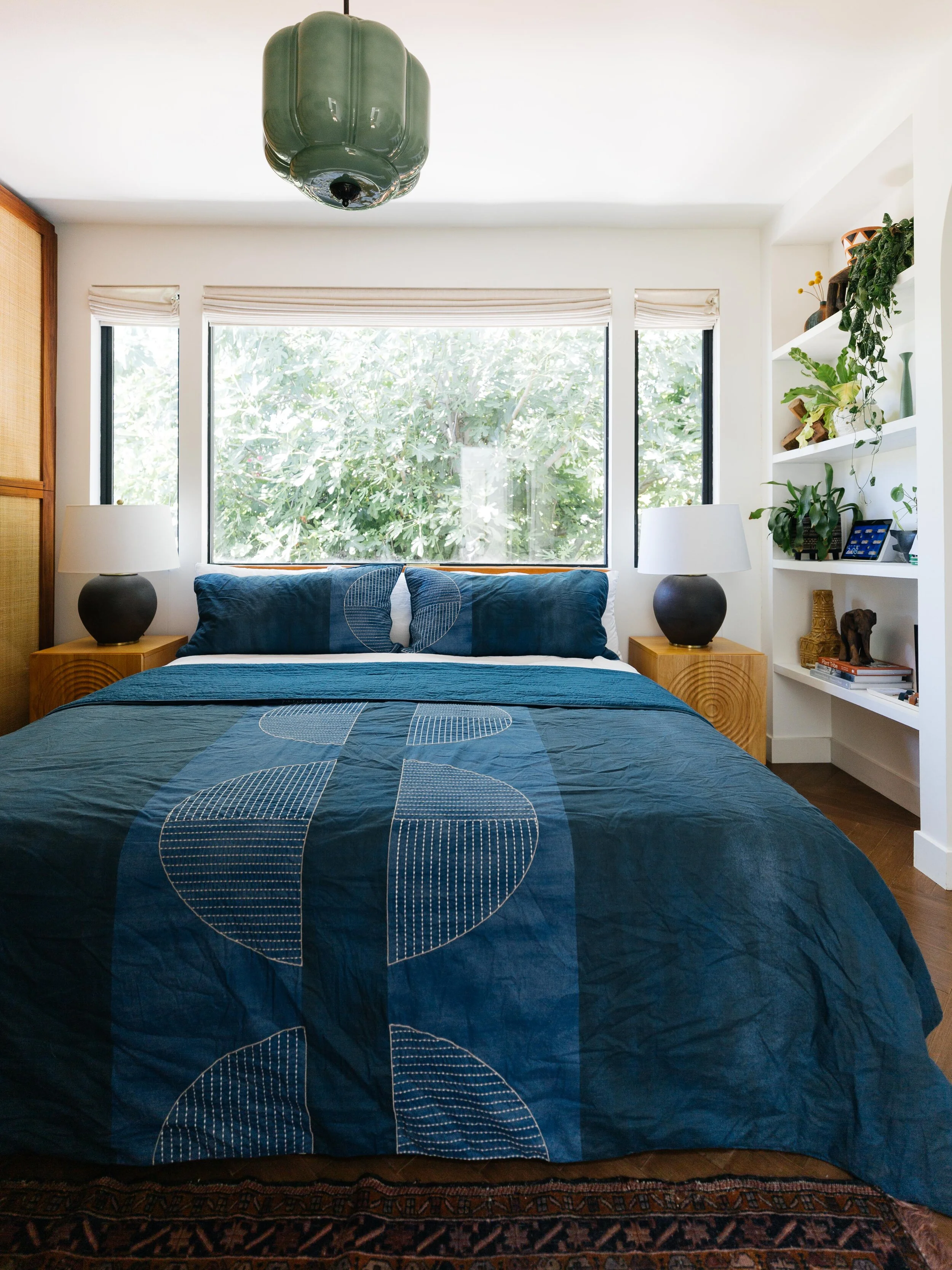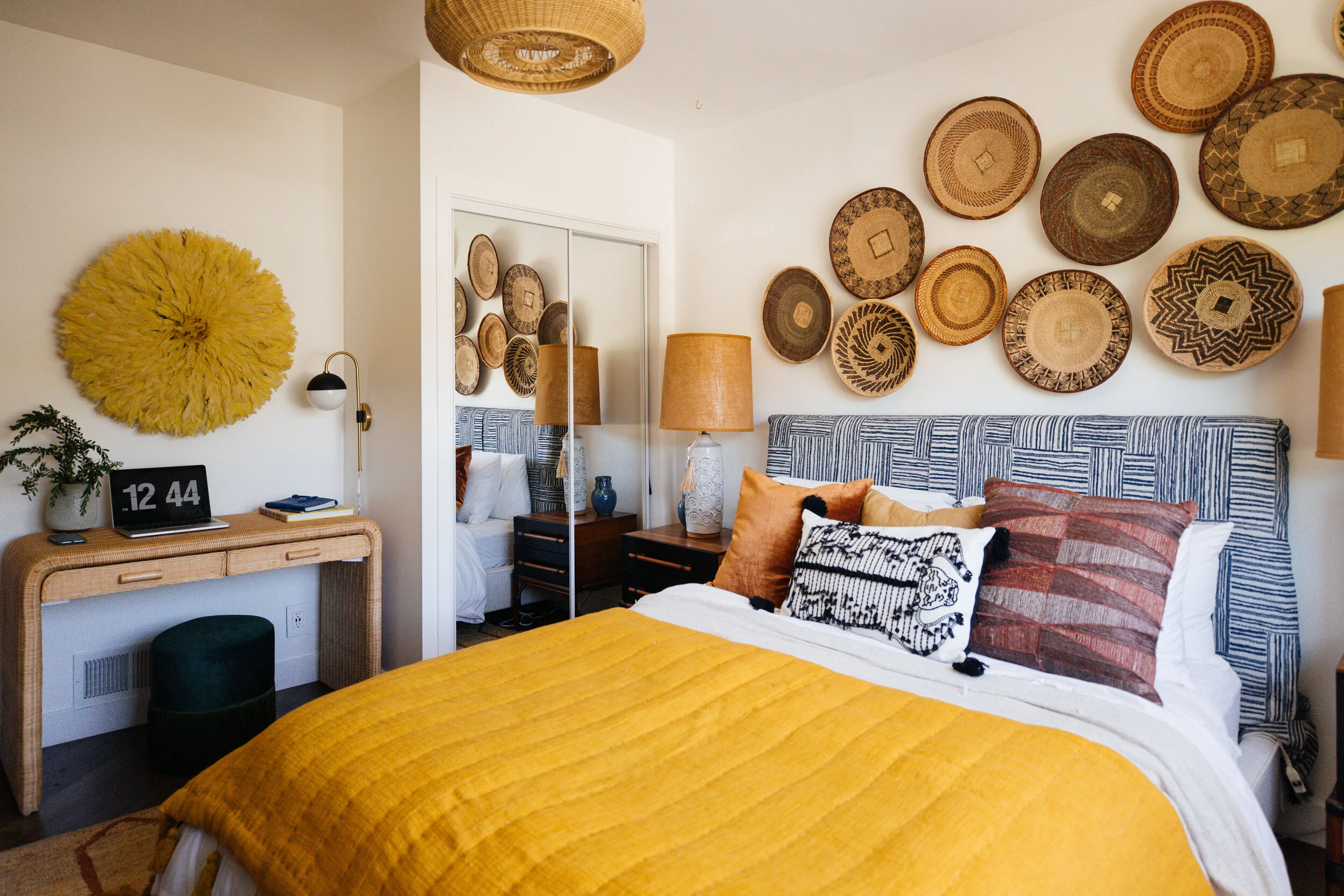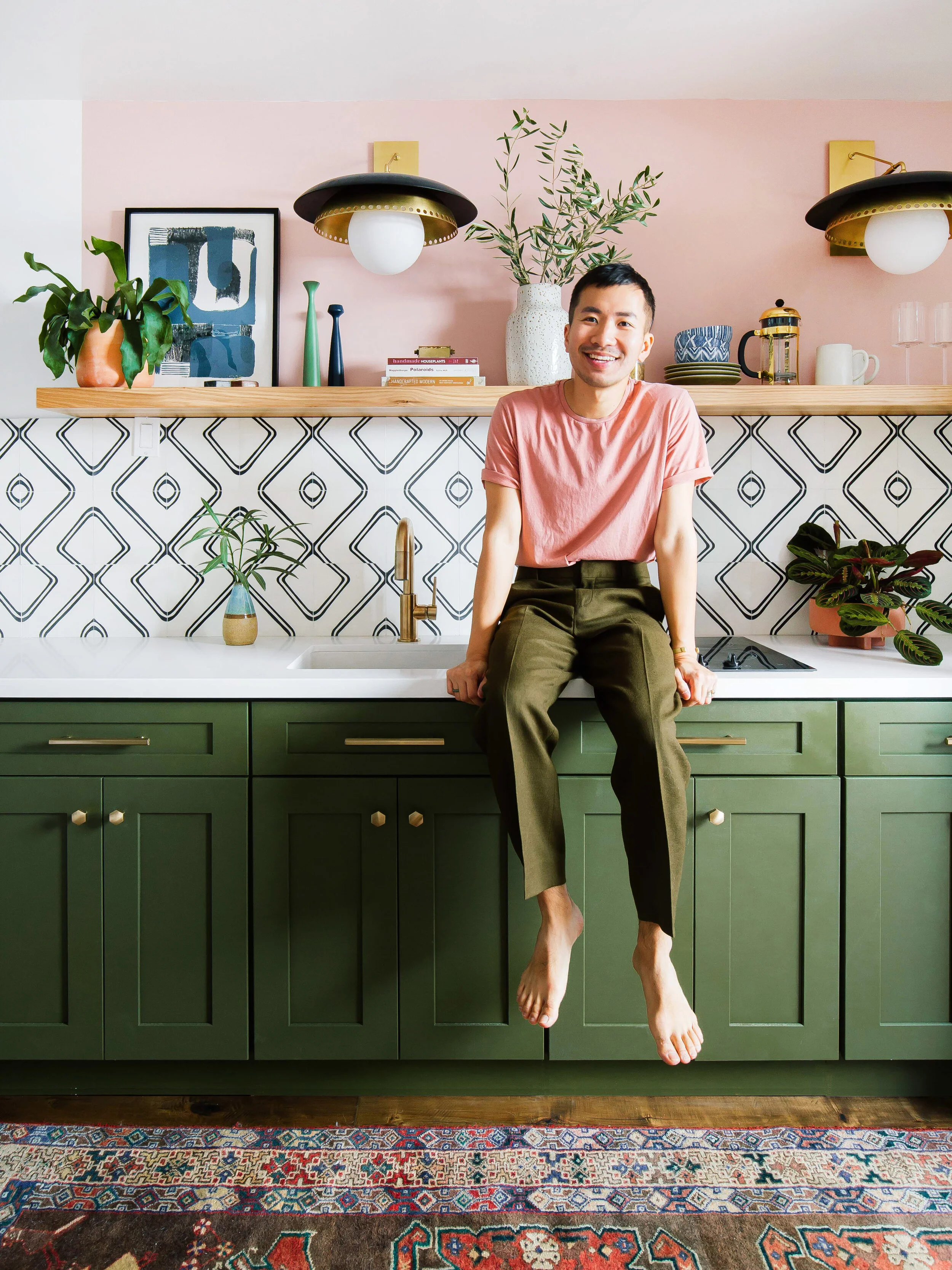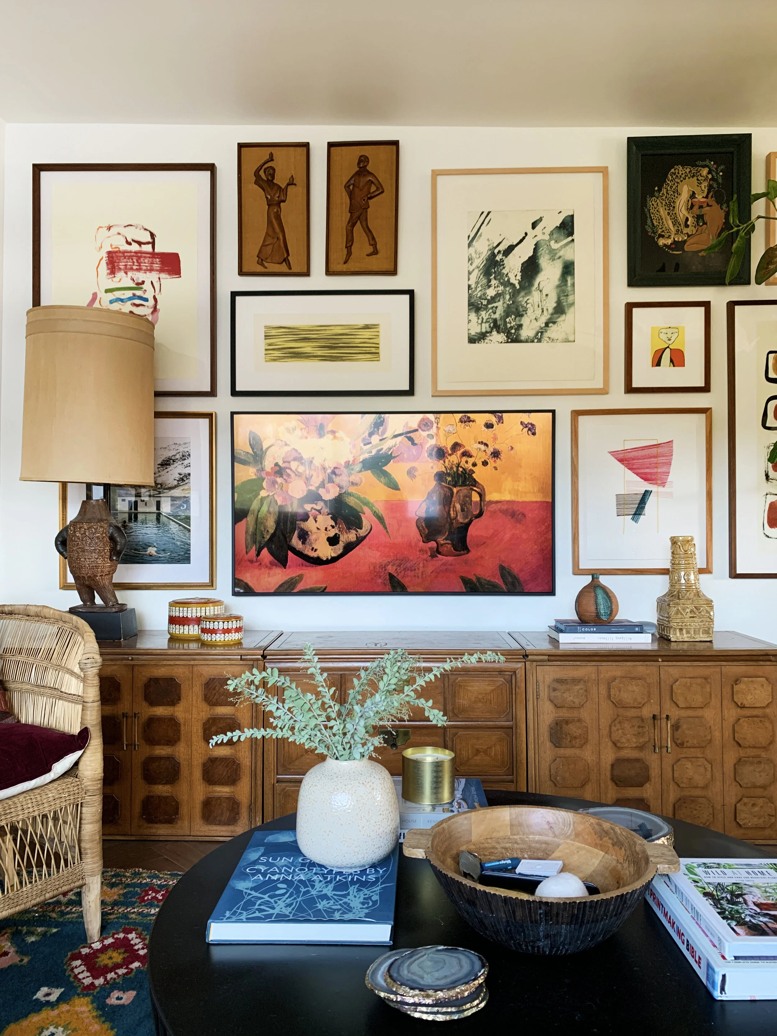 Our home was built in the 1950s and it’s about 1,500 square feet. We tore the old laminate floors and installed herringbone engineered hardwood floors. That alone changed the feel of the whole house. The floors add so much richness to the space. We had a ceiling fan in the living room which I immediately swapped out for this Jonathan Adler Caracas light. Yellow Jasper sofa from Room & Board. Antique Chinese Rug was from Overstock. The large paintings are by Leroy Miranda Jr. Coffee Table. Pink chair (background). Accent table from Jungalow. Riley sconces from Mitzi.