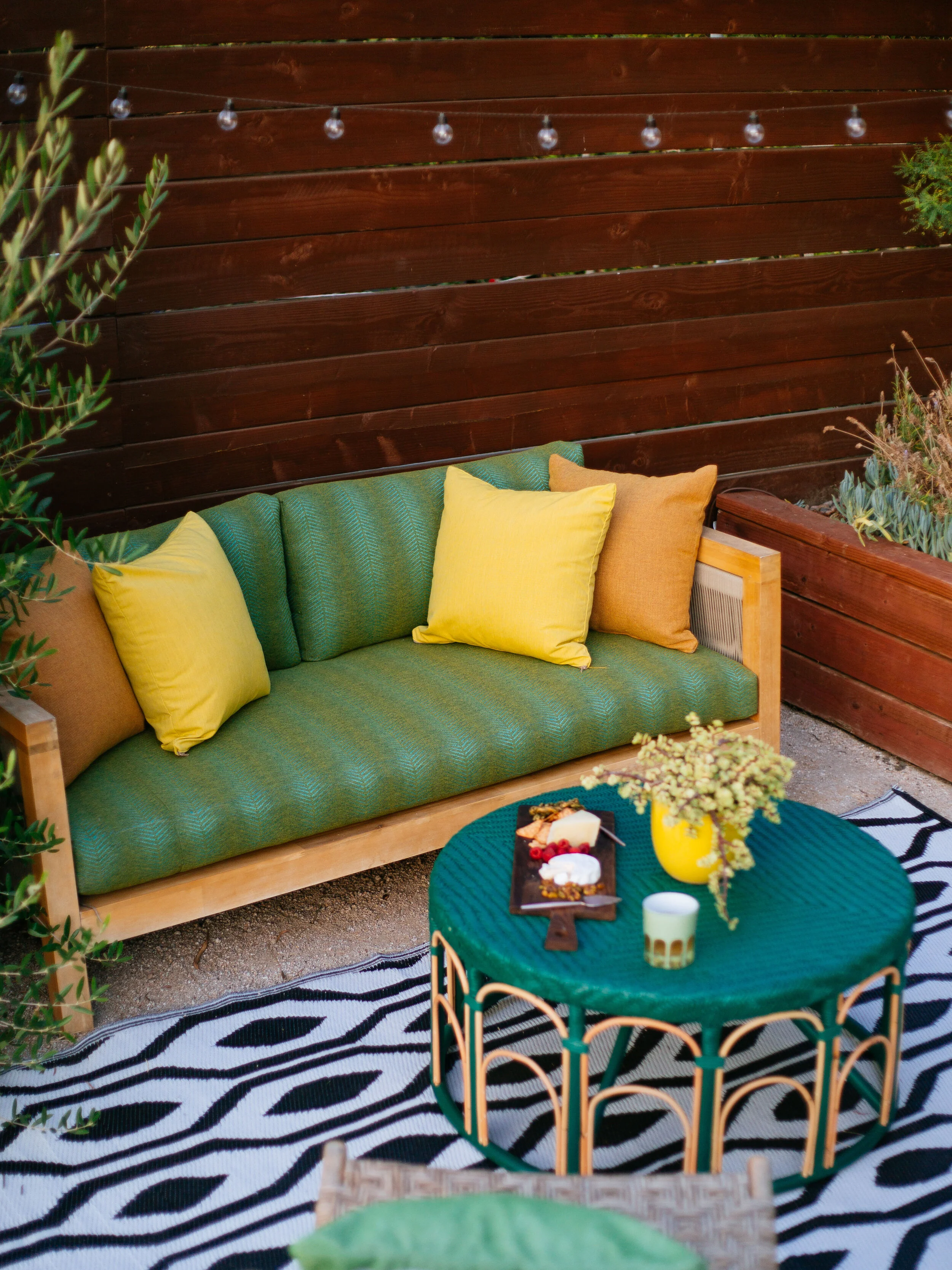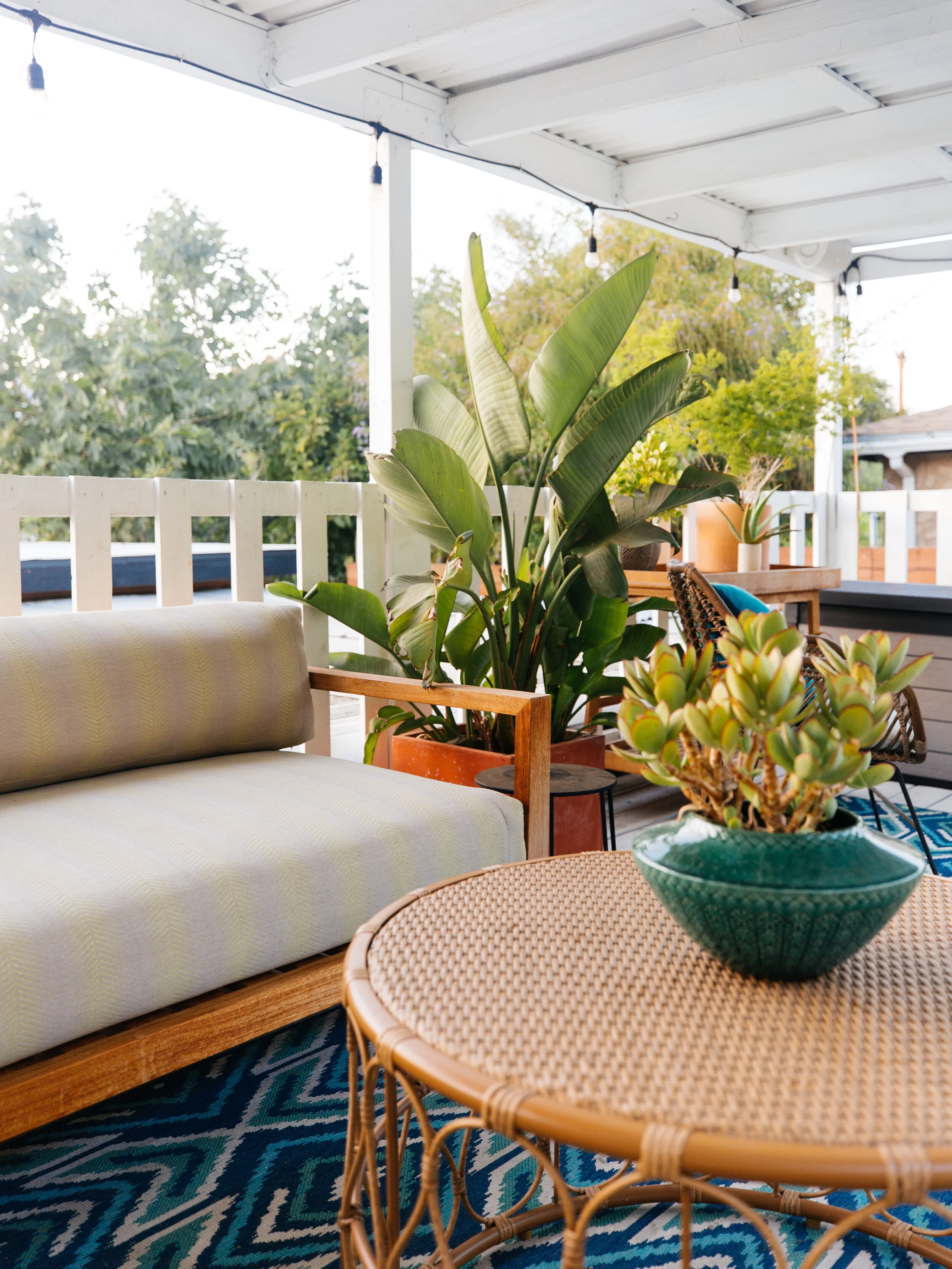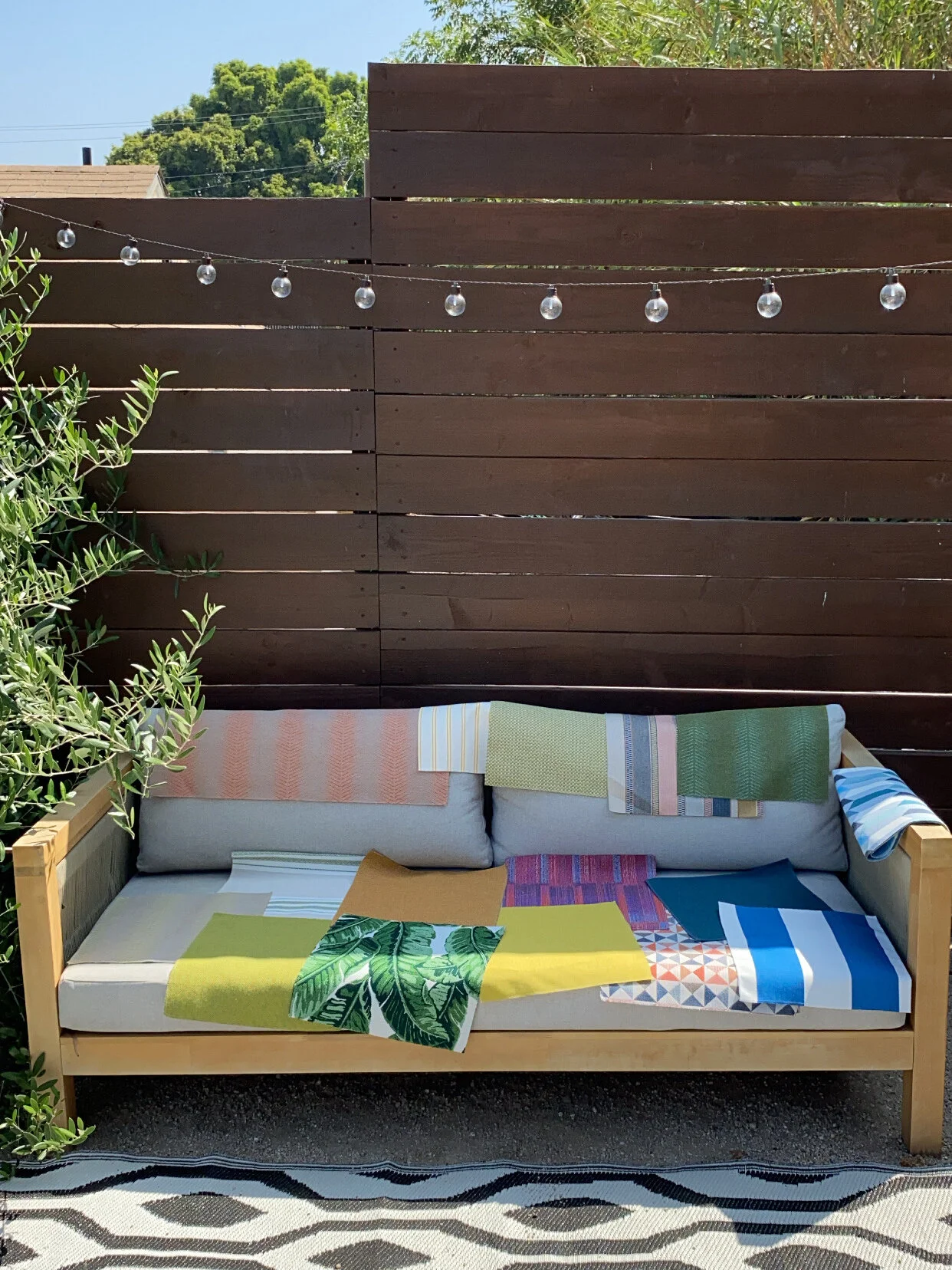 As a Sunbrella partner, I was psyched to try their super resilient, perfect-for-patios fabrics on our grey and white outdoor sofas. When they sent over some samples, I was immediately blown away by the quality. For one thing, it’s so soft! When you think of outdoor-friendly fabrics that are designed for durability, you don’t typically expect them to feel this good. Besides that, I learned that Sunbrella doesn’t rely on just a finish to make it so high-functioning, it’s actually built into the core of the fabric. Because of that, the fabric will also last a lot longer and still look great over time. The fabrics also happen to be UV-resistant, so I don’t have to worry about them fading, which is so important in a year-round sunny city like LA. Plus, they’re also so easy to clean if we happen to accidentally splash some sriracha or soy sauce on the sofa. Just saying!