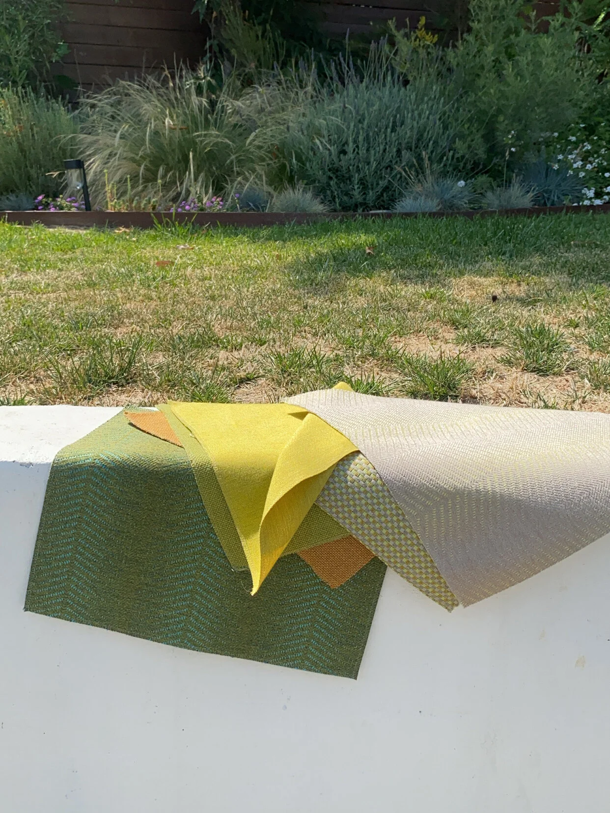 Deciding to redesign with Sunbrella was easy, but choosing a fabric was a challenge, since everything they sent over was so beautiful! However, I had a vision in mind. If you know me, you know grey isn’t exactly the shade I’m known for using for decor! Don’t get me wrong, a good neutral here can hit the spot, but I usually gravitate more towards patterns and saturated hues, like greens and citrusy colors. For the patio makeover I was really inspired by the colors from our palo verde. I love the yellow flowers it produces and it’s planted right next to the upper deck. So I decided that this was the direction I was gonna go with for choosing fabrics for the sofa and pillows.