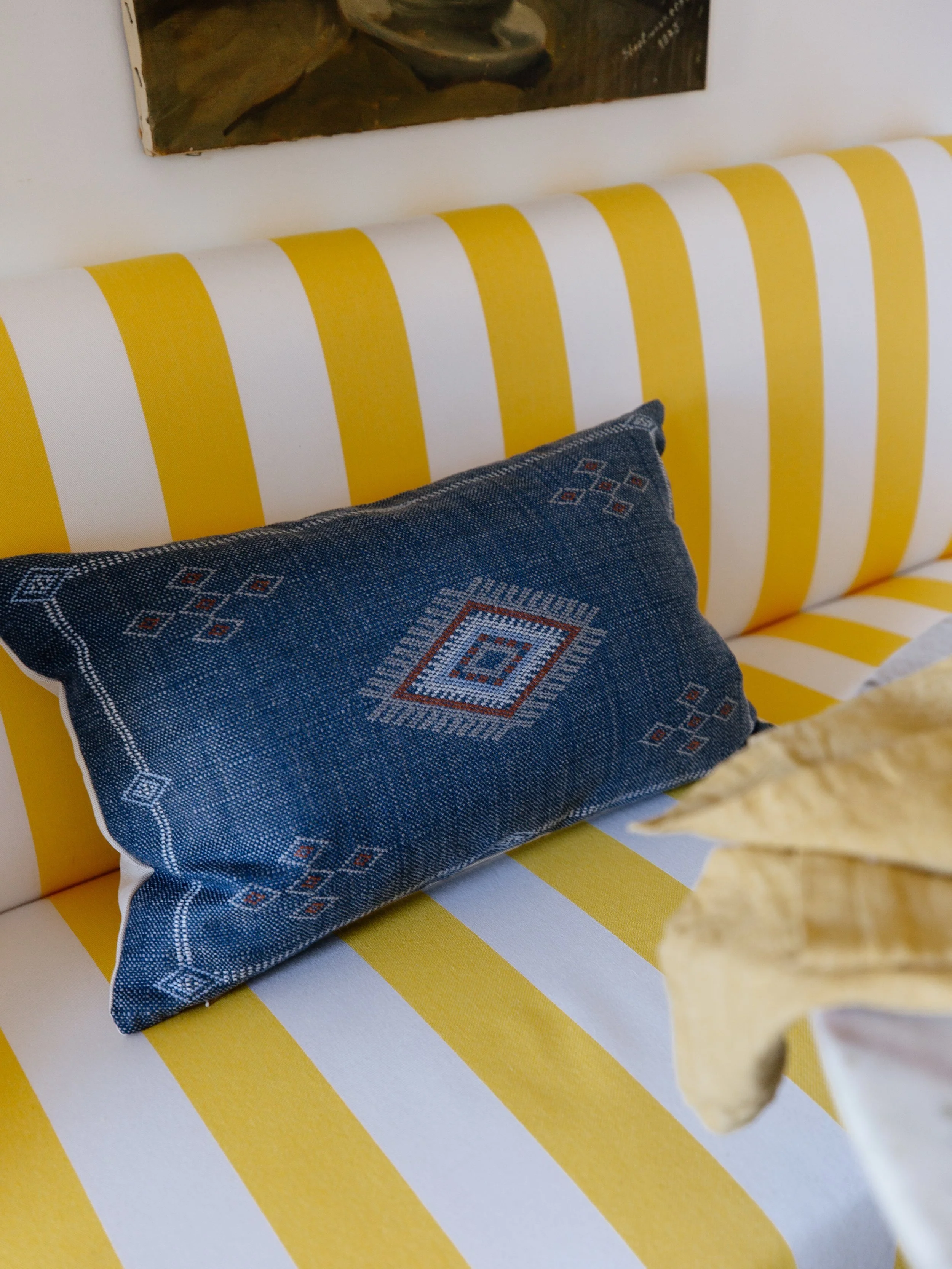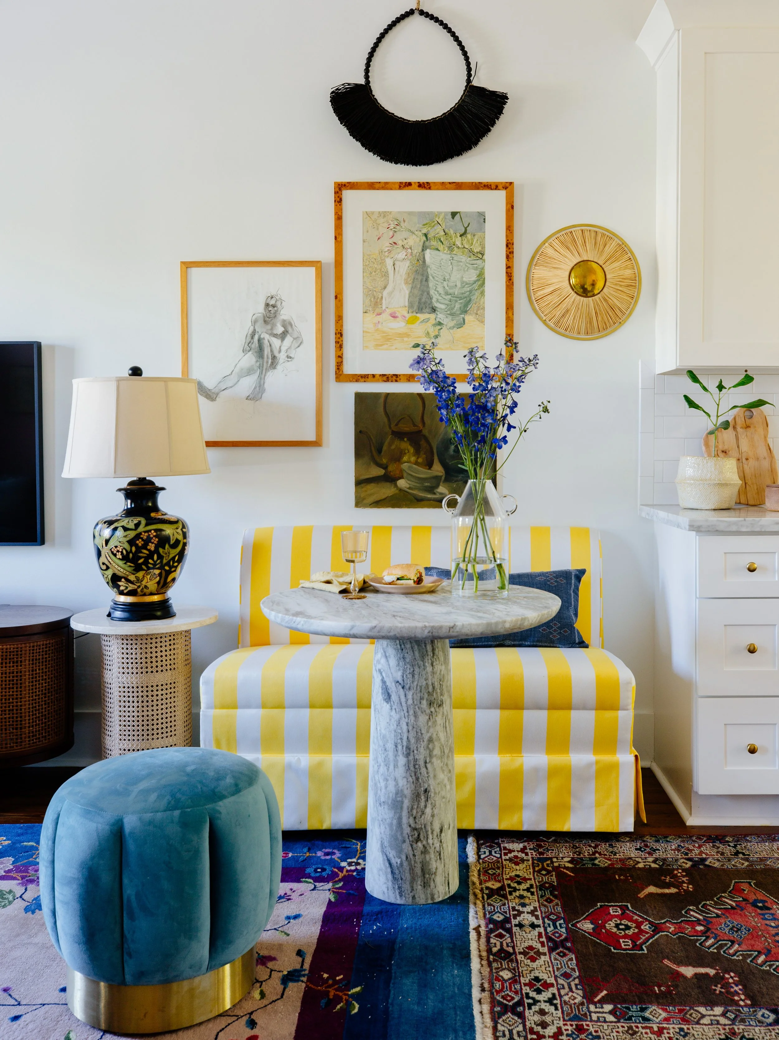 When it came to choosing a color, I went with a forever favorite—yellow! I knew it would add some citrus-y brightness to the space and it tied into a few other accents while complementing the other shades in both the living room and kitchen. And why not mix it up with a bold print? To get some tropical cabana vibes, I chose Sunbrella Canopy Stripe in Lemon/White. Stripes are always a classic, but the width in this pattern gave them a little extra oomph!