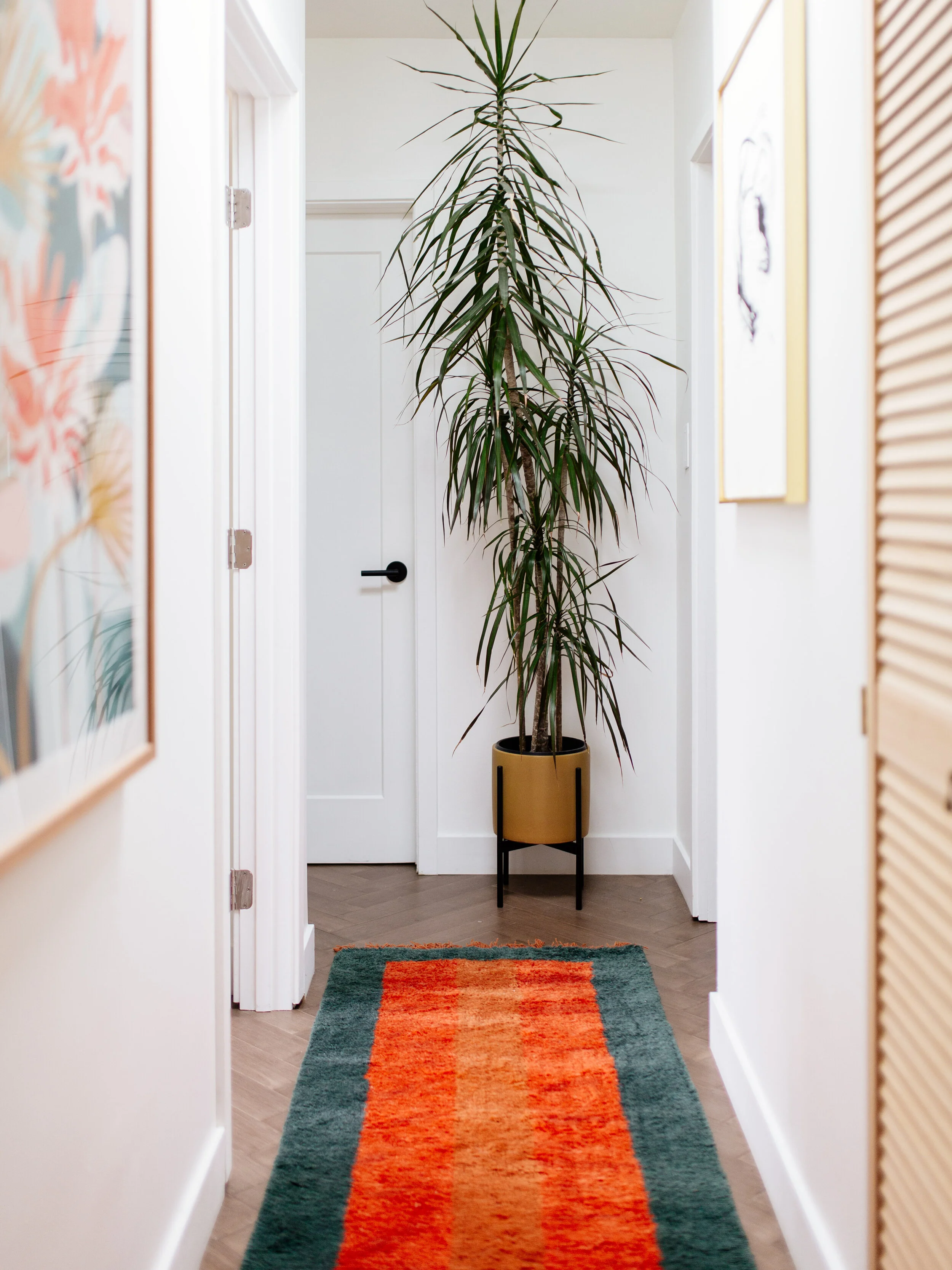 It took me less than five minutes before finding their Dahl runner from their Elemental collection. It’s got orange and teal colors which I’m always such a sucker for. My kitchen is green with some citrus accents so it’s fun to tie that into this space. It really brightens up the hallway and makes it feel like my very own catwalk! Ha! And I like that it’s a shag rug so it’s super soft with a bit of shine. And the great thing about this shag rug is that it doesn’t shed cause they’re hand knotted. My hallway is finally complete!