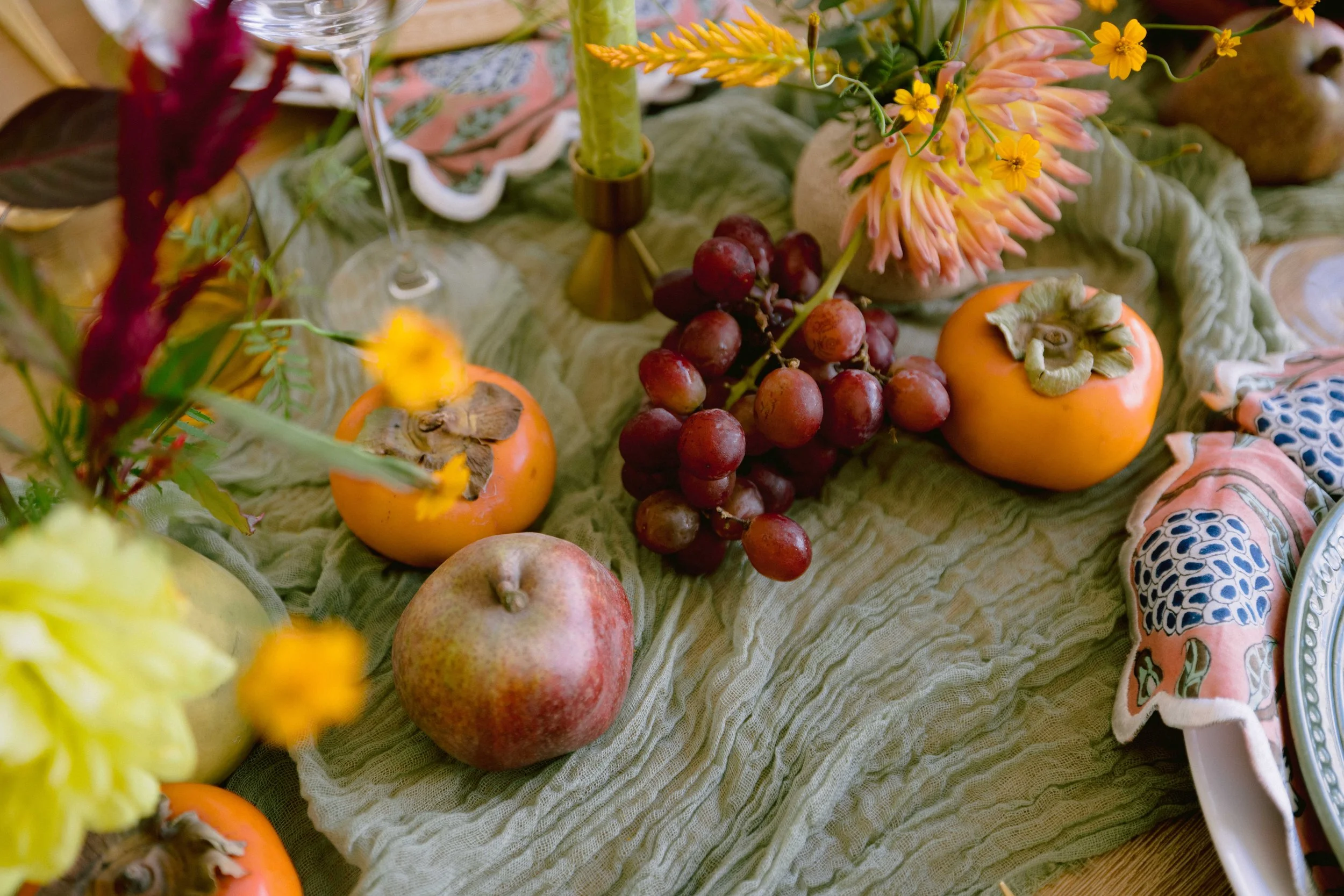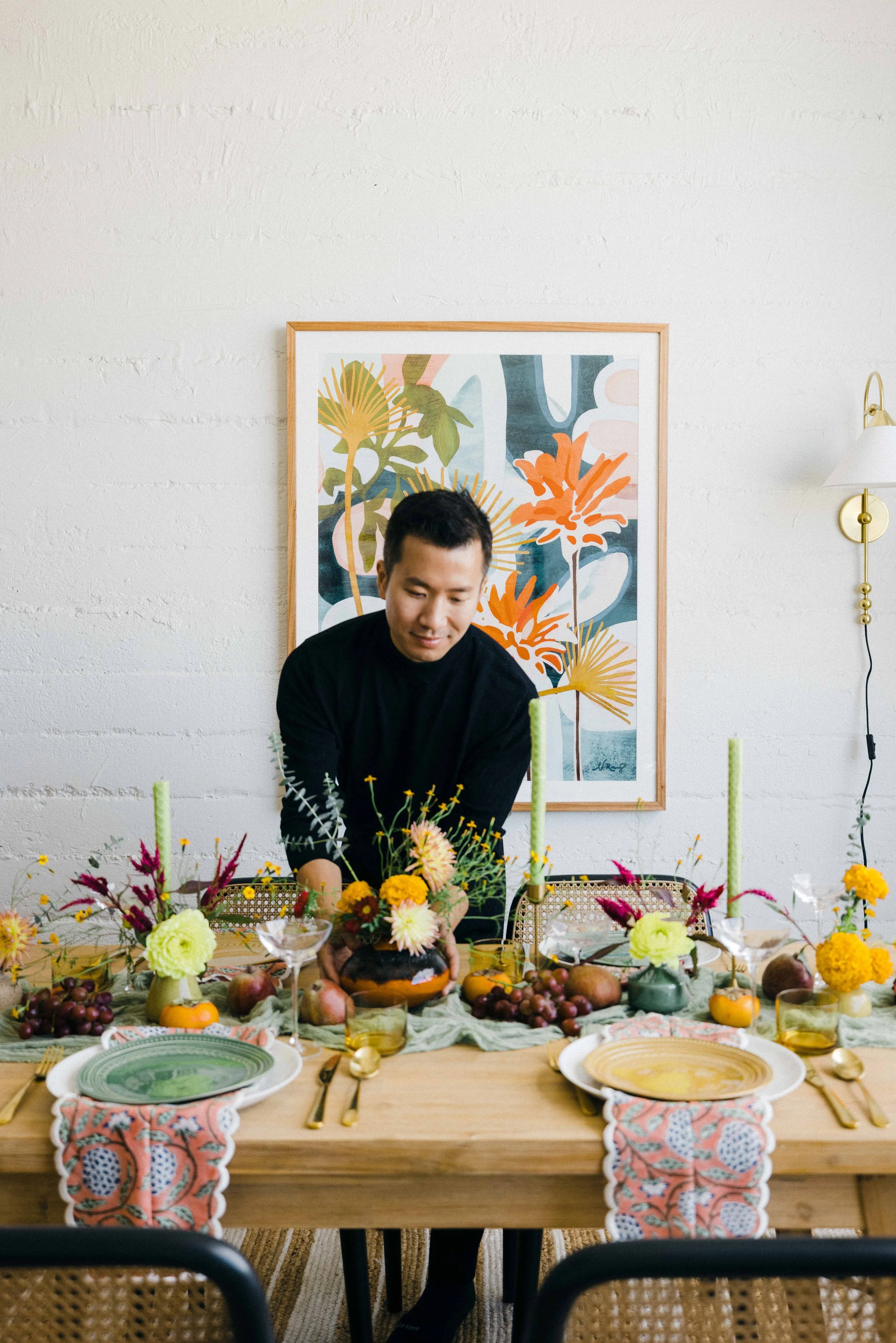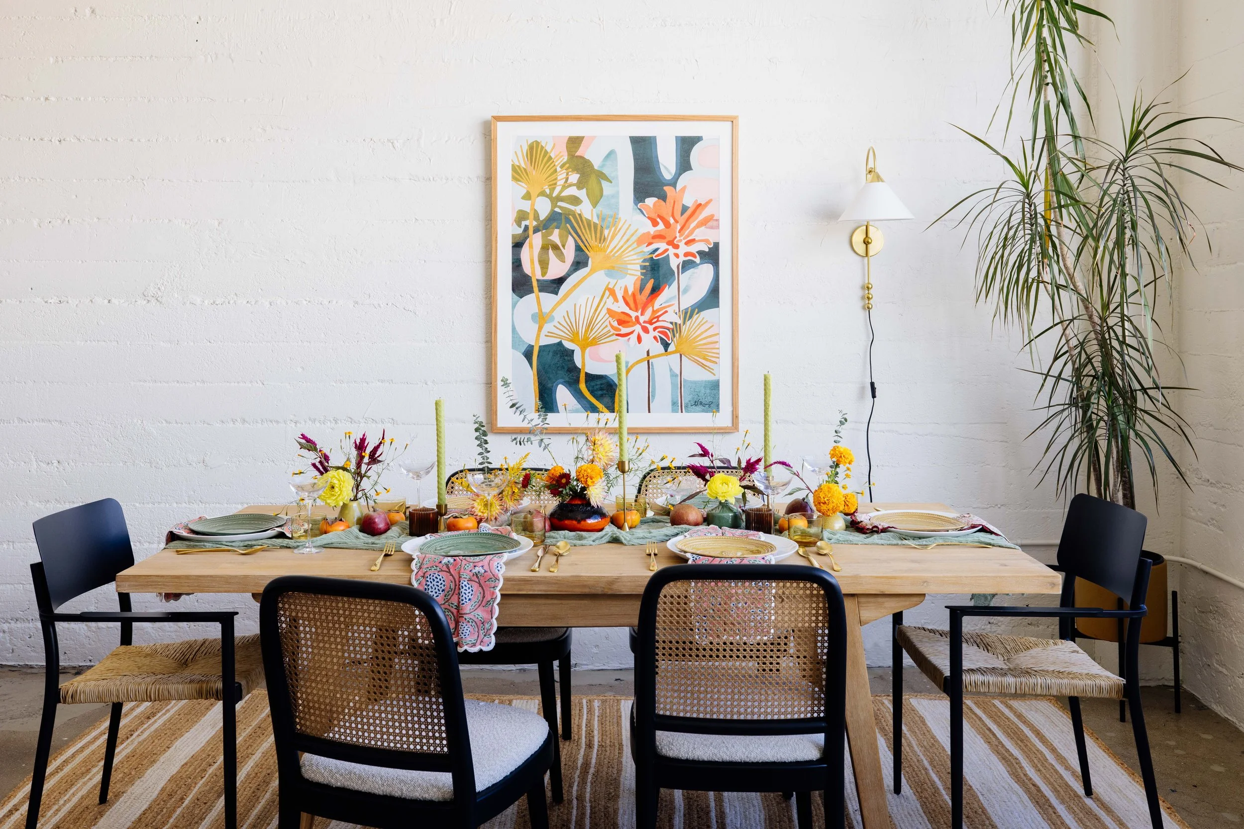 For the tablescape, I started by layering a sage colored cheesecloth runner. Then, lined up five small arrangements I created in bud vases. The flowers were from a local grocery store. I sprinkled the table with some grapes and persimmons. I love mixing edibles and florals together. And then I found these scalloped napkins on etsy to add floral patterns to the mix. All these fun pops of color and patterns work perfectly with the versatile, modern pieces from Castlery. Art by Nancy Ramirez.