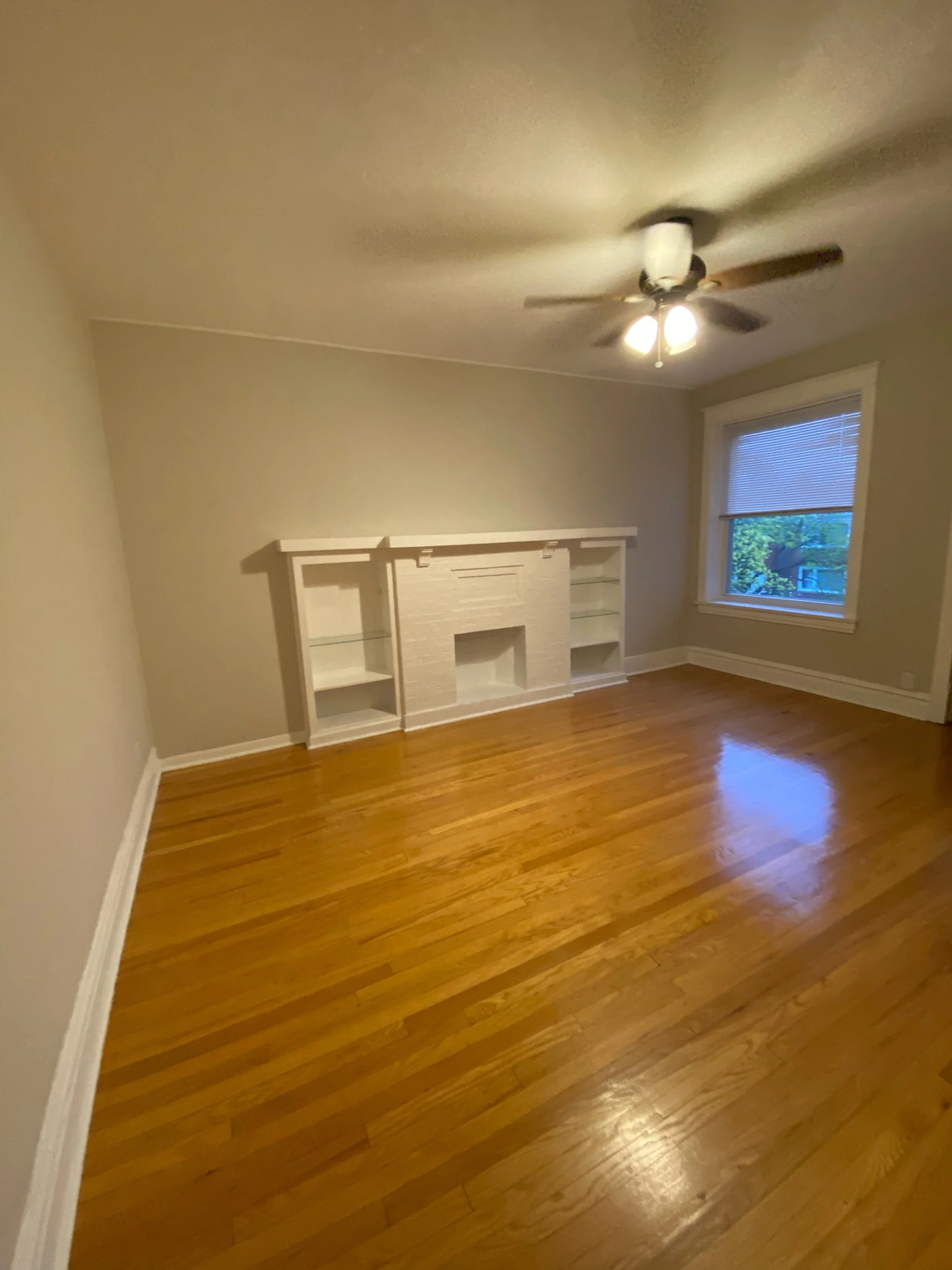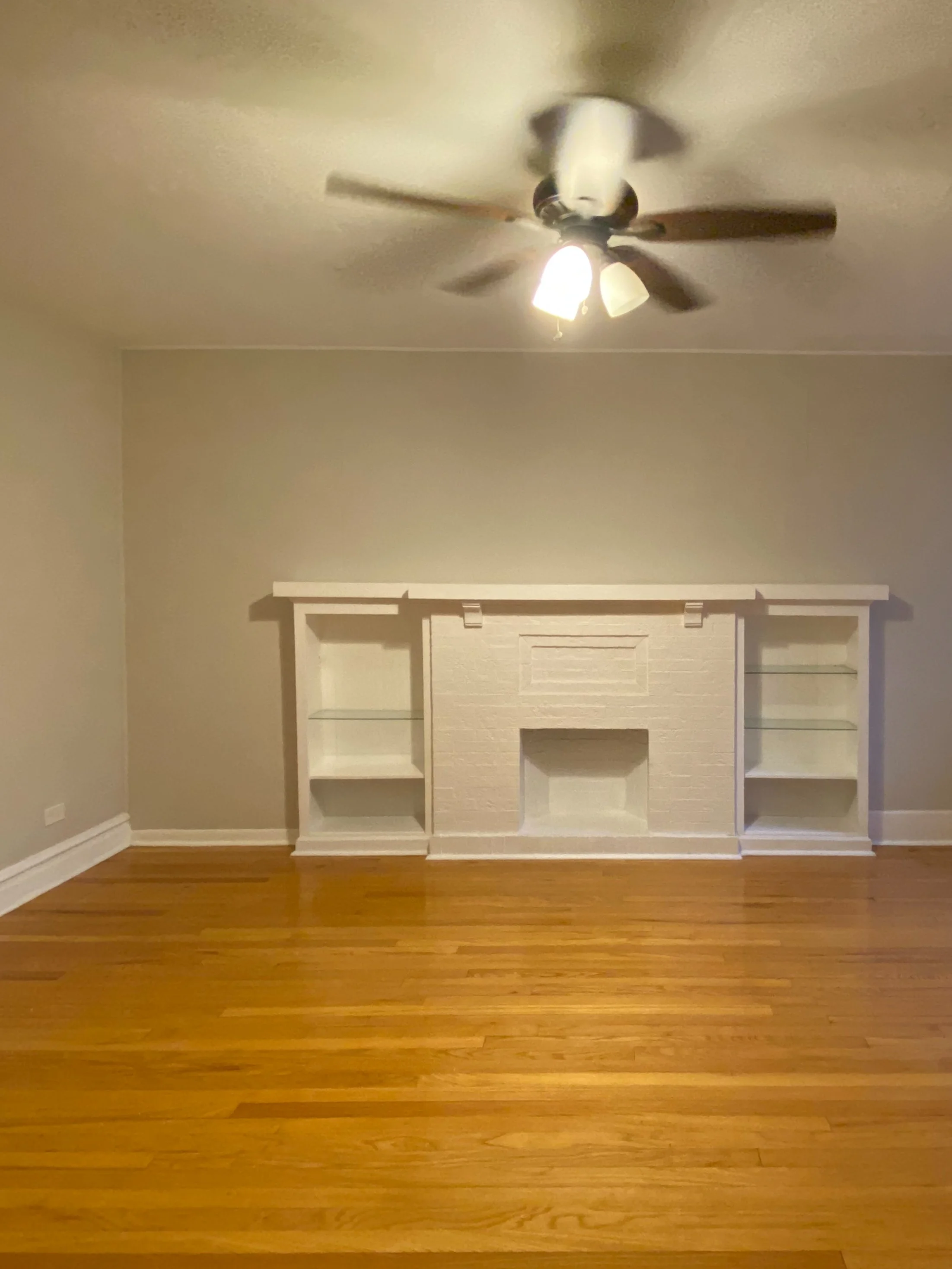 Let’s check out the before space shall we? My friend chose a great space with lots of potential. The living room has gray walls and you all know how I feel about that. She isn’t a fan of the drab color either, nor the ceiling fan. But the space is a good size. It’s about 16 ft x 13 ft. It has original hardwood floors, and a faux brick fireplace with shelving that adds a bit of architectural detail. And since summer is just around the corner I’m going to create a fun, laid back vibe for her. Here are my 6 tips to creating a summery living room for all year round.