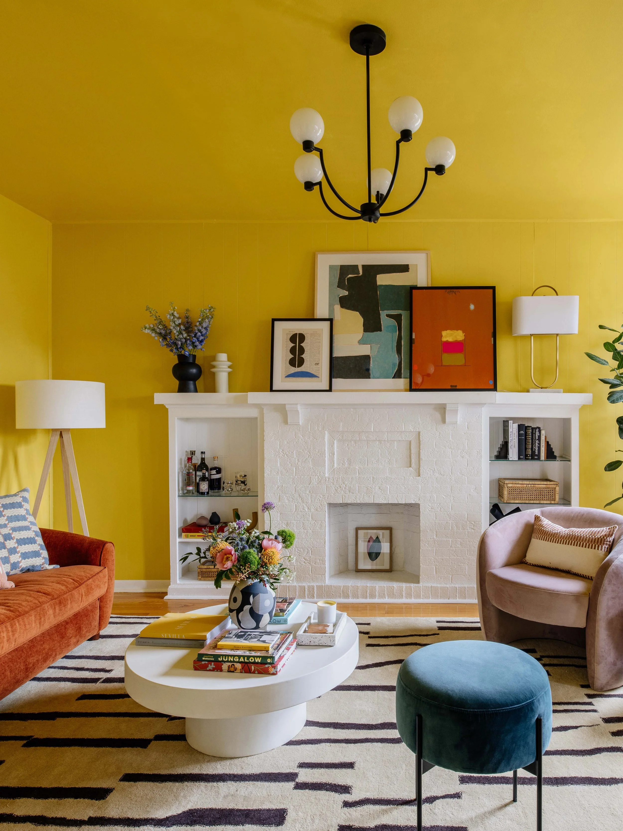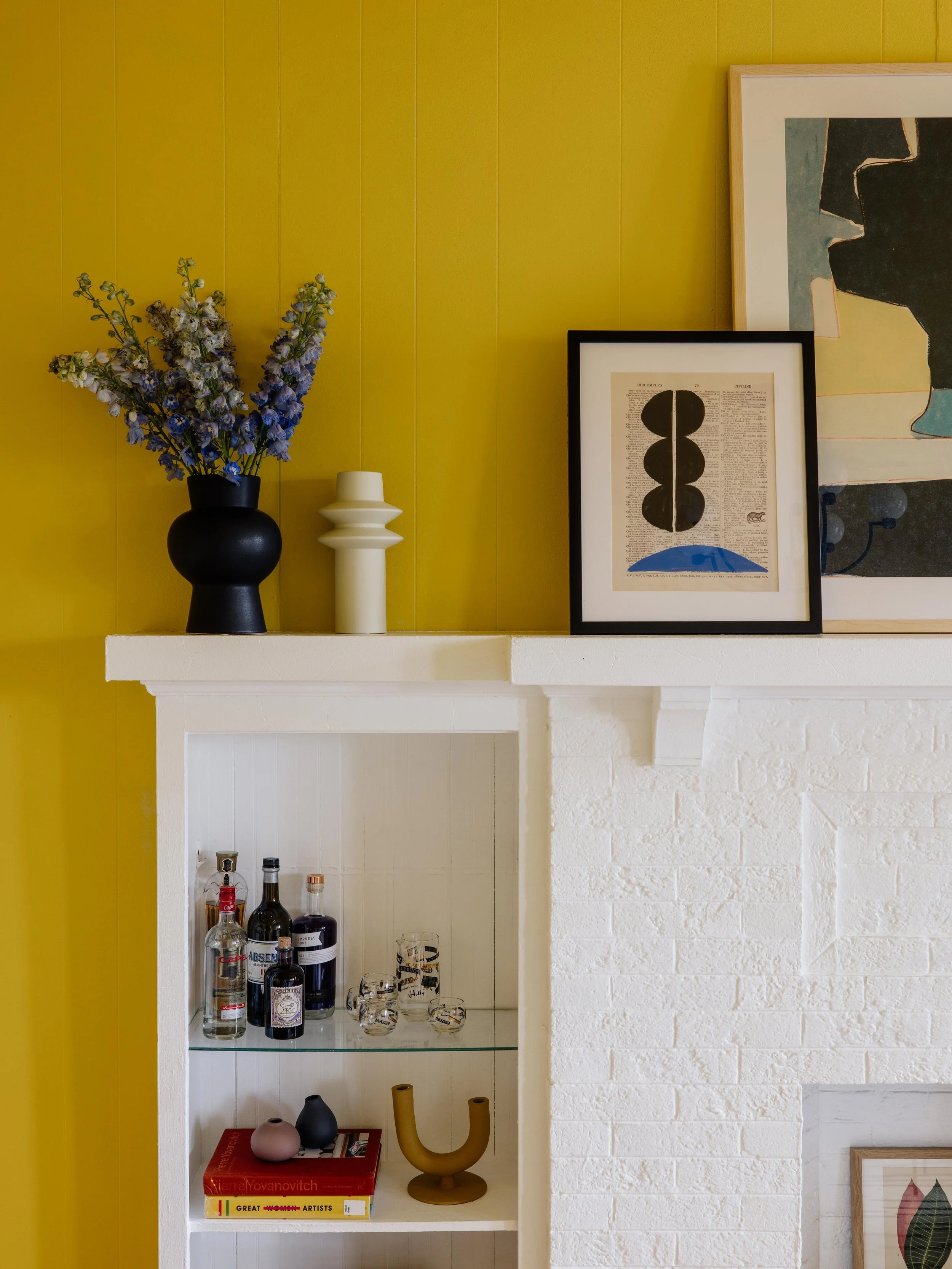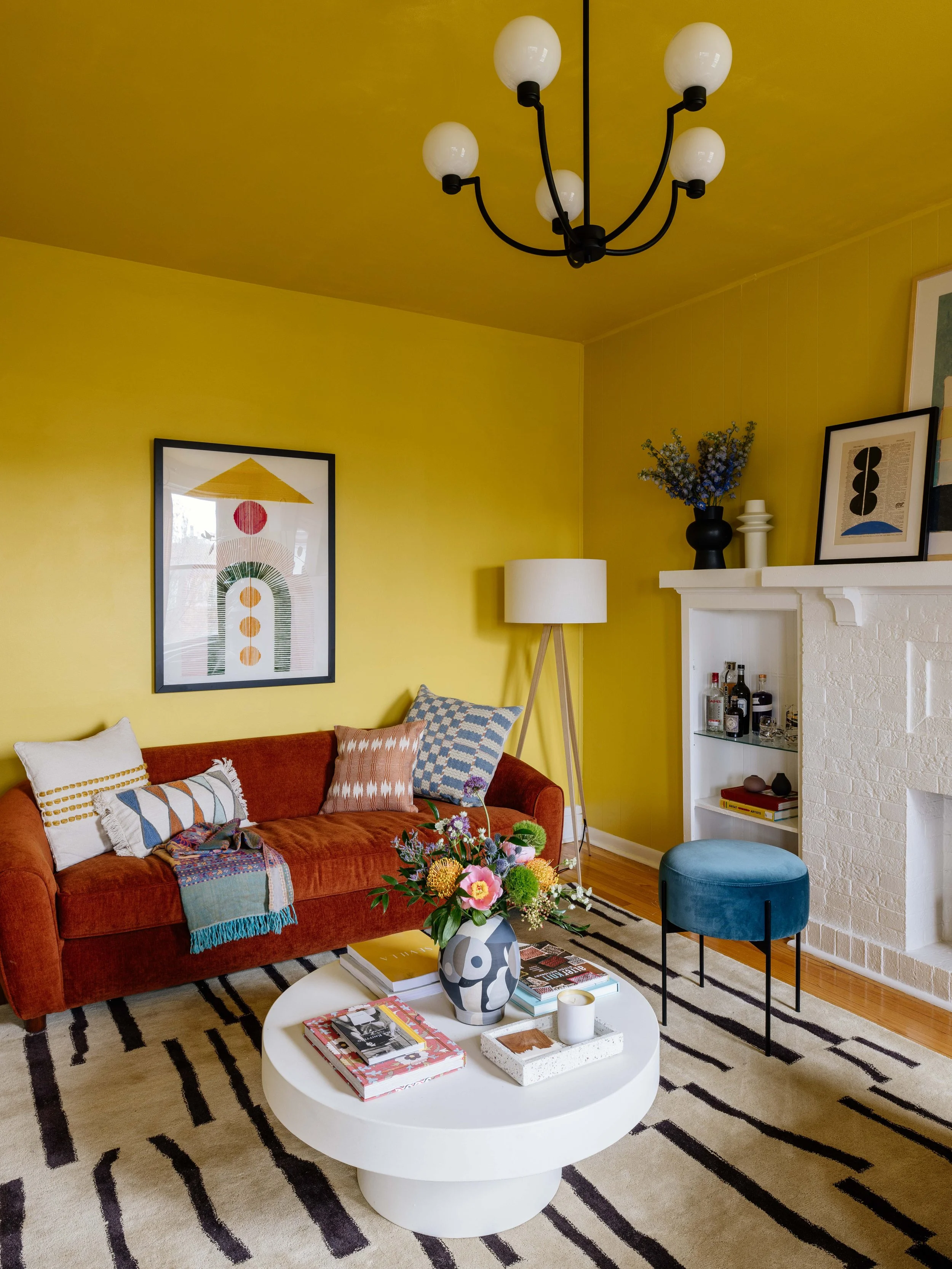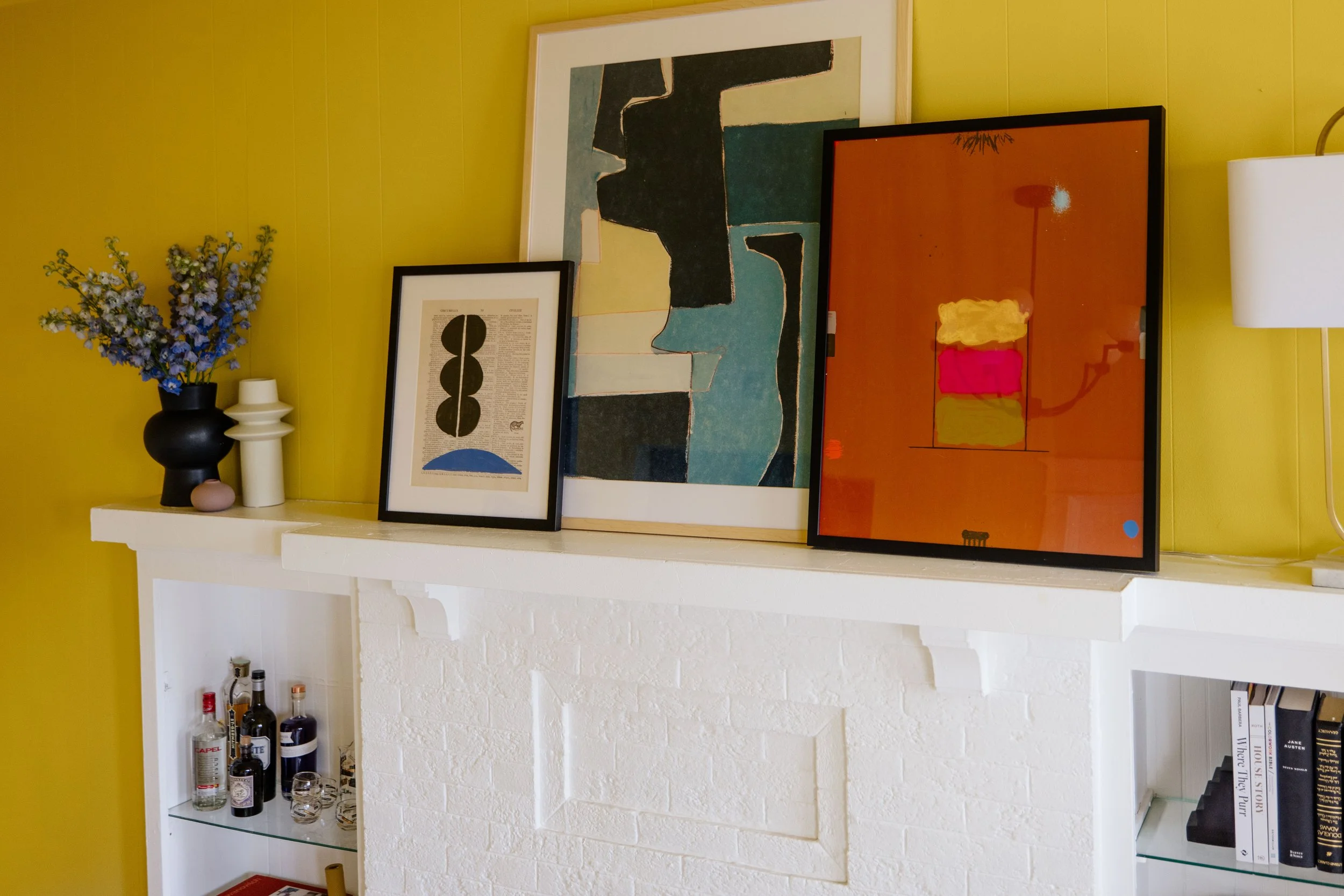 A fun way to achieve the laid-back look is by filling your space with artworks. Instead of hanging the artworks above the mantel, we chose to lean them against the wall for a more casual look. We love the abstract blue print against the yellow wall. And the rust color print ties in with the color of the sofa. Be sure to overlap them in different sizes as well to create variation in height.