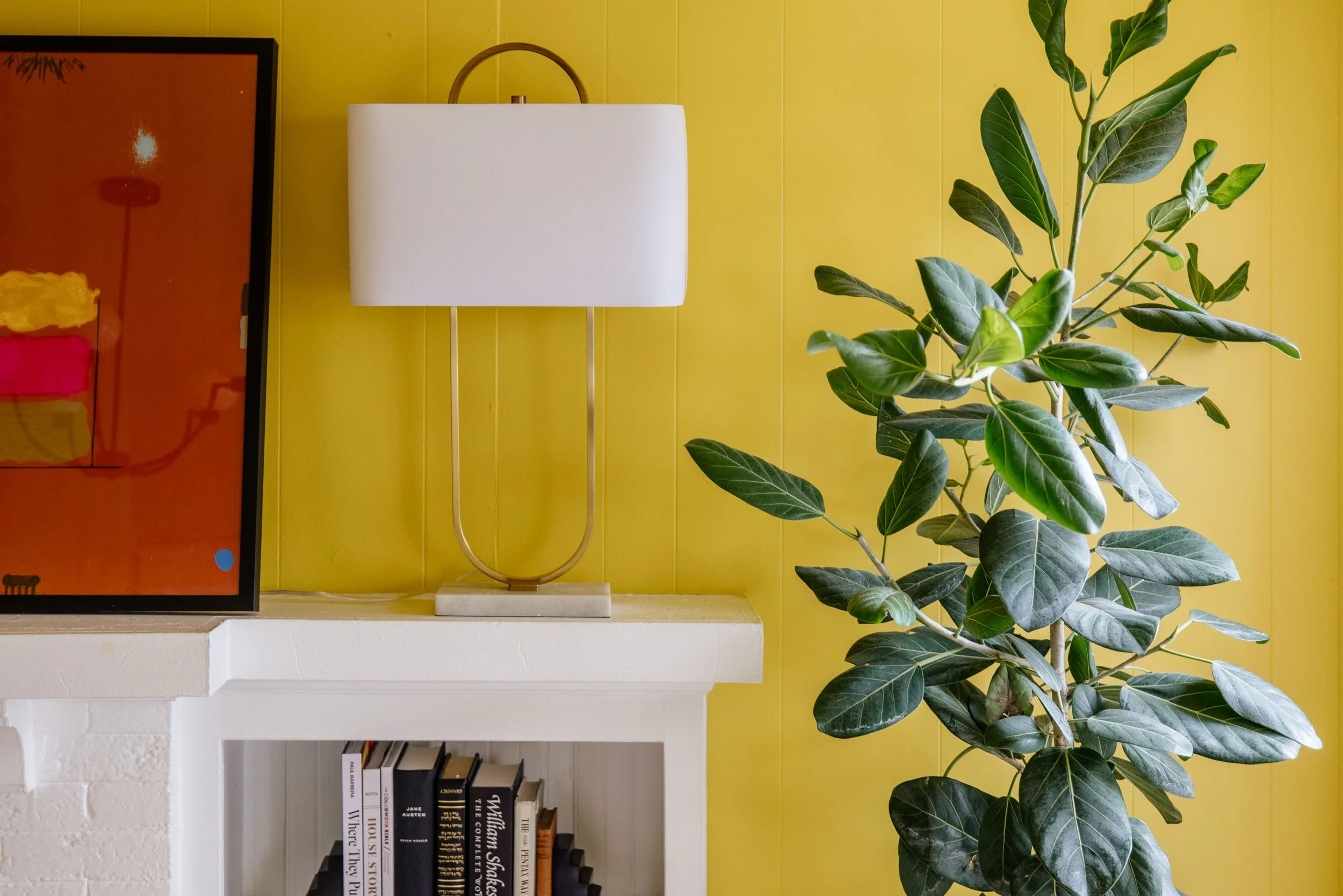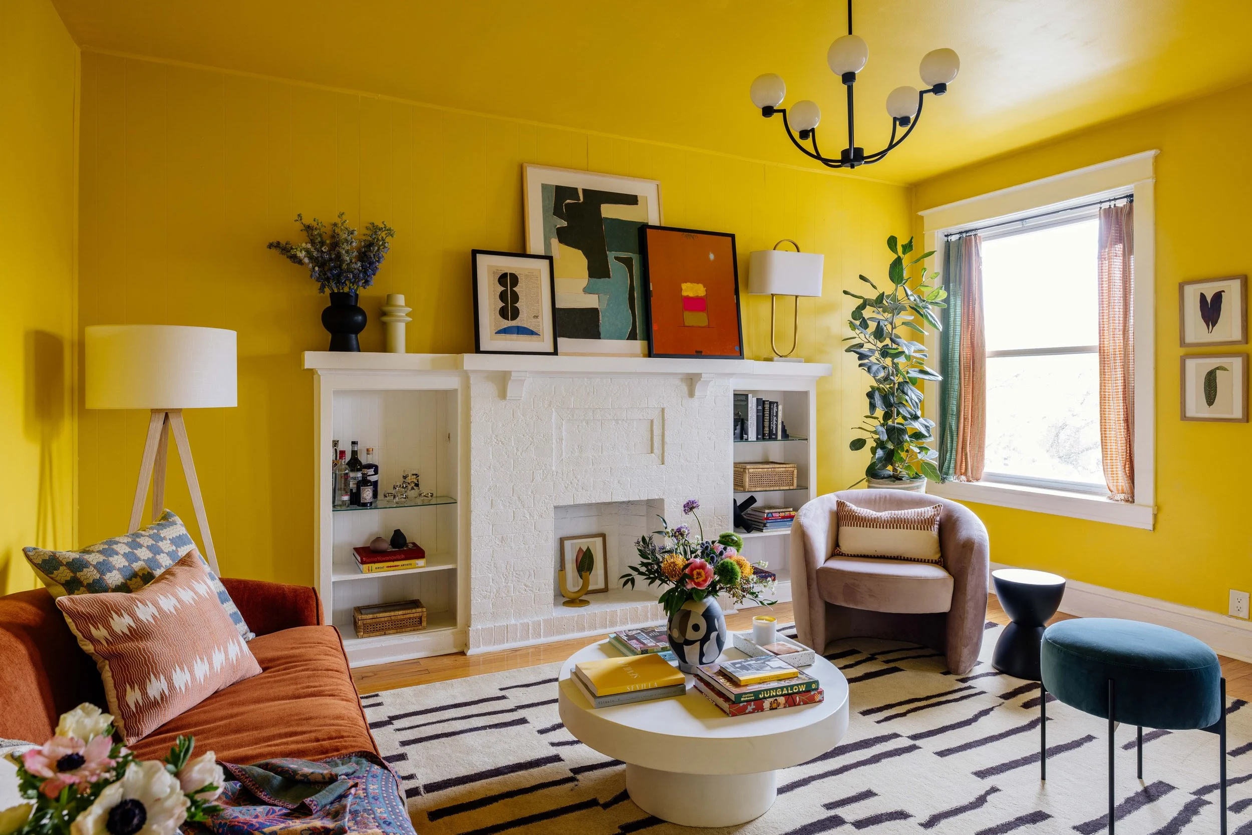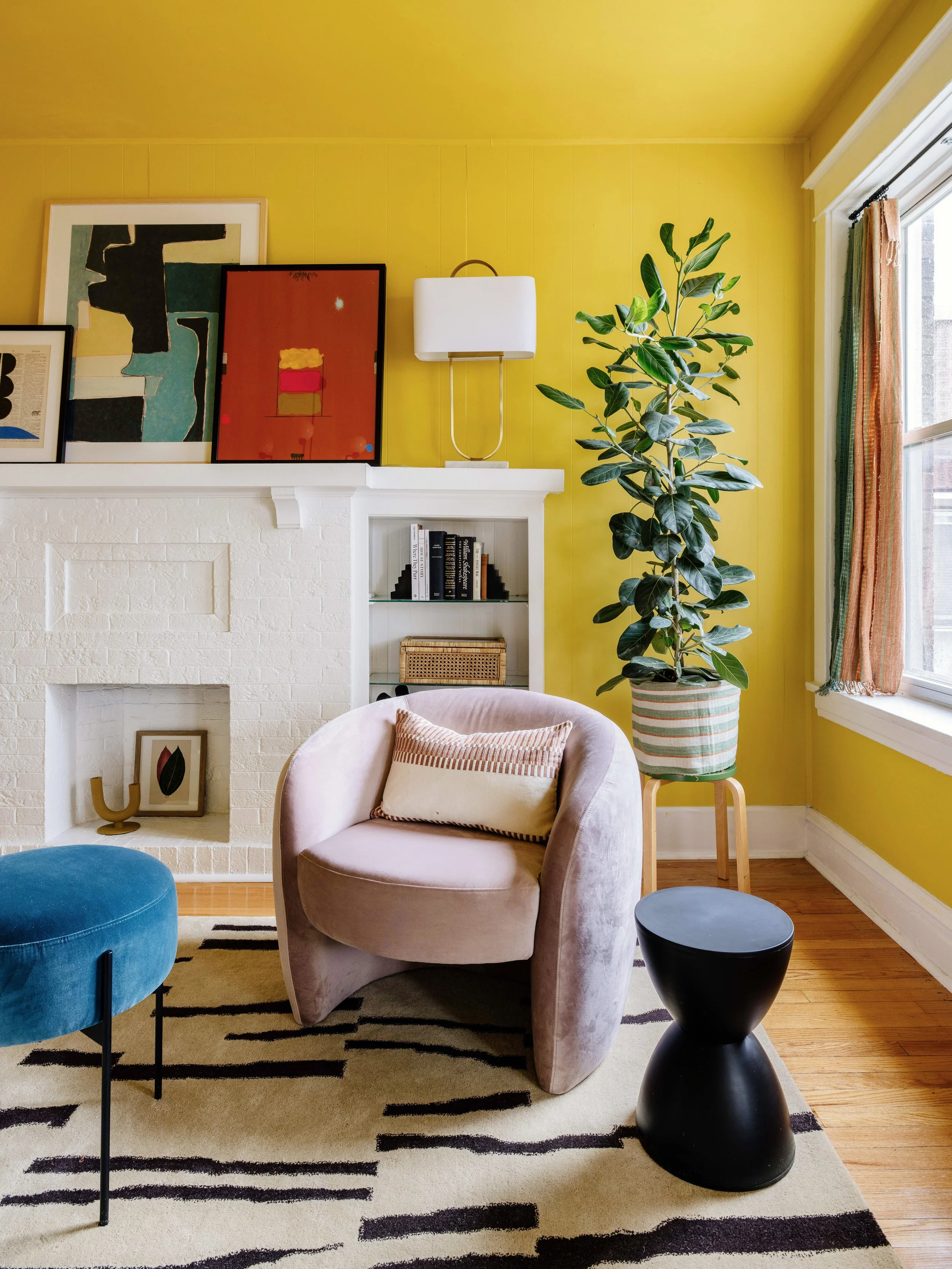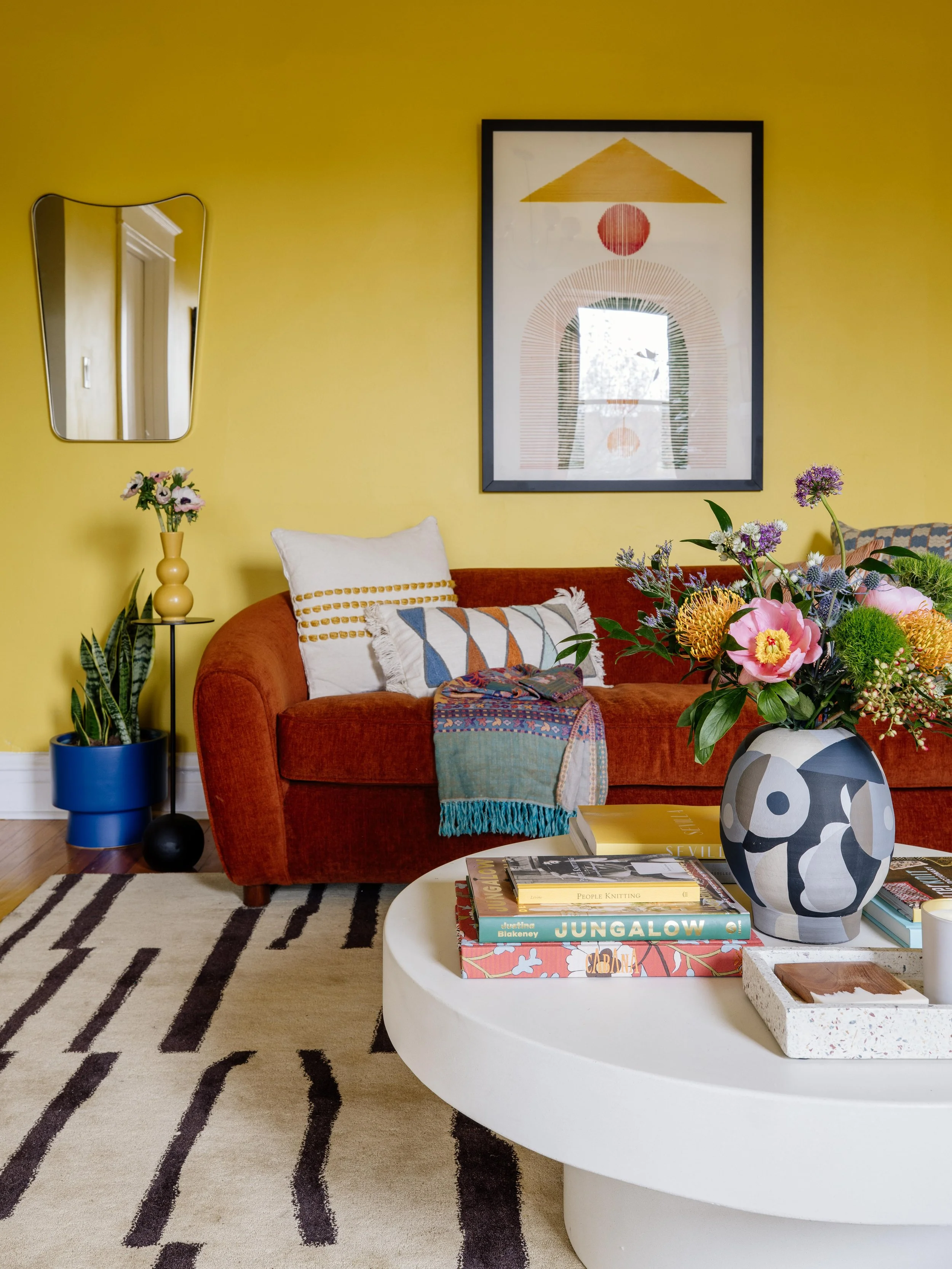 A fun way to achieve the laid-back look is by filling your space with artworks. Instead of hanging the artworks above the mantel, we chose to lean them against the wall for a more casual look. We love the abstract blue print against the yellow wall. And the rust color print ties in with the color of the sofa. Be sure to overlap them in different sizes as well to create variation in height.